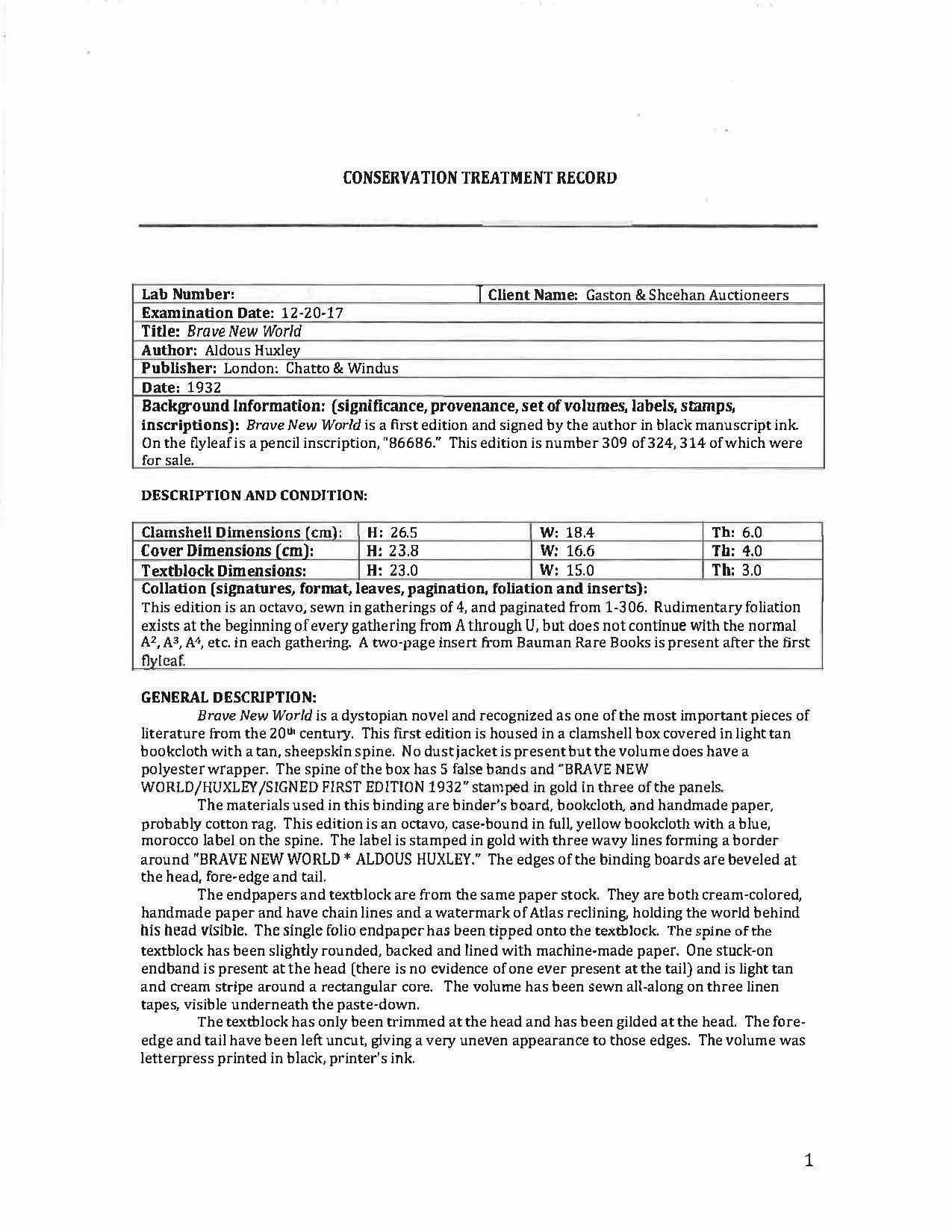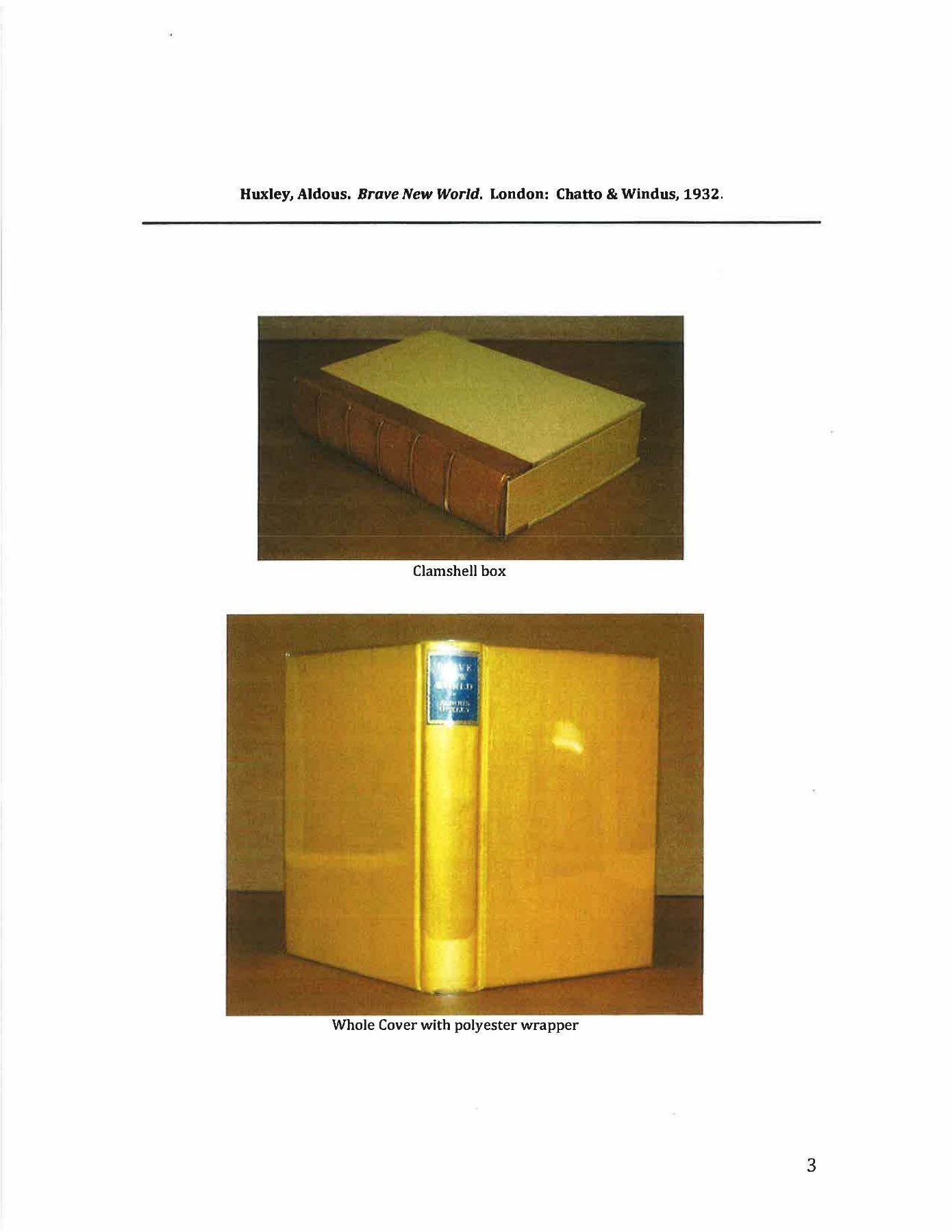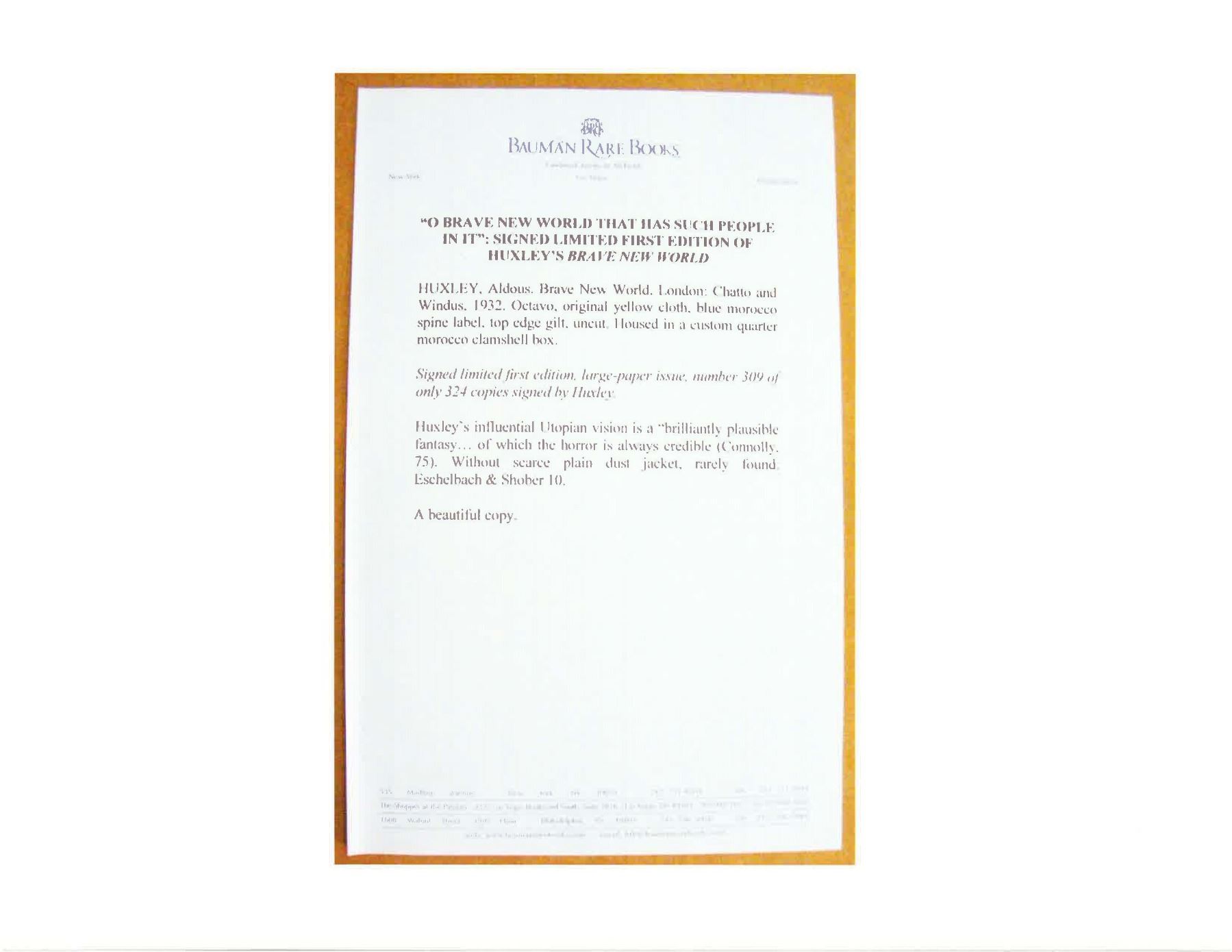 RARE BOOK B: "Brave New World" Chatto & Windus 1932 limited first edition signed by the author Aldous Huxley #309 of an edition of 314, the book has a yellow clothe cover with a blue title badge and gilt lettering on the spine and measures 9.5" h x 6.5" w x 1.5" d. and is cased in a custom clamshell case measuring 10.5" x 7.5" x 2.5". From Bauman Rare Books.
