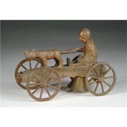 RARE BRASS PATTERN OF THE “CAT AND NEGRO BOY BELL TOY”. Manufactured by N. N. Hill Brass Co. A remarkable and seldom-found pattern of a great toy! One can truly appreciate the toy after viewing this brass pattern and the detailed work. This pattern was used in the manufacture and production of the previous lot. SIZE: 6”. CONDITION: Condition near mint. JL 1-4055 (2,500-3,000)