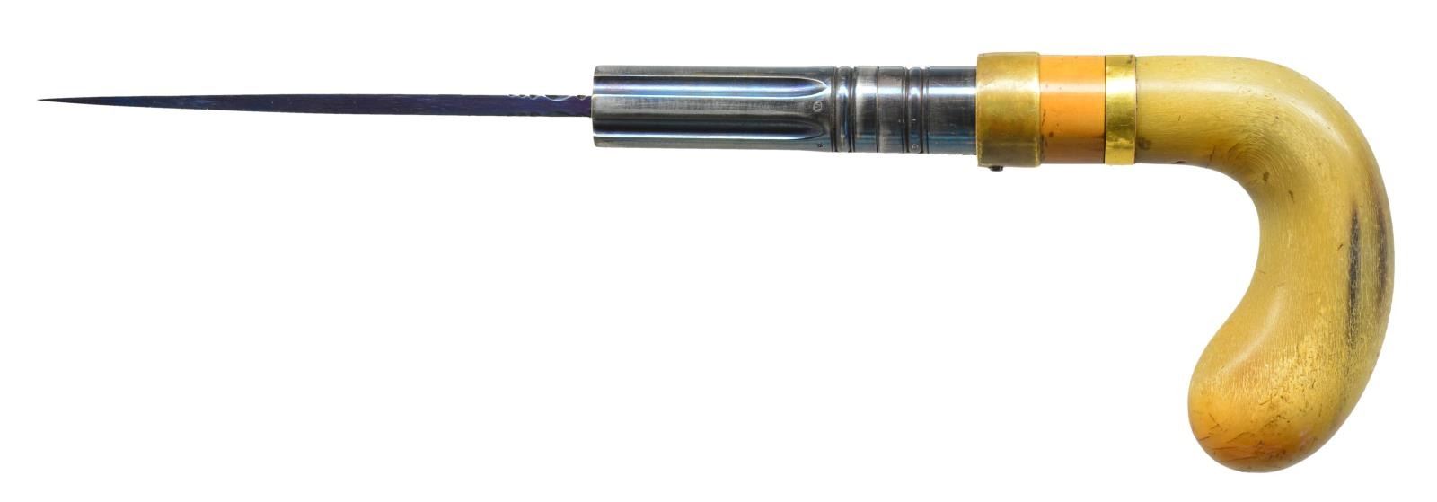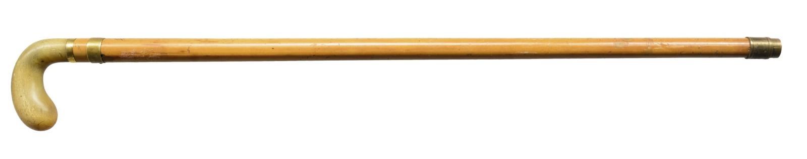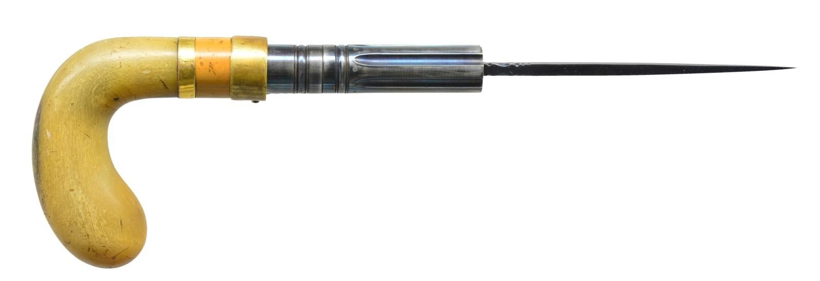 INTEGRAL STILETTO. Cal. approx. 22. NSN. Bbls. approx. 2 1/2". Overall length of cane: 33 3/8". An extraordinary 6 shot pepperbox percussion pistol is housed inside this innocent wooden cane. 6 Approx. 22 cal. rds. are fired simultaneously w/ 1 percussion cap. If the 6 rds. do not do in your assailant, a 5 3/4" square stiletto blade extends from the muzzle of the pepperbox. The pepperbox & stiletto have a blued finish throughout. The cane handle, that also forms the handle of the pepperbox, consists of a lg. shaped horn handpiece w/ 3/4" of wooden shaft flanked by gilded brass ferrules. The top ferrule has a sm. mark that reads, “BRIGG LONDON”. Brigg is an internationally known British cane, umbrella & whip maker renowned for their quality & craftsmanship since 1836. The shaft of the cane is light colored wood, possibly bamboo. The 1 3/8" tip is brass & has turned decoration. CONDITION: the horn handle shows some wear but no damage. The top ferrule retains much of its original gilding whereas the bottom ferrule shows only traces of gilding. The fabulous pepperbox & stiletto retain nearly all of their blued finish showing only slight wear. The cane body shows light wear overall w/ scattered light surface abrasions. (01-18936/BF). ANTIQUE. $3,000-5,000.