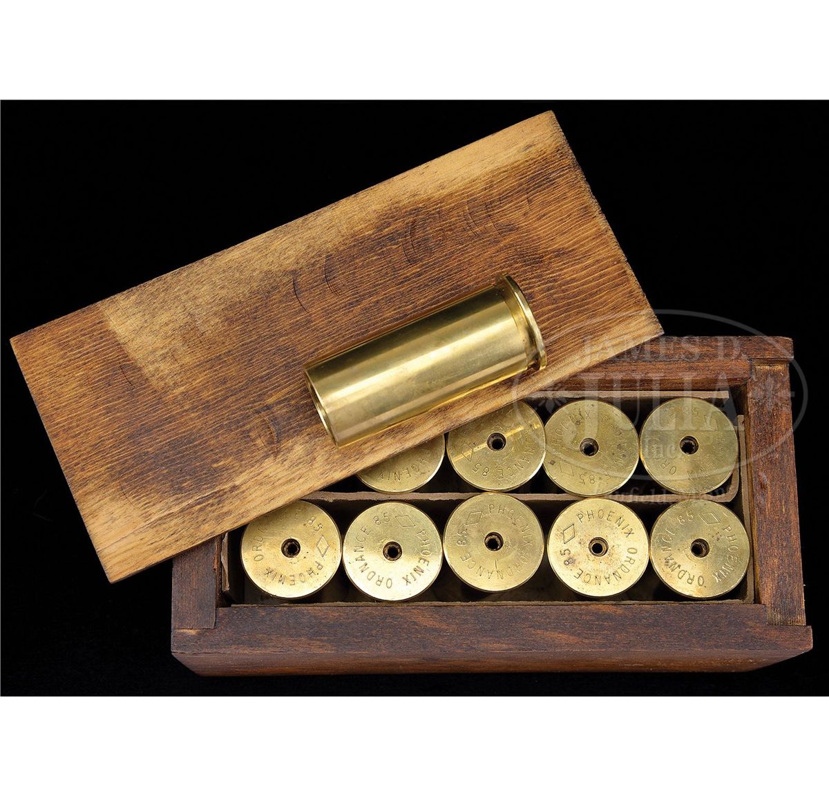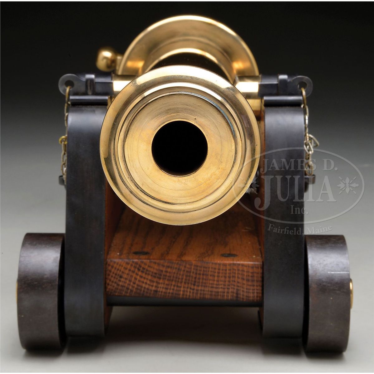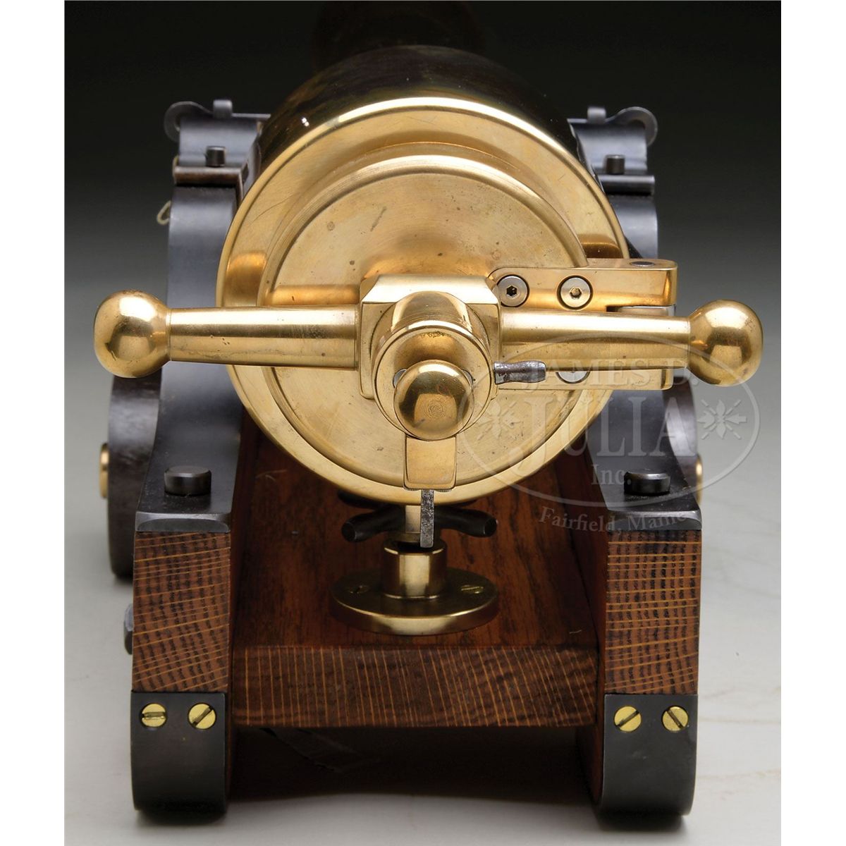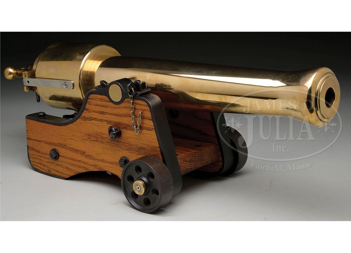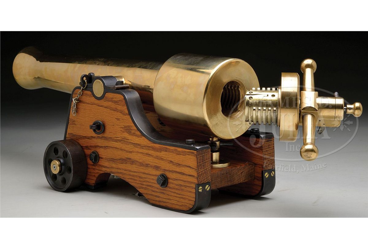 NSN. This well-engineered bronze cannon, which weighs 59.5 lbs including carriage, was made as a working prototype in 1985 by Valley Cannon Works in Tigard, OR for Phoenix Ordinance Company. This cannon is accompanied by ten cased brass reusable shells made for black powder and large rifle primers. This is the only prototype made and it has a flared muzzle like a Model 1857 Civil War field gun and a reinforced breech like on a Parrot rifle. This beautiful tube has an intricate well-machined functioning locking screw breech with functioning safety and integral firing mechanism. Included with this cannon are copies of correspondence concerning manufacture and engineering drawings. Cannon is marked on each trunnion "PHOENIX ORDINANCE 85". The estimated cost of this bronze prototype model for production in 1985 was $4000. CONDITION: Very fine overall. Bronze is still in polish with some minor staining. Steel and wood carriage are sound and solid and fine as made. Mechanically breech and firing mechanism function well. Empty brass is clean and ready for use. Consignor has shot blanks and projectiles out of this gun safely, with great effectiveness and pleasure. 4-49261