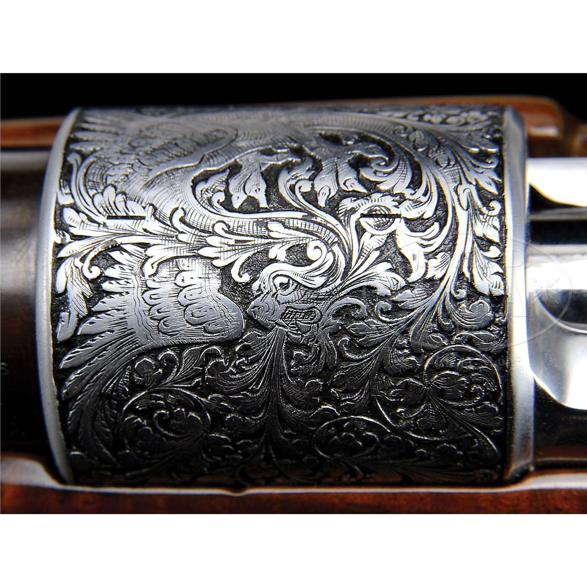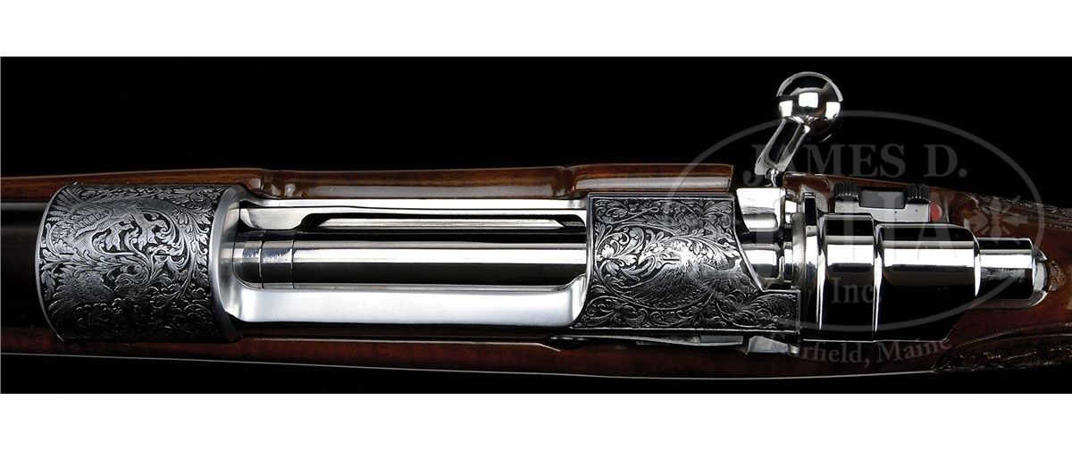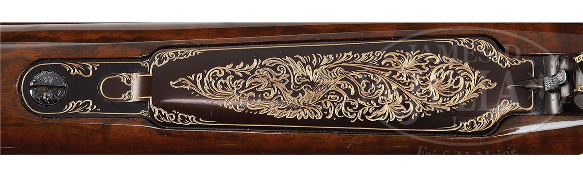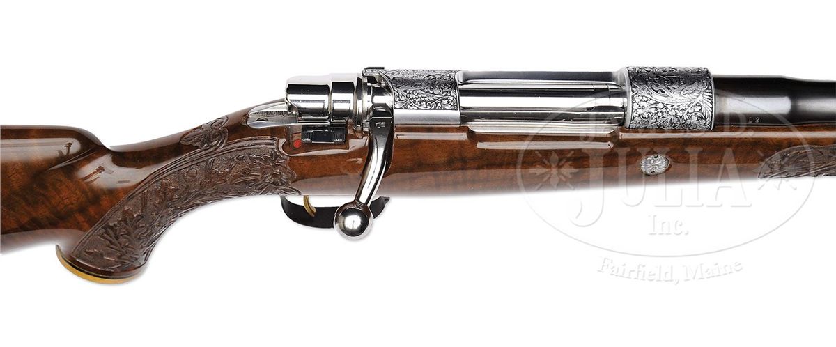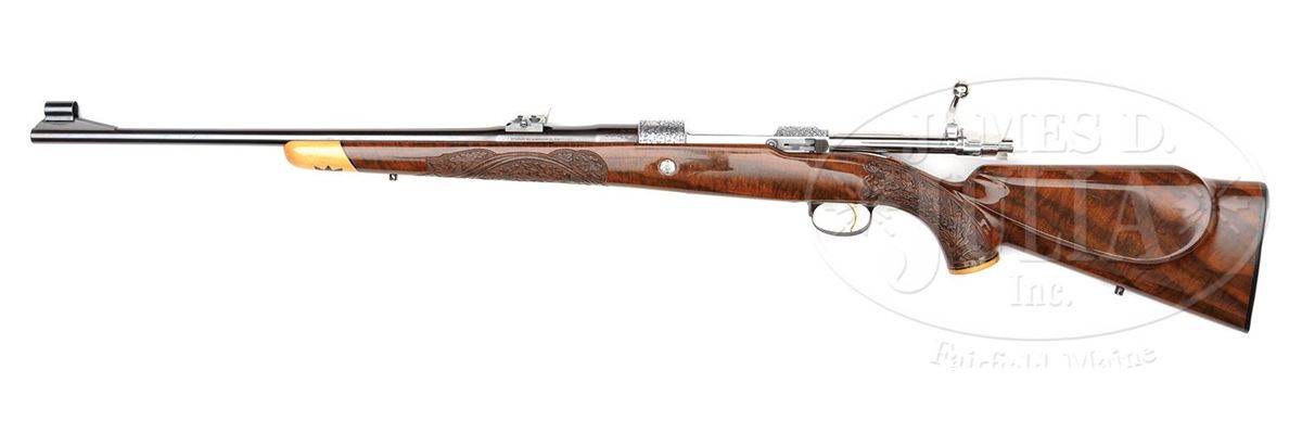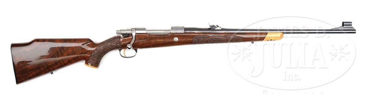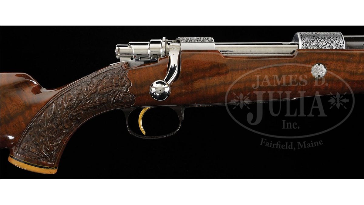 SN L2. Cal. 30-06. 22" Stepped medium contour round bbl mounted with adjustable express rear and matted ramp/ gold bead front sight, with protector, is marked "BROWNING ARMS COMPANY ST LOUIS MO & MONTREAL PQ" on left side under rear sight. Right side has SN and "B. CALIBER .30 ONLY", and "MADE IN BELGIUM". Coin finished action with bright polished bolt is engraved with Felix Funken's classic rendition of scrolled mythological griffins and acanthus in semi-relief, with dark stippled shading on receiver ring and bridge. This dramatic engraving is signed "F. Funken" on terminal flourish of scroll on left rear of action. Black anodized alloy bottom metal has similar engraving patterns, which has been gold filled. Stock of fiddle figured claro walnut measures 13-7/8" over Browning embossed horn buttplate and features large swept Monte Carlo right hand cheekpiece, contrasting holly grip cap and forend tip having inlaid black composition stars, sling eyes, engraved recoil bolt, and full relief carved oak leaves and acorns in the place of checkering at grip and forend. Drop at heel: approx 2-3/8". Drop at comb: approx 1-13/16". Weight: 7 lbs. 10 oz. LOP: 13-7/8". Full length, tan, vinyl Browning case has brass oval on lid marked "Vearl W. Brown His Rifle L-2". Interior is lined in beige faux fur. PROVENANCE: As told in a personal interview with Vearl W. Brown, he began as a Browning factory gunsmith at the "1706 Washington Ave address" on March 21,1961, mounting scopes on FN High Power rifles. Gun "L2" was discovered among shop inventory along with L1 and L3 in plain unmarked cardboard "import boxes". Brown purchased the gun in the early 1960s for $273 and later married a case to it bearing his name. CONDITION: Excellent, retaining essentially all its factory fine metal finish. Gloss varnish of stock has a few minor marks and light rubs. Carving on forend is somewhat darkened. Mechanically excellent, possibly unfired. Case is excellent. These early 1959 vintage L-prefix guns 1-12 were thought to be special promotional or sample guns for the 1961 production Medallion/Olympian grades. 4-48386 MGM94