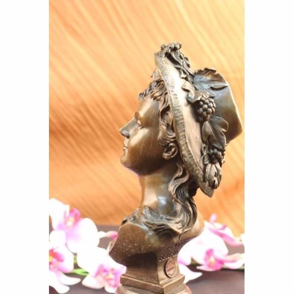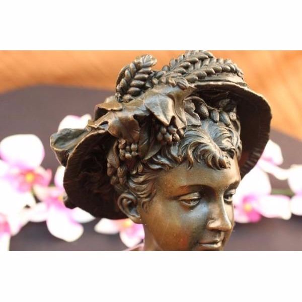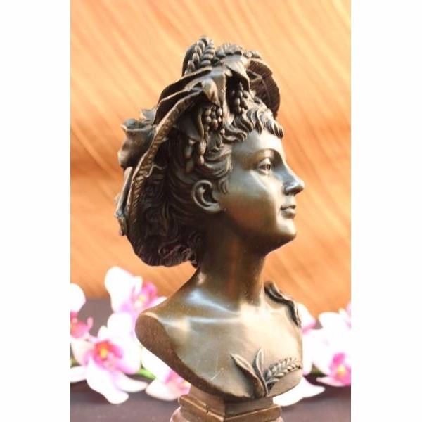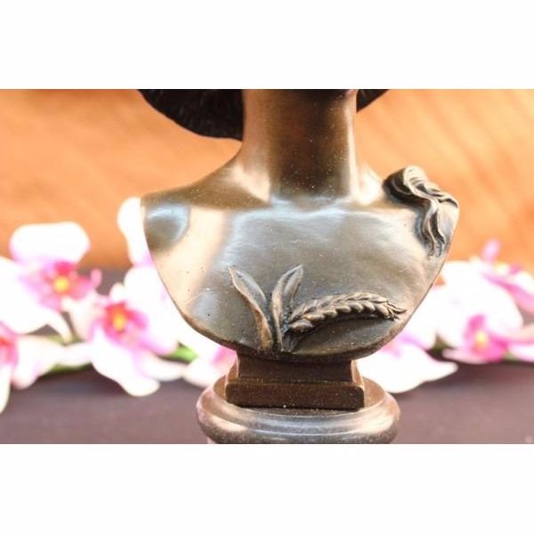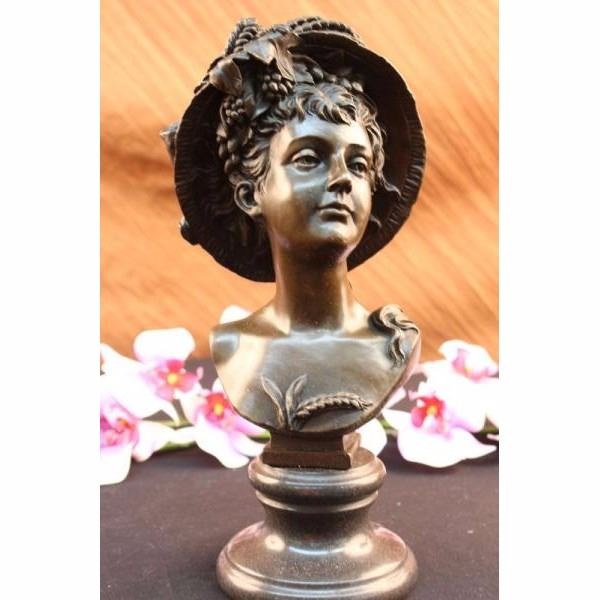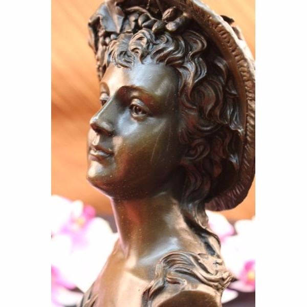 This piece is a bust of a forlorn maiden is exquisite.The details of this piece have been crafted in an extraordinary way that allowedtheviewerto truly bring it to life. The girllooks toher right side in deep thought, possibly thinking about her long lost love. She has herhair down in a manner that only allows a few strands of her hair to rest on her chest and the rest is pulled really high up inamazing curls, thus drawing more attention to the beauty of her face. We only catch a glimpse of the designs on her bare body. This is the epitome of what it means to find beauty in simplicity. Cast in bronze, set atop a black marble base and is signed Carrier Belleuse. This piece is a must-have that will surely be treasured for years to come, featuring the lost wax method of casting, founded thousands of years ago ensuring an exquisitely detailed sculpture that will add grace and beauty to your business or home. Condition: This sculpture is in perfect condition. Bronze Dimensions with Marble Base:Height 10 1/2" x Width 5 1/2" Marble Dimensions: Diameter 3" Height without base: 8" Weight : 7 LBS Inventory : 32B7933823