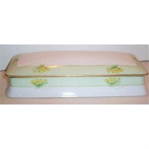 This fantastic and quite RARE Porcelain Covered Bavarian Glove Box is decorated with sweet yellow buttercups and then trimmed with a light green border on a pure white porcelain background. The glove box is in SUPERIOR condition with no chips, cracks, dings or hairlines and it measures 5" wide and is 11" long and stands 2.50" tall. It is marked on the bottom with the familiar Bavarian Logo.