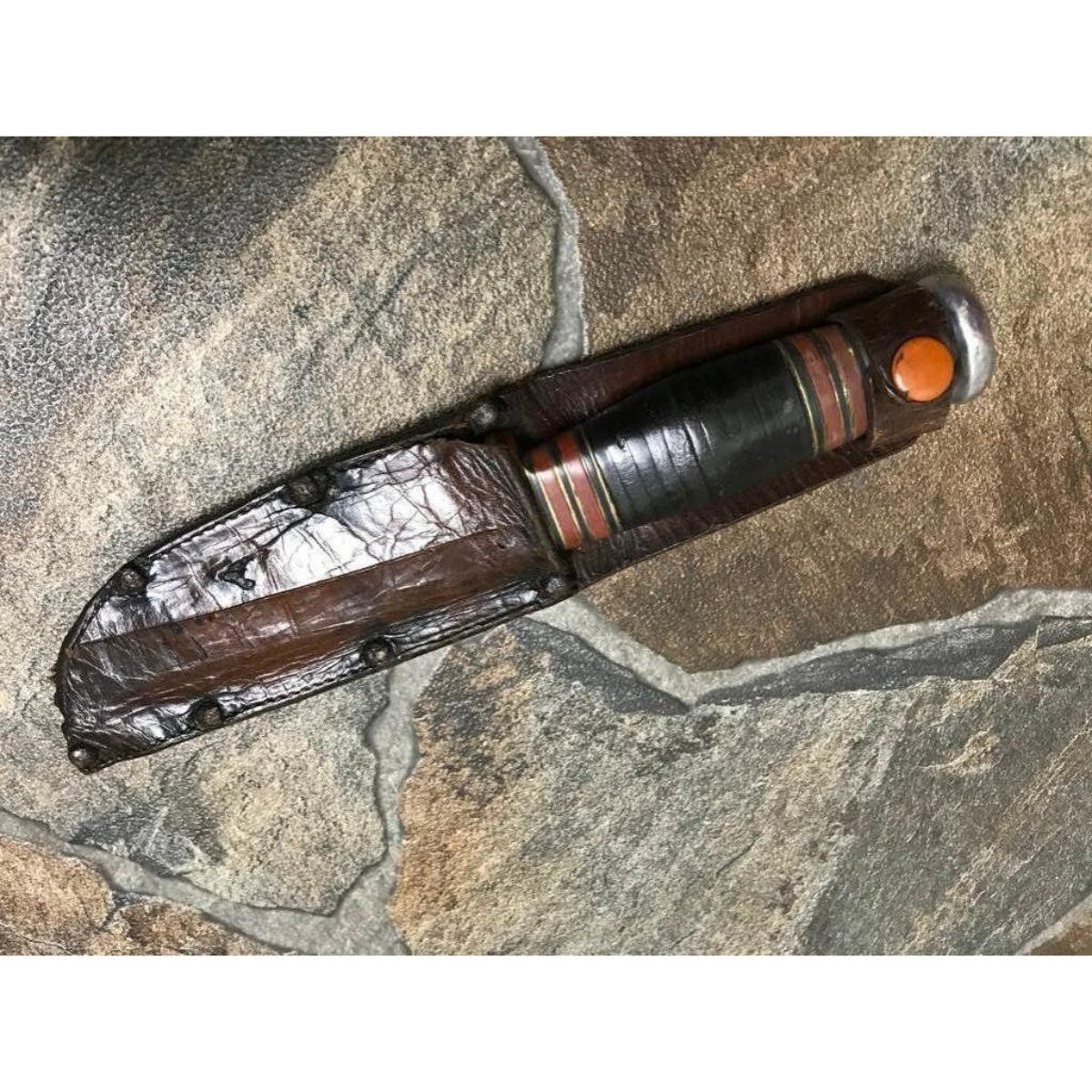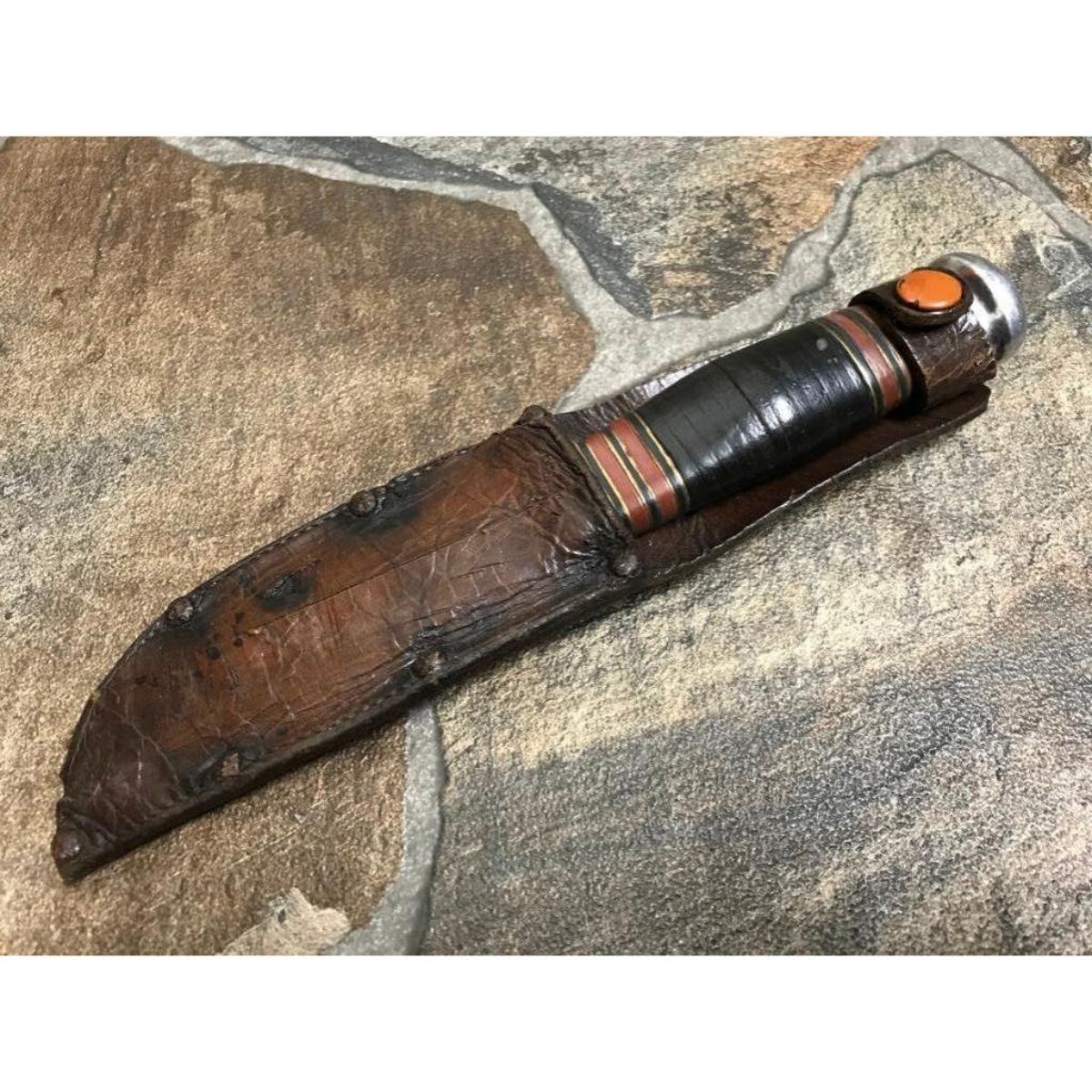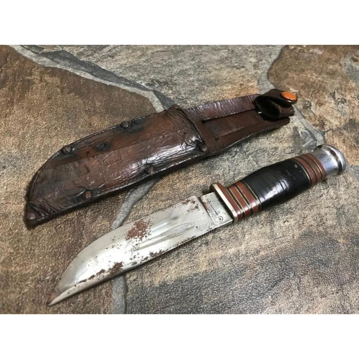 Rare British Wade & Butcher Sheffield, England Fighting Knife with leather sheath. 4 1/2" blade length. Overall length 9".