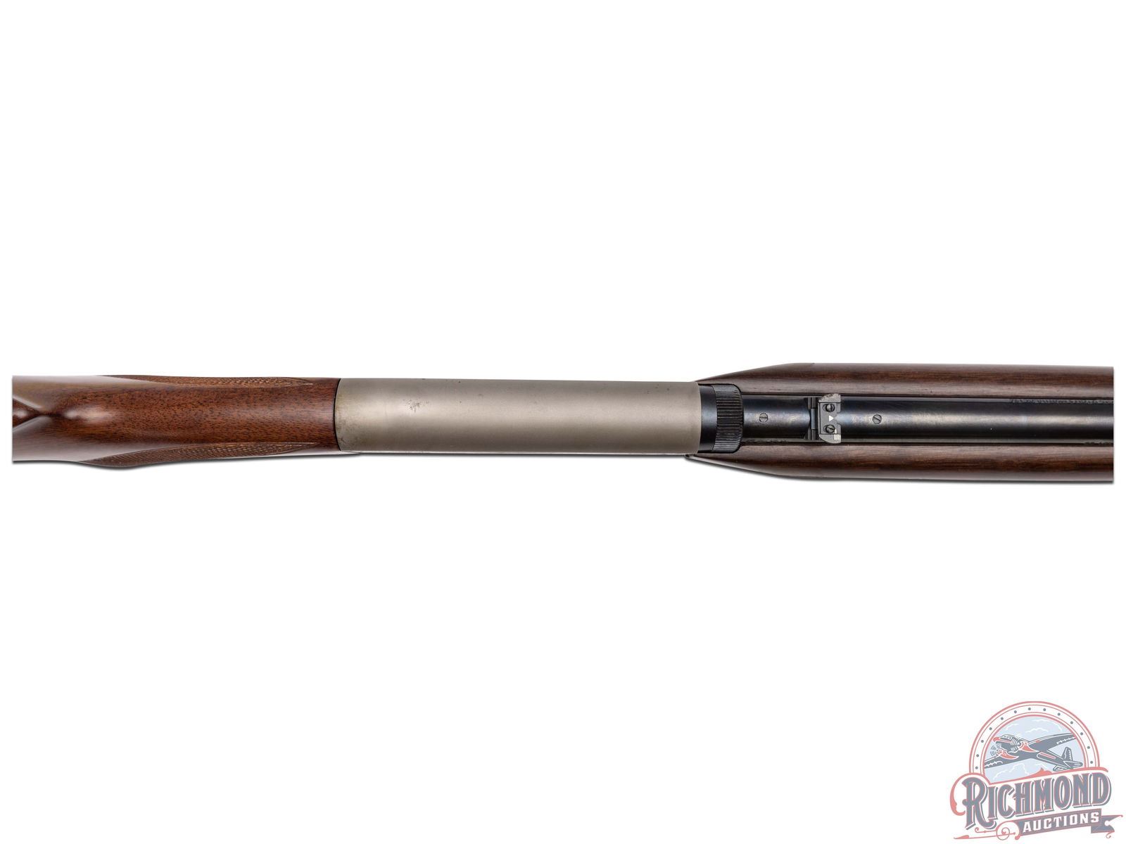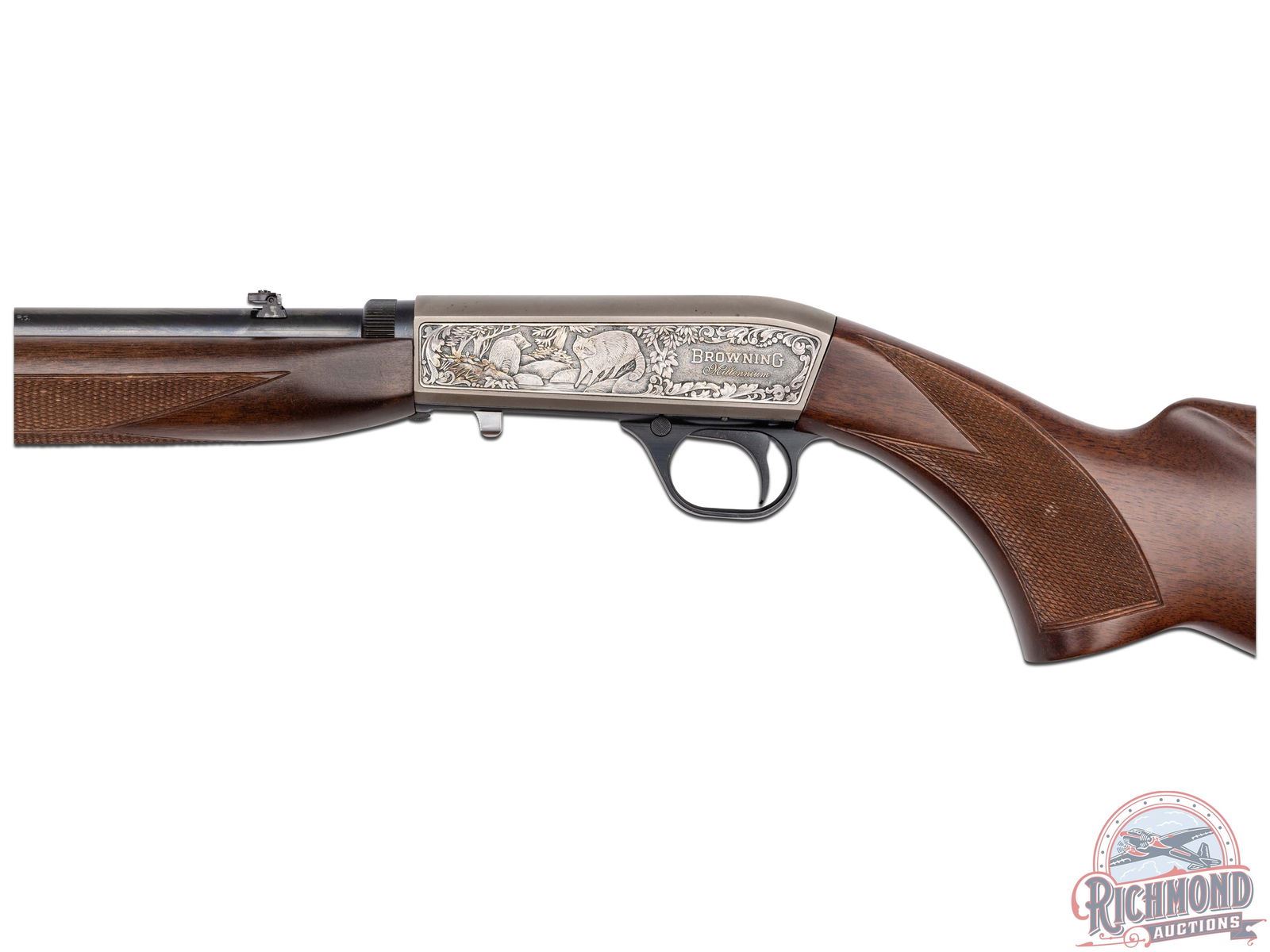 Manufactured in 2000, it is number 76 of only 100 of these Belgium custom shop guns made. Features a 21-1/2" blued barrel with rear flip-up adjustable notch sight and blade with brass bead front sight. Factory drilled and tapped for optics. Beautiful custom shop engraving on the coin finished receiver. Left side features two raccoons in a wooded rocky stream scene and to the right the wording "BROWNING / MILLENNIUM" is surrounded by a floral scroll design. Right side of the receiver features two fox in a woodland scene bordered by floral scroll engraving. Signed "R.CAPECE", for master engraver Rocco Capece below the walking fox. Blued trigger guard with crossbolt safety and gold tone Browning buck logo on the bottom. Satin walnut stock with side loading magazine and steel serrated butt plate. Hand checkered pistol grip and forearm. Comes in a factory Browning Custom Shop velvet lined, canvas and leather case with factory paperwork. CALIBER: 22 LR. S/N: 146MIL076. FFL STATUS: Modern.