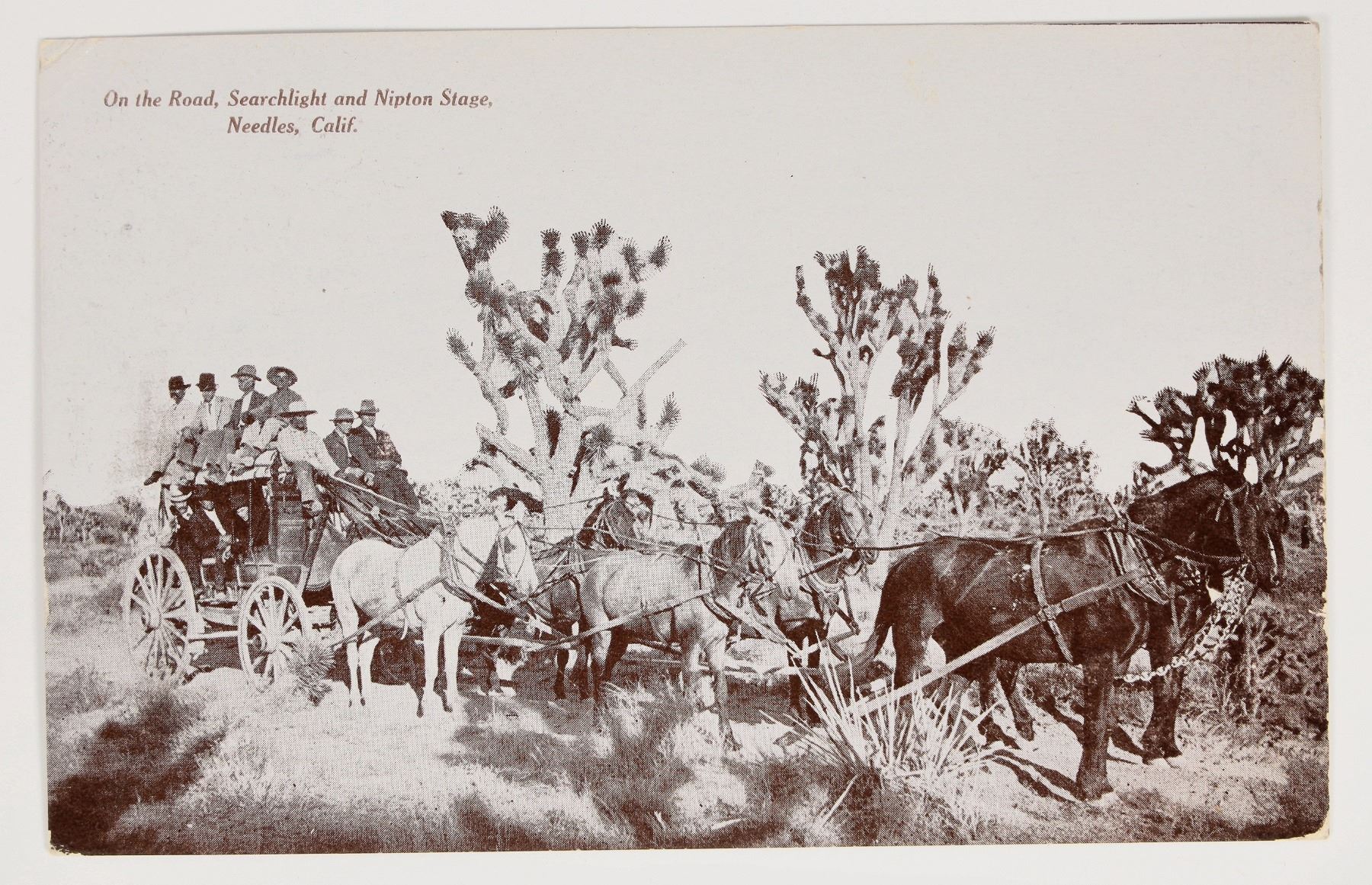 The Searchlight-Nipton stage line started back in 1904, linking up with the booming mining town of Searchlight, Nevada. It was a key route for hauling freight and taking folks to nearby towns. Around 1905, they also began running to Nipton, California, around the same time the San Pedro, Los Angeles, and Salt Lake Railroad showed up. But as cars became more popular and the Searchlight mining district shut down, the stage line lost a lot of its importance. By the late 1910s and early 1920s, stagecoach travel in these remote parts of Nevada basically came to an end. This is a RARE postcard showing stage line between Searchlight, Nevada and Nipton, CA, which ran until c1926. Postcard stamp shows it was sent in December of 1928, wishing a Happy New Year. Postcard measures 5.5x3.5".