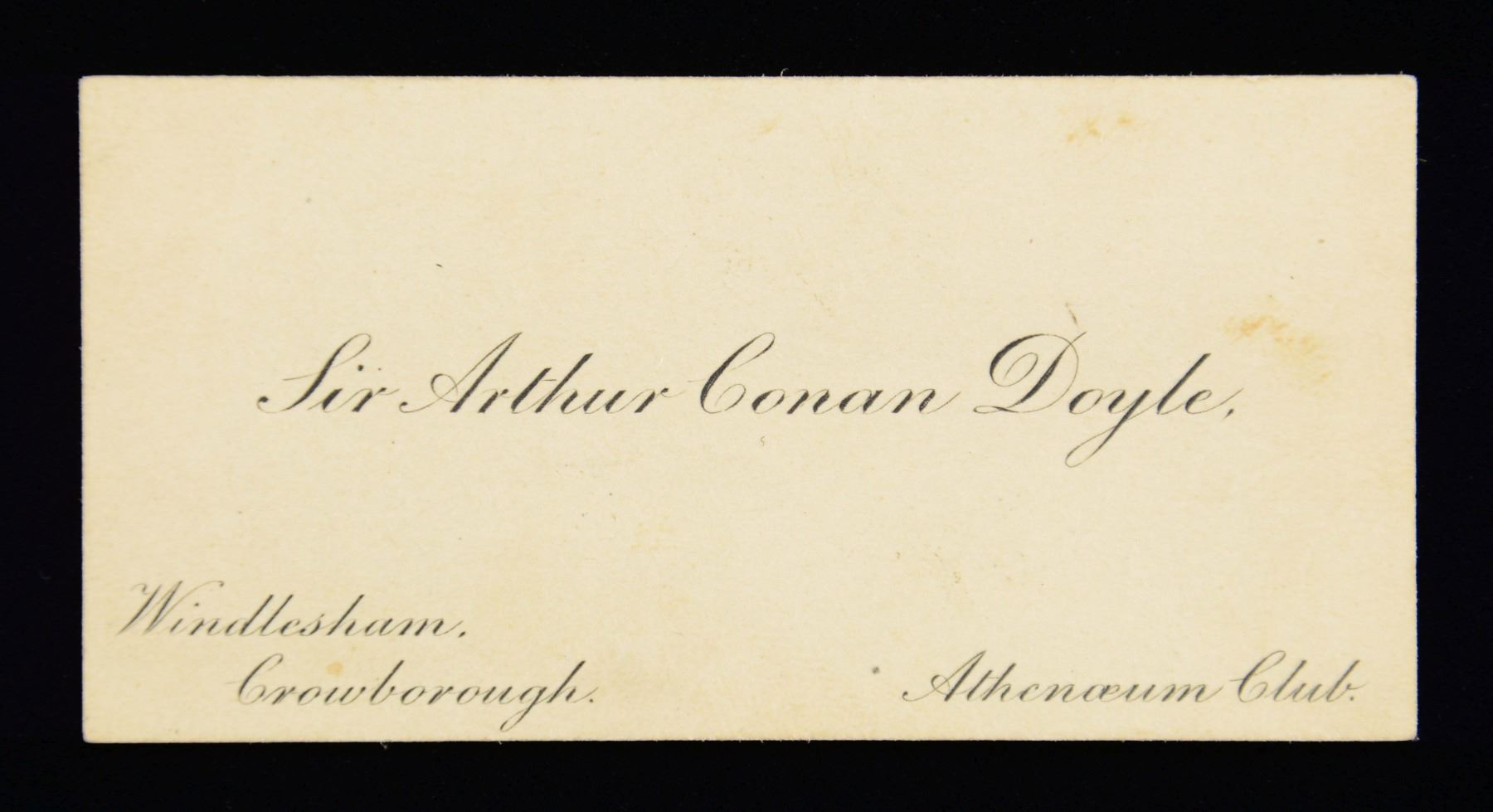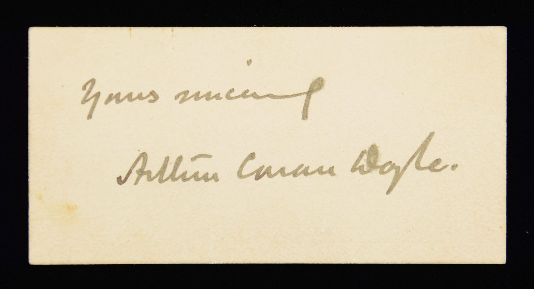 CONAN DOYLE. This desirable autograph is on the back of a calling card that reads "Sir Arthur Conan Doyle, Windlesham. Crowborough. Athenaeum Club." The reverse of the card was signed by Doyle in a rarely seen full signature that reads "Yours sincerely Arthur Conan Doyle." Of course, Arthur Conan Doyle was the creator of the Sherlock Holmes character and publications, including books as well as numerous short stories. CONDITION: the card itself is undamaged and shows only slight yellowing. Printing on the front is clear, and the signature on the reverse remains quite bold. (02-23298-1/BF). $1,000-3,000.