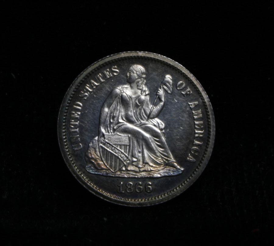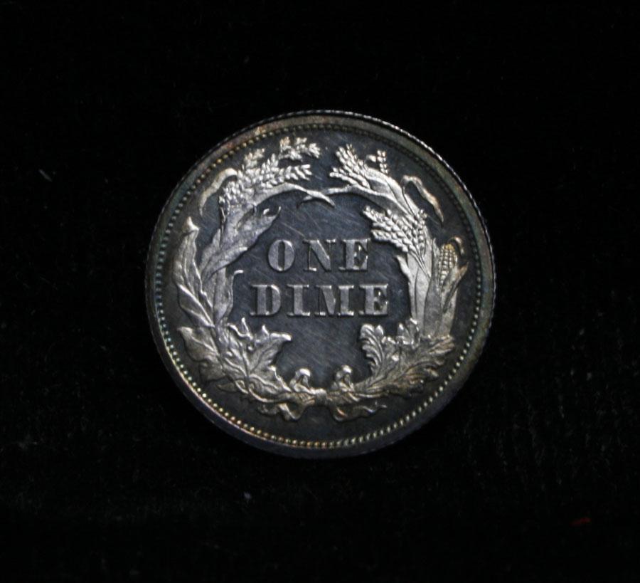 Stunning Cameo example, with some fantastic blue and yellow toning on the bottom of the Obverse. Vastly superior eye appeal. Fully Gradable. I will offer my personal buy back guarantee, that this coin is all original and will not come back Ungradeable by any major grading service. Very scarce Proof Liberty Seated Dime. PCGS lists only 60 estimated surviving coins in ms65 and higher. Only 725 ever minted. A VERY LOW MINTAGE FOR THE LIBERTY SEATED PROOFS! PCGS has only ever graded 31 coins either Cameo or Deep Cameo. in ms65 Cameo and Deep Cameo they have only ever graded 11 coins! This is an awesome example. VERY RARE! PCGS List ms65 CAM at $2600 Estimated Value $2000