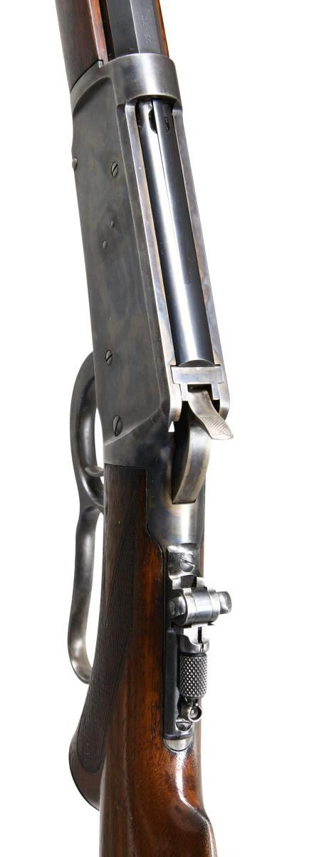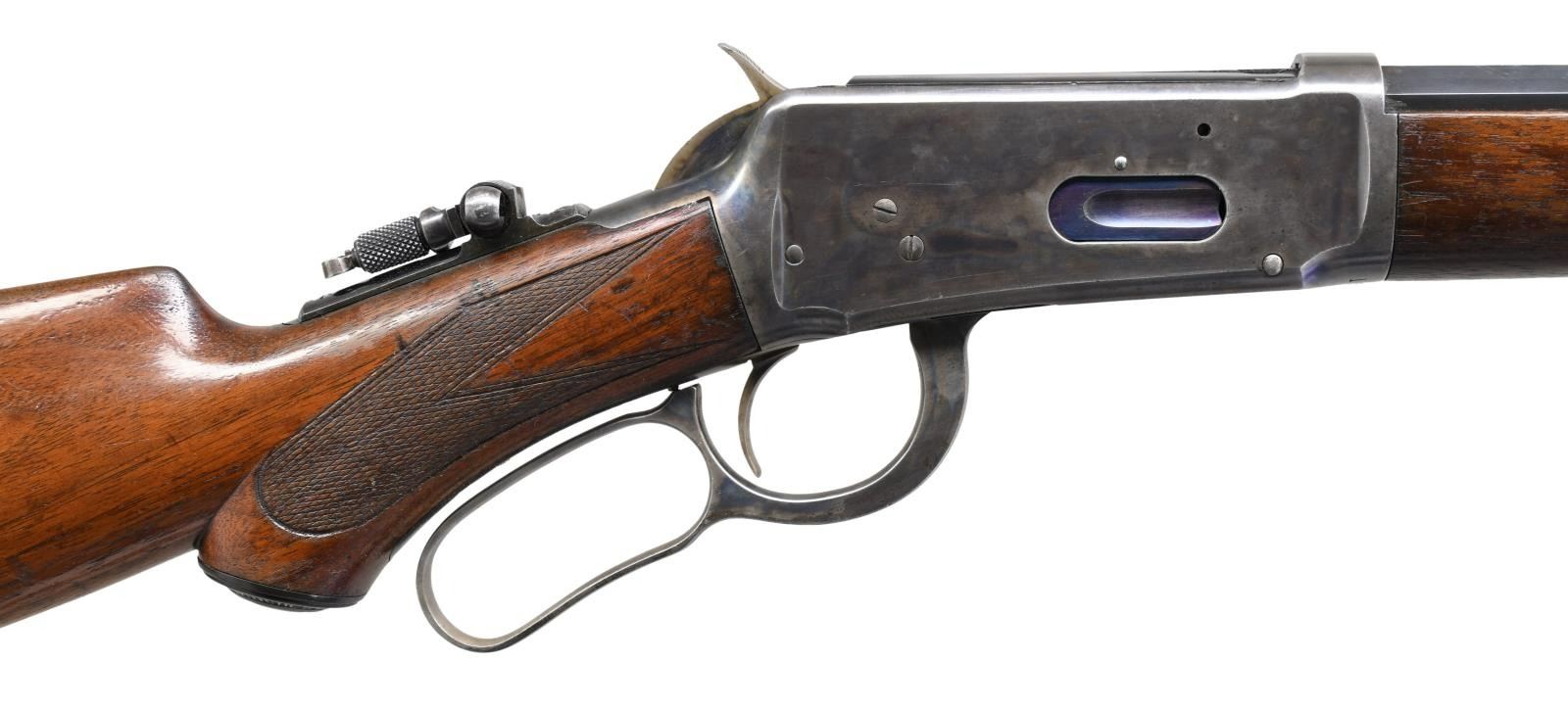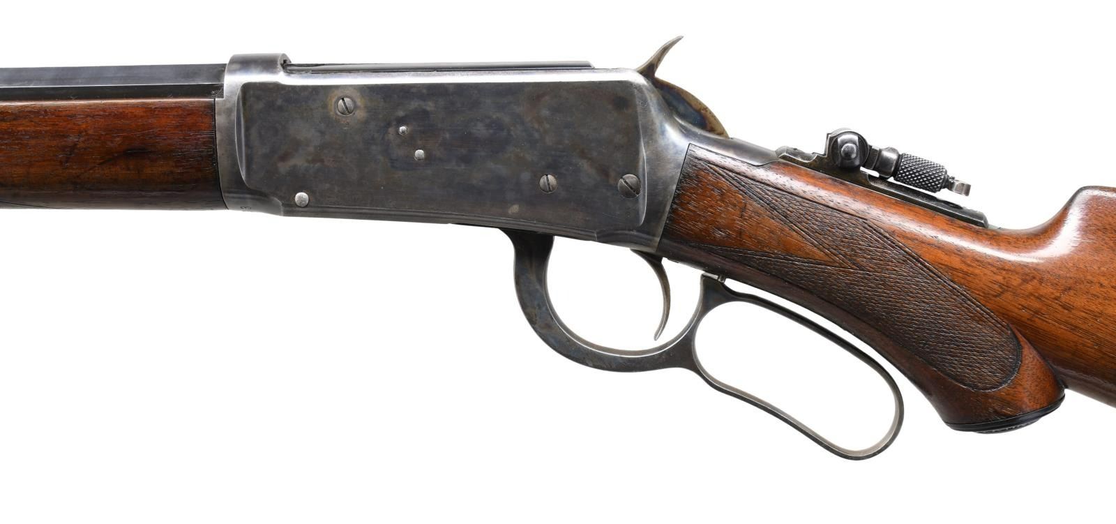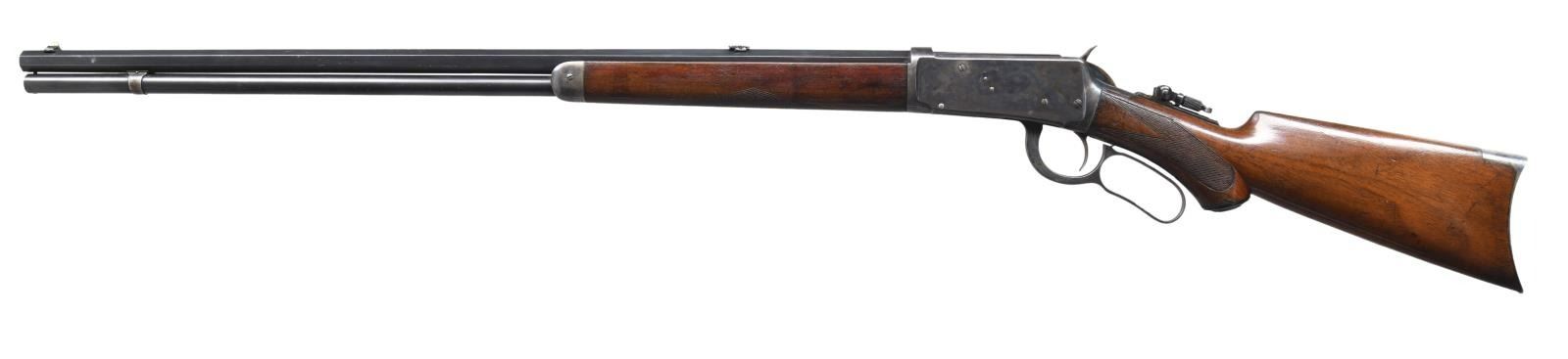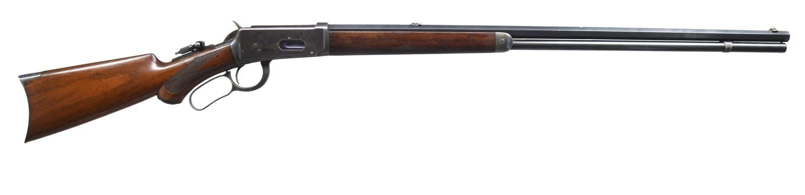 LEVER ACTION RIFLE. Cal. 32-40. S# 15333. Case colored receiver, hammer, lever, forearm cap & buttplate. Research indicates that only 155 model 1894s were shipped from the factory with case colored frames. The highly desirable case colored actions were not catalogued after 1901. Bbl. 28" octagon, 2" longer than standard. Sporting front sight, Lyman No. 6 folding leaf rear sight with a combination tang sight. Full length mag. Walnut forearm & hard rubber capped pistol grip stock with crescent steel buttplate. Stock & forearm have the distinctive style "I" factory checkering that identifies the highly collectable semi deluxe rifles. Inside of lower tang is marked w/ assembly number "3322" followed by a circular mark & number "47". Top tang channel of stock has matching assembly number "3322". UNATTACHED ACCESSORIES: letter from Cody Firearms Museum Records Office detailing the following information, "SN applied: 6-8-1896. Date In: 7-1-1897. Rifle. Caliber/Gauge: 32/40. Bbl Shape: Oct. Length: 28. Trigger: Plain. Stock: PLain, pistol grip, checkered. Other Features: CH(case hardened). Date Shipped: 7-2-1897. Order #: 10440.". CONDITION: bbl. & mag. tube retain over 90% lightly faded blue showing small handling marks. Frame, hammer & lever retain over 90% dark beautifully visible case colors showing carry & edge wear. Forearm cap & buttplate retain over 40% nicely visible case colors. Original wood finish & checkering show light wear with scattered scratches & marks. Bore retains sound rifling having a slightly dull appearance. (01-23947/DS). ANTIQUE. $20000-30,000.
