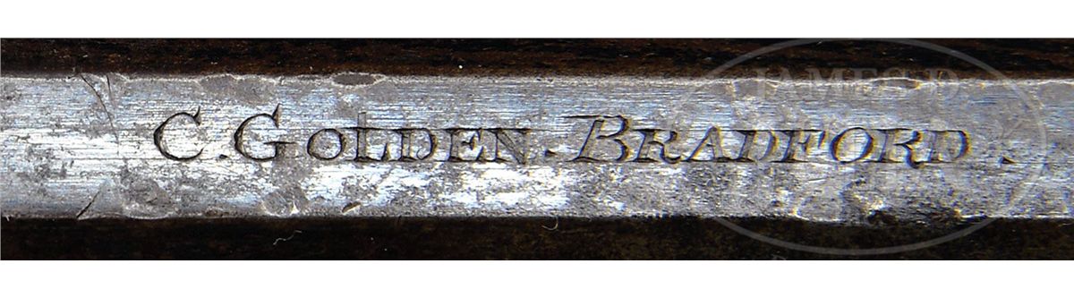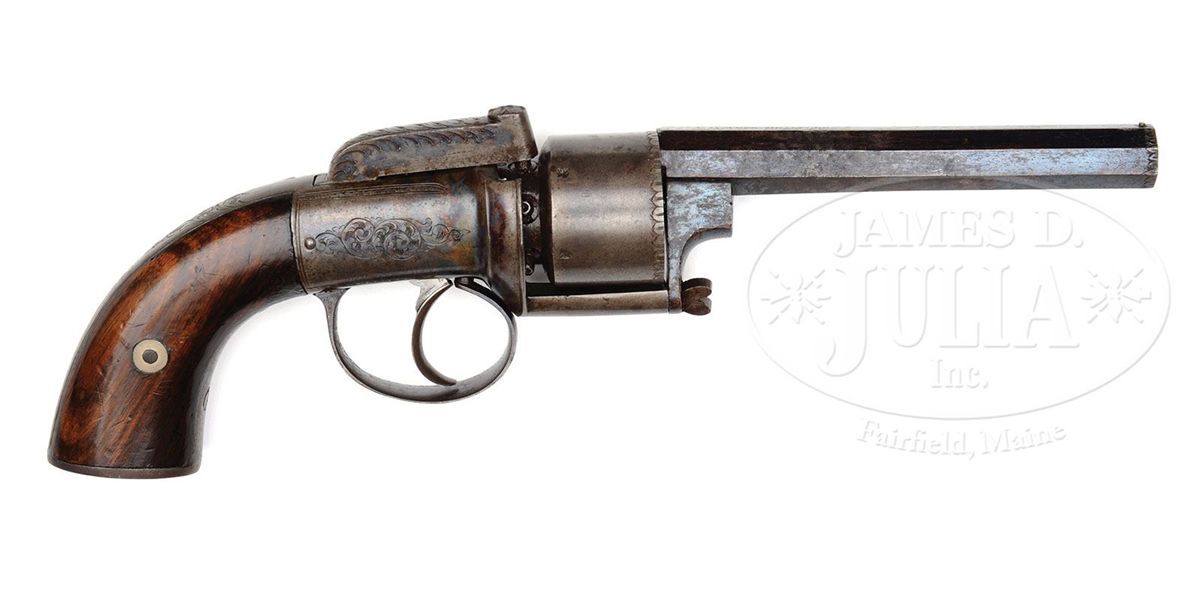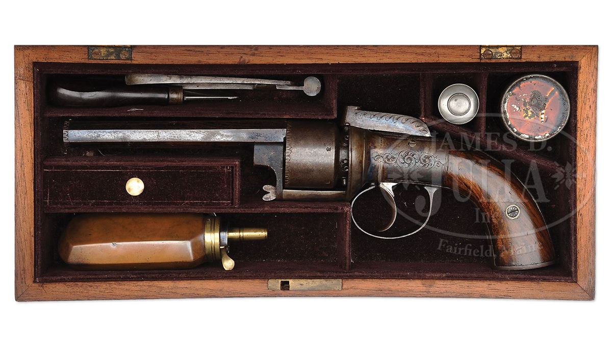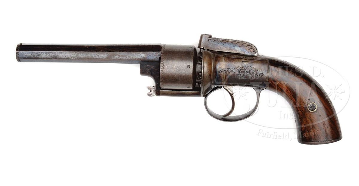 NSN. Cal. 42. Blue & color case hardened with 5" oct bbl that has micro-rifling, brass pin front sight and marked on top flat "C. GOLDEN, BRADFORD" (listed in Bailey & Nie, ENGLISH GUNMAKERS, as "Golden, Charles, 18 Cheapside, 1864." Built on a rnd frame with extended bottom strap with integral nipple shield and right hand slightly offset bar hammer. It has a large trigger guard for the double action trigger and is mounted with highly figured 2-pc walnut grip panels. Cylinder is 6-shots, unfluted with unshrouded nipples and stop notches on a raised ridge at the rear end with riveted-on ratchet wheel. Bbl threads onto the cylinder spindle and is secured by a wing nut screw through the bbl lug into the bottom strap. Frame, hammer, grip frame & cylinder are color case hardened. There is a scroll-like engraving on the sides of the frame, butt and backstrap. Accompanied by its orig burgundy velvet lined mahogany casing with engraved scallop-edge plaque in the lid inscribed "WILLIAM PARTON". Interior is compartmented for the pistol, a fine color case hardened nutcracker mold with sprue cutter and one arm that is a rammer. Also accompanied by a Sykes style bag flask with faceted edges, an ebony handle turn screw, a small pewter oil bottle, lacquered tin of caps and a functioning key. A covered compartment contains cast lead balls. Also accompanying is the paper label from inside the lid, which has become detached. PROVENANCE: Marlan Polhemus Collection. CONDITION: Very fine. Bbl retains 50-60% glossy blue mixed with dark patina and an area of fine pitting; frame & hammer retain very bright, orig case colors; trigger guard, grip frame & buttcap retain faded case colors; cylinder retains heavily faded case colors. Grips are sound with a few light nicks & scratches and retain most of their orig varnish. Mechanics are fine, strong bright bore with scattered pitting. Case is extremely fine with a few light handling & storage nicks & scratches and retains virtually all of its orig varnish; interior is lightly faded with light soil in the bottom; mold retains brilliant case colors; flask is a dark brass patina; other accessories are fine. Altogether a beautiful early percussion revolver. 4-48731 JR372