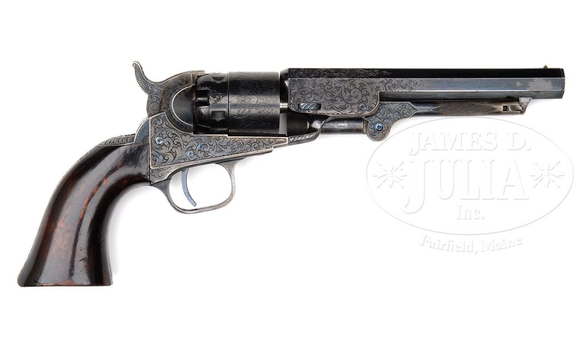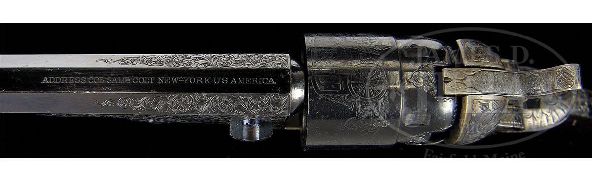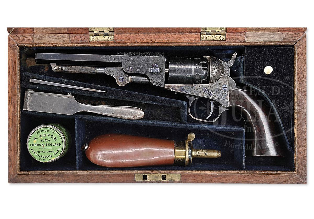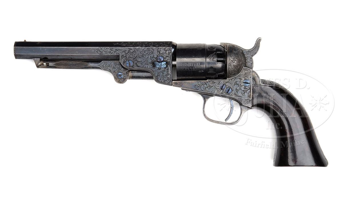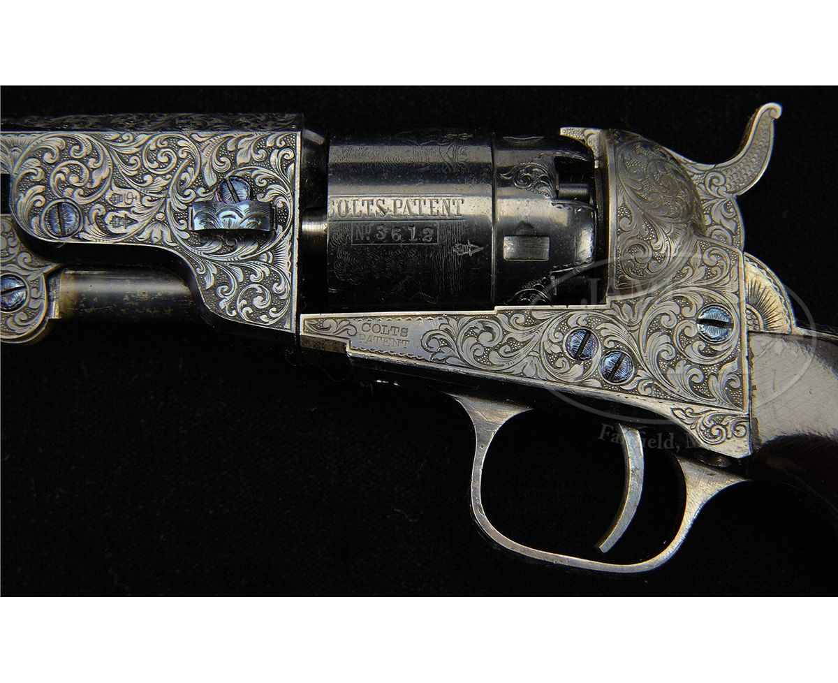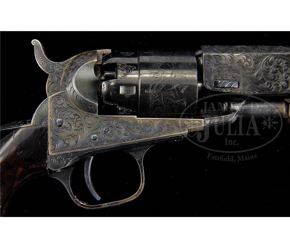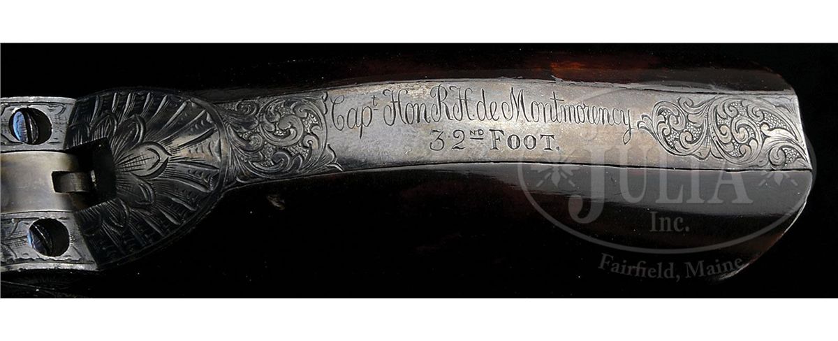 SN 13612. Cal 36. Blue and color cased hardened with 5 1/2" oct bbl, pin front sight and 1-line New-York U.S. America address. Left side of the frame is marked with a small "COLTS PATENT". The blued steel trigger guard and backstrap contain a highly figured, burl walnut, varnished 1-pc grip. Revolver is beautifully engraved in New York style with full frame coverage sweeping foliate arabesque patterns that has very fine pearled background. Matching pattern engraving extends over the bbl lug and top side flats, onto the rammer pivot and around the front sight. Rammer handle has an extremely fine checkered panel. Hammer is deluxe engraved with foliate arabesque patterns on the shank, wolf's head on each side of the hammer nose, fish scale patterns on each side of the spur and top edge. Top of the backstrap is engraved in a floral and fan pattern with foliate arabesque patterns at the heel and on the trigger guard. Center of the backstrap is engraved "Capt Home. R.H.de Montmorency / 32nd FOOT". Screw heads are all engraved as are the ends of the wedge with light flourishes by each nipple recess shoulder on the cylinder. Bbl lug and cylinder have British proofs. All SN's on bottom of revolver are accompanied by a small "L" & a tiny punch mark indicating that the revolver was destined for the London Agency and that it was to receive extra finish in the polishing room which generally indicates that it was to be engraved. Accompanied by a blue velvet lined English mahogany casing with empty plaque in the lid and compartmented in the bottom for the revolver, a fine bag shaped Dixon "COLTS POCKET FLASK", a blued two cavity "COLT'S PATENT" mold with sprue cutter, marked on the right side "36P", an L-shaped nipple wrench and a tin of Joyce caps. Revolver bears an English style finish and it has been engraved in England and finished there as patterns on the left side of bbl lug are cut around the British proofs which would not have been the case had the revolver been engraved prior to shipment to England. CONDITION: Extremely fine, all matching. Revolver retains virtually all of it's English style finish with bright blues and muted case colors. Backstrap and buttstrap are flaked to about 65% blue. Grip is sound and retains most of a beautifully restored finish showing light edge wear on the right side. Mechanics are fine, bright shiny bore with one ring of pitting. Case has 3 or 4 grain checks in the lid and a crack across the rear edge leaving it slightly sprung. Interior is lightly faded and soiled with damage from the front sight. Flask has a few small dents and retains about 90% orig finish. Mold is very fine and retains about 95% orig blue. Other accessories are very fine. 4-47861 JR48