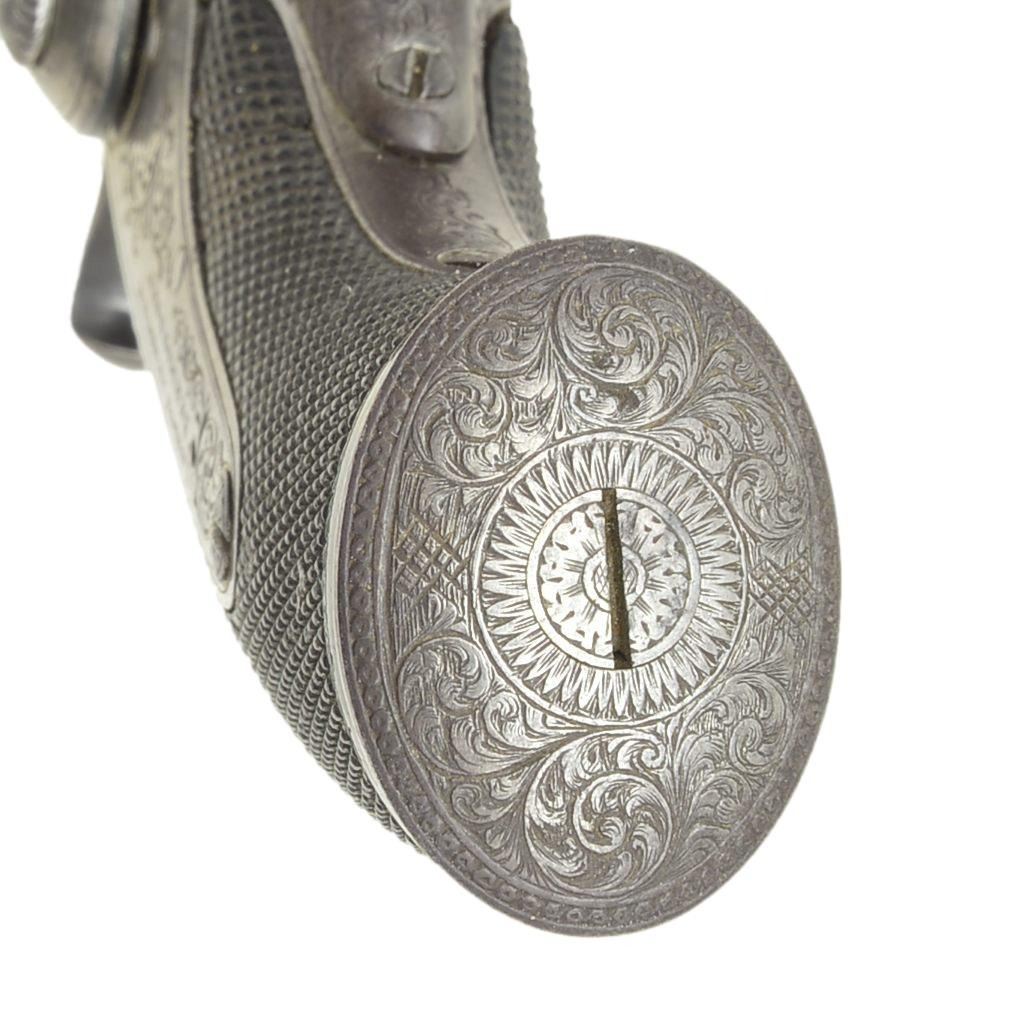 REVOLVER. Cal. 39 (80 bore). S# 129. Bbl. 5.5" oct. w/ London proof “L.A.C”. Bbl., frame, lock, hammer, trigger guard, butt cap & cyl. engraved w/ foliate scroll; right side of frame engraved in ribbon “KERR’S PATENT No. 129”; lock engraved LONDON ARMOURY / BERMONDSEY”. Checkered & varnished walnut grip w/ oval silver escutcheon: “HCL from FC” in script monograms. UNATTACHED ACCESSORIES: Mahogany casing w/ green baize lining, brass mold w/ sprue cutter, Dixon pewter oiler, unmarked bag flask, wood & brass cleaning tool, wood handled nipple wrench, red labeled cap tin. First model Kerr’s were made up to about S# 1000, few are cased or engraved. After S# 1000, revolvers are 54 bore & most were sold to the Confederacy. After the war at about S# 11,000, the last few hundred sold in the civilian market w/ several cased & engraved like this one. CONDITION: revolver is good to very good overall retaining traces of blue in protected areas, overall gray patina w/ crisp markings & engraving. Grips are good w/ small gap on left side abutting frame. Mechanics need attention. Bright crisp rifled bore. Brass bound mahogany case is very good w/ vacant round edge decorated escutcheon in lid, lining soiled & scuffed. “Adams 1852” marked 80 bore mold is smooth mixed chocolate patina, unmarked bag flask has medium mustard patina, Dixon pewter oiler has gray patina & dent on one side. Cap tin has good label. 2 Wood handle tools are good. PROVENANCE: The Estate Collection of Gary Parietti. (01-19225/JS). ANTIQUE. $2,500-3,000.