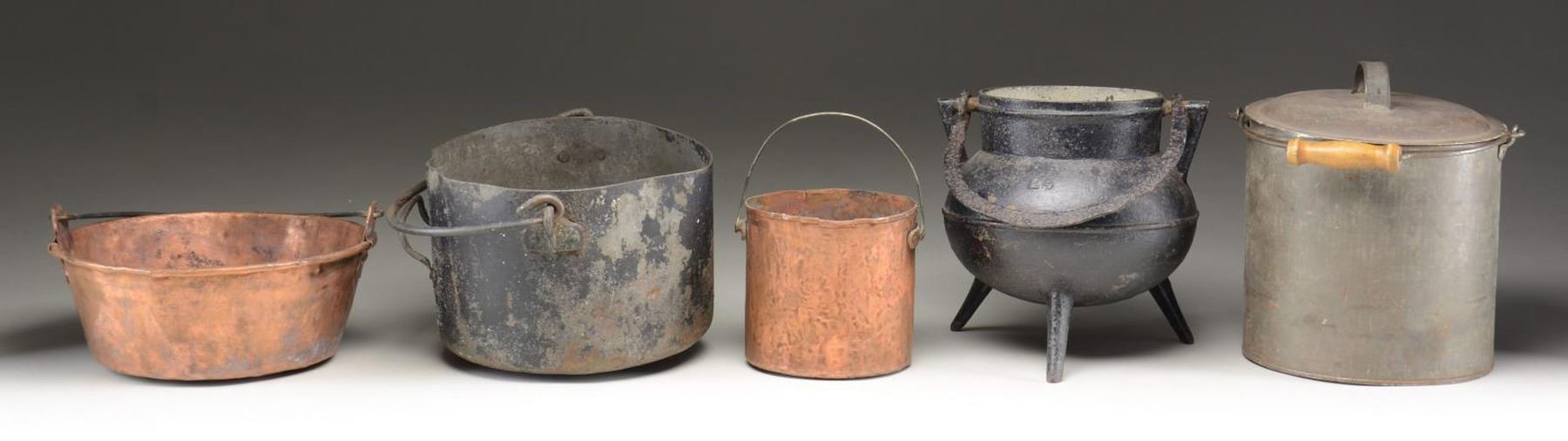 From the collection of Milton Von Damm is a rare 9.5" high cast iron 3 legged Marmite kettle which was used by French settlers and Indians in the French Louisiana area of New France in the 1700s. This type could be placed directly on the fire. Also in this lot is a 9" diameter sheet iron kettle, 10" diameter copper kettle with riveted copper flanges for bale, soldered 9" tin lidded boiling pot, and 6" diameter well used hammered copper kettle; 5.5" tall. UNATTACHED ACCESSORIES: descriptive sheet. CONDITION: good overall, sheet iron kettle is bent and out of round. Marmite bale is pitted, interior is clay lined at bottom. PROVENANCE: Lifelong collection of author Milton Von Damm. (02-22227-3/JS). $200-400.