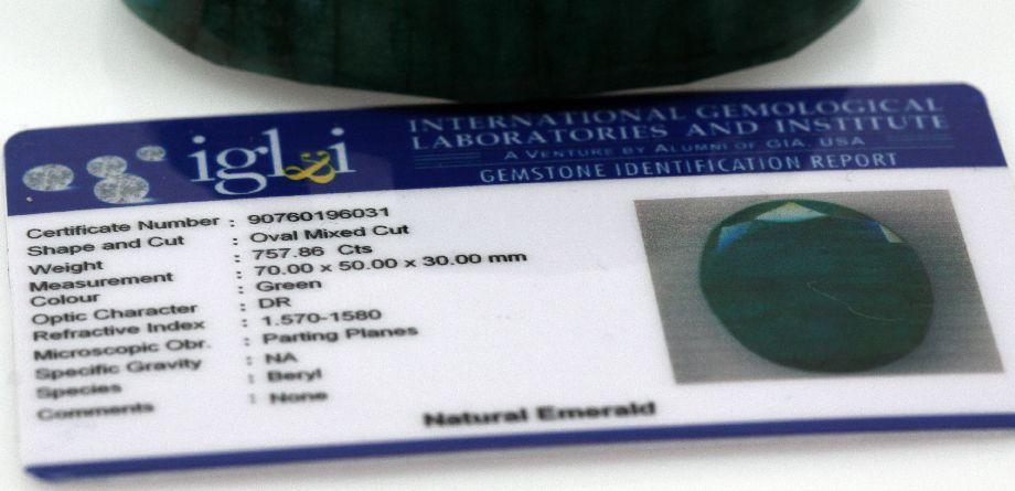 Length: 70.0mm Width: 50.0mm Depth: 30.0mm International Gemological Laboratories and Institute certification. . Weight: 757.86ct . Condition: very good