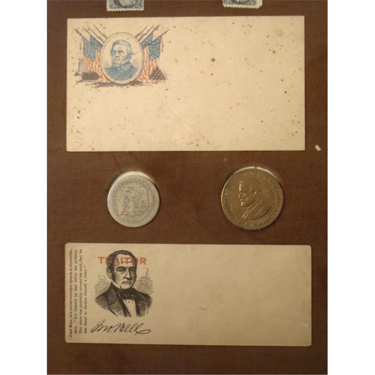 RARE CIVIL WAR COLLECTION OF ORIGINAL PATRIOTIC ENVELOPES FROM THE WAR--ALSO 1862 U.S. POSTAGE STAMPS--US SEATED LIBERTY HALF DOLLAR & ORIGINAL CONFEDERATE REUNION COMMEMORATIVE COIN DATED 1908.  IT IS IN A FRAME THAT MEASURES 17 1/2 x 24 1/2". * ORIGINAL RARE ITEMS-PROFESSIONALLY FRAMED *