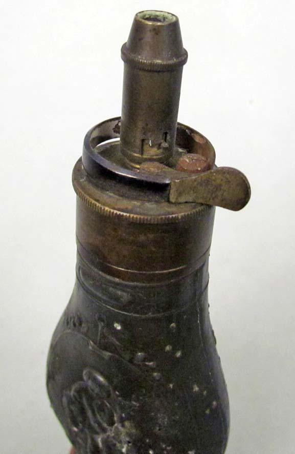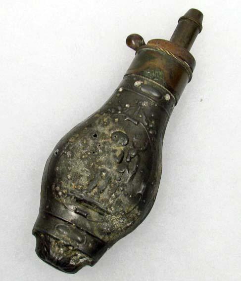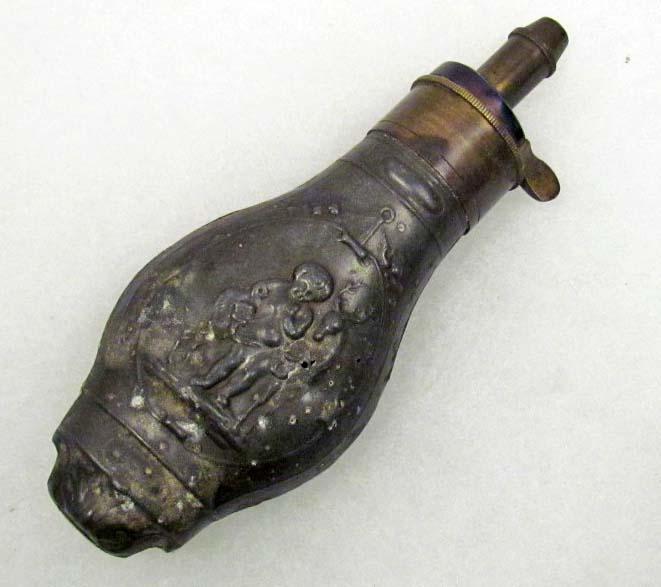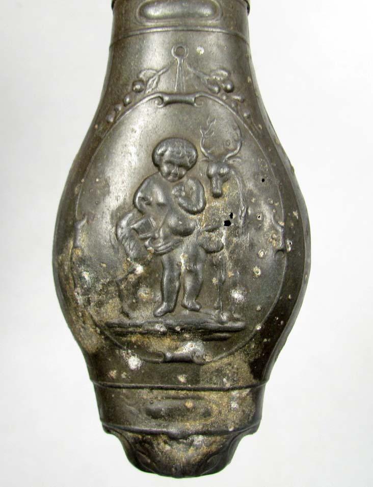 RARE CIVIL WAR ERA ZINC PISTOL FLASK W/ EMBOSSED CHERUB AND STAG