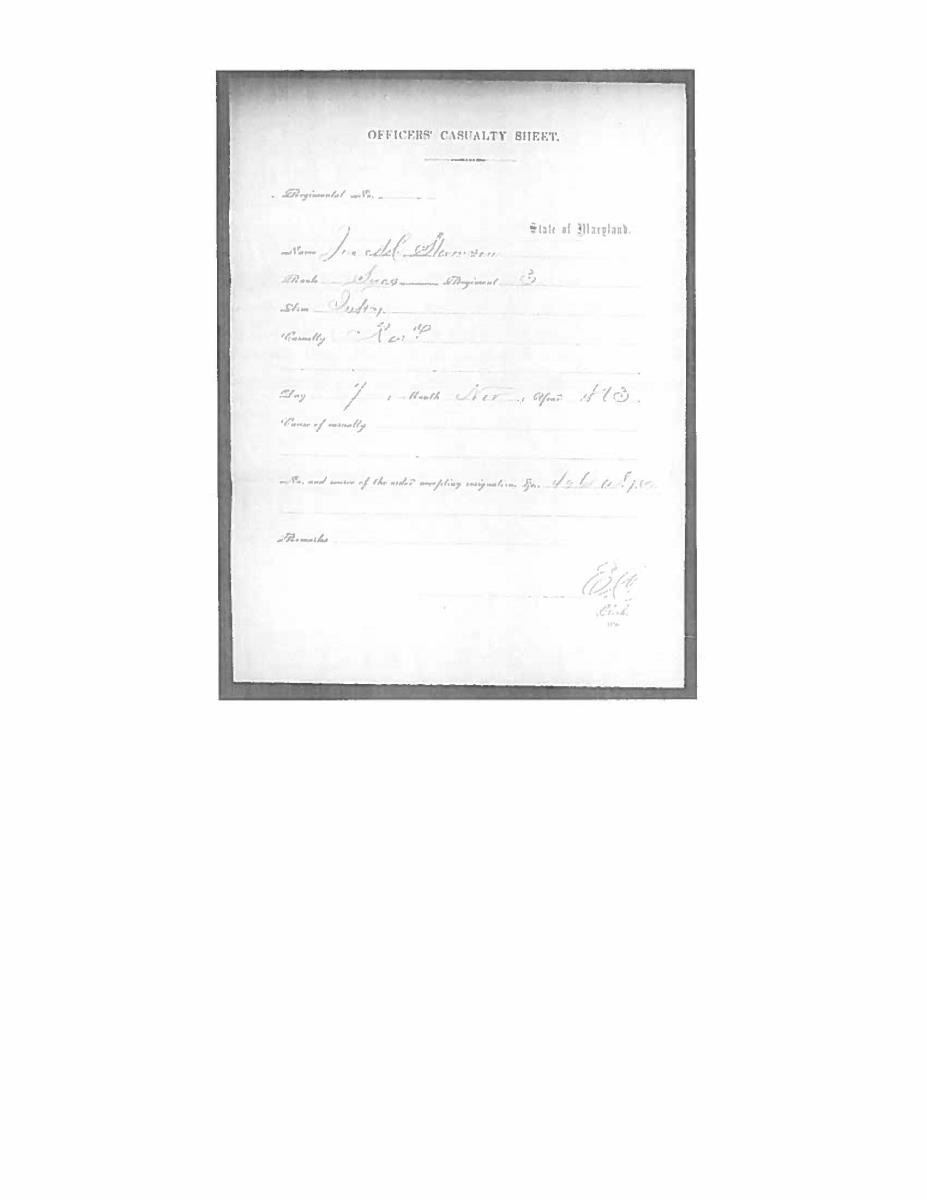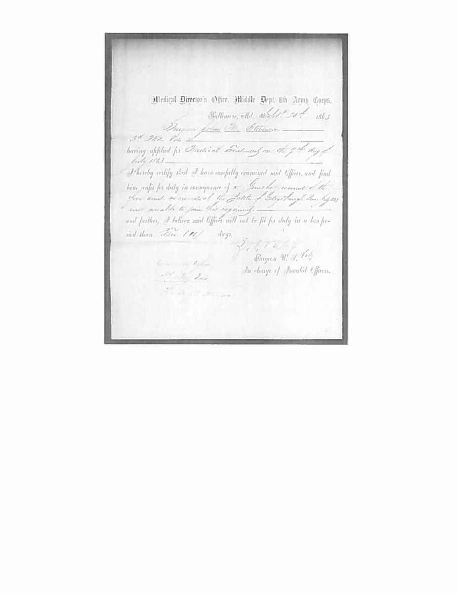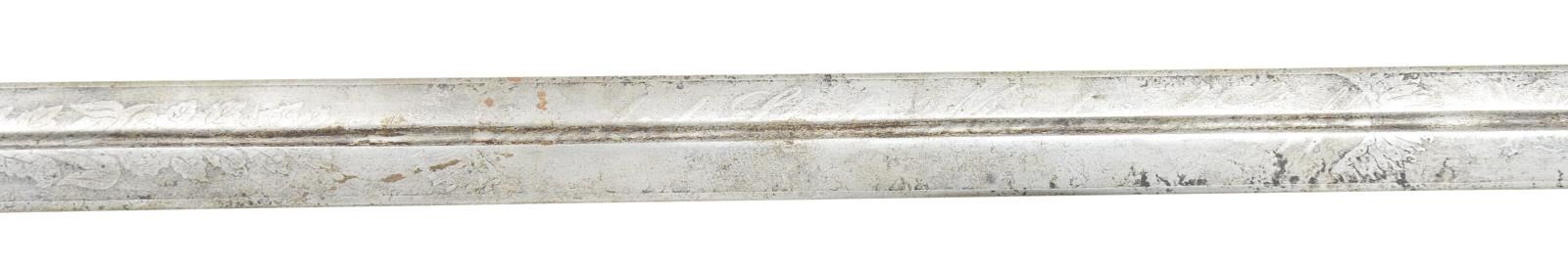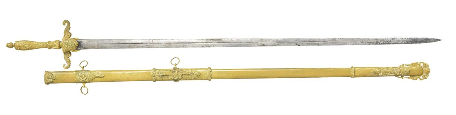 SWORD, SURGEON JOHN M. STEVENSON, 3RD MARYLAND INFANTRY, WOUNDED JULY 3 AT CULP’S HILL, BATTLE OF GETTYSBURG. 32” double edged blade etch with “UNITED STATES MEDICAL STAFF”, eagle & panoply of arms. Solid cast cruciform guard has languet with script relief “MS” above 13 stars, high grade regulation Medical Staff sword by Clauberg with high relief scabbard mounts inscribed: “Presented to / Jno. M. Stevenson / Surgeon of 3rd Md Cavalry / By his friends Dec. 11, 1863. Identified Medical staff swords are scarce to start with, any identified Maryland sword is very scarce, so this may be the only high grade Maryland Medical sword extant. Few surgeons found themselves in harm’s way on the battlefield, but 2 officers had gunshot wounds at Culp’s Hill Gettysburg, July 3, 1863. Capt. Henry Fenton was killed, Surgeon Stevenson only had gunshot wound to forearm and survived, recuperated and resigned November 7, 1863 to join the 3rd Maryland Cavalry which he was commissioned when sword presented less than month later. He would see service till September 9, 1865 at hospitals in Mobile, New Orleans, and Vicksburg. Sword was part of the late Arthur “Gil” Barrett collection who displayed this as part of his Maryland collection for many years. UNATTACHED ACCESSORIES: copies of national archives records of Surgeon Stevenson’s war record. CONDITION: good overall, blade is gray with worn but discernible etching, brass hilt and scabbard have toned patina after old cleaning. (02-17013/JS). $3,000-5,000.