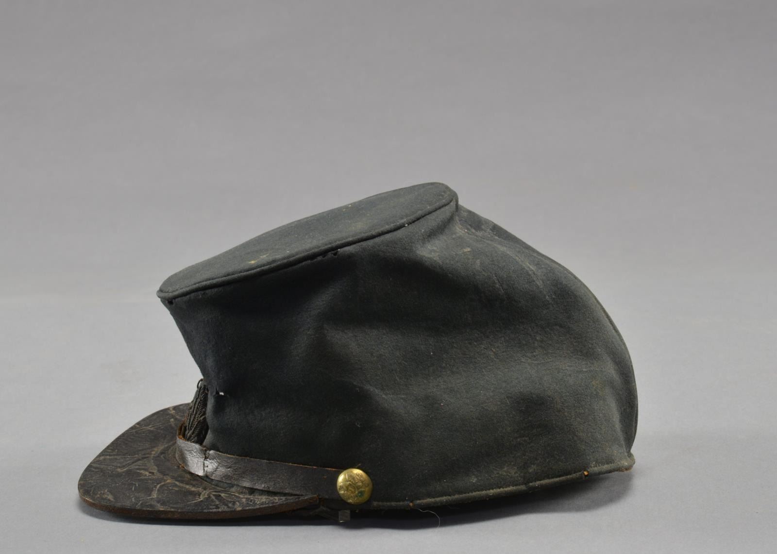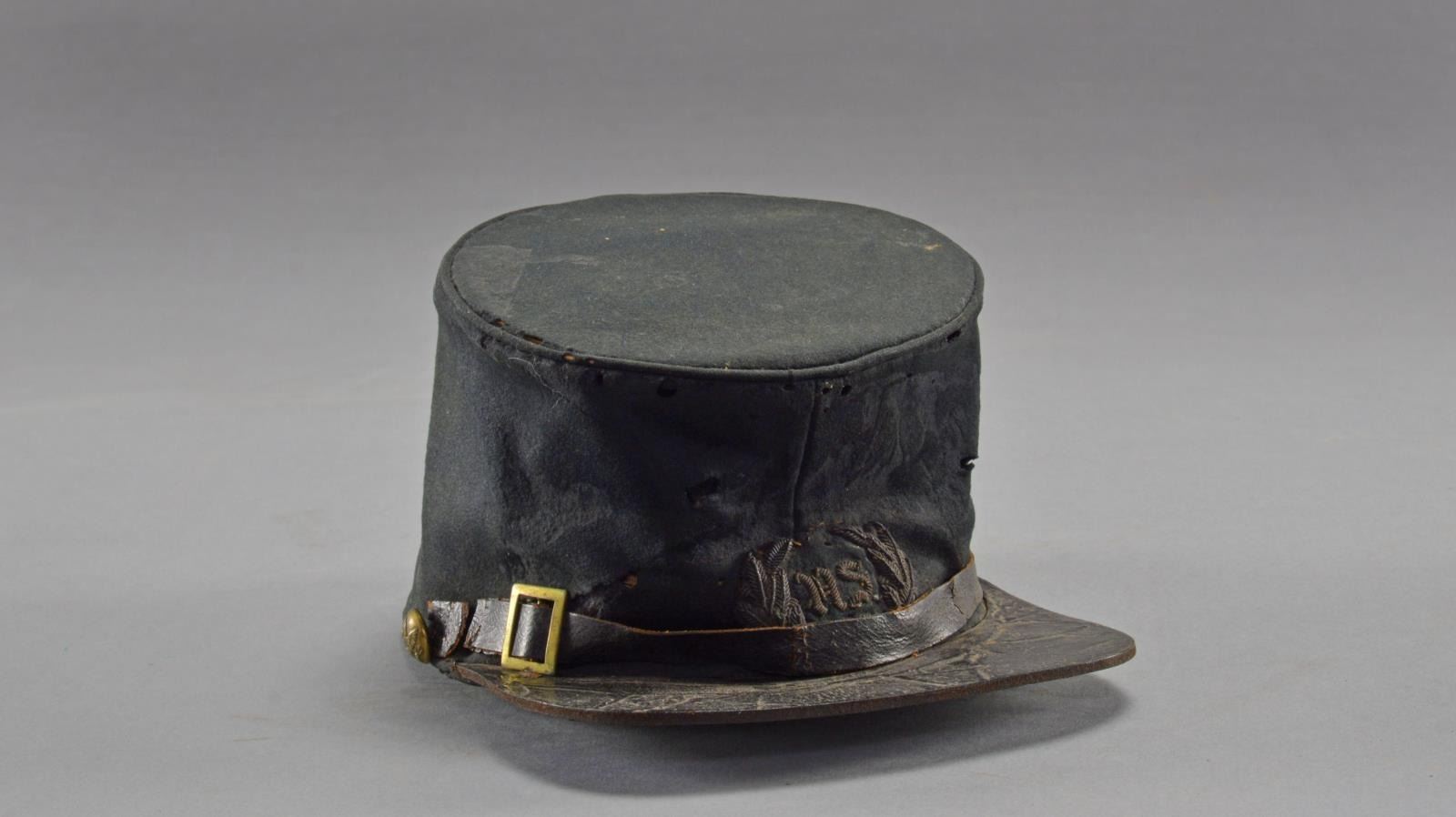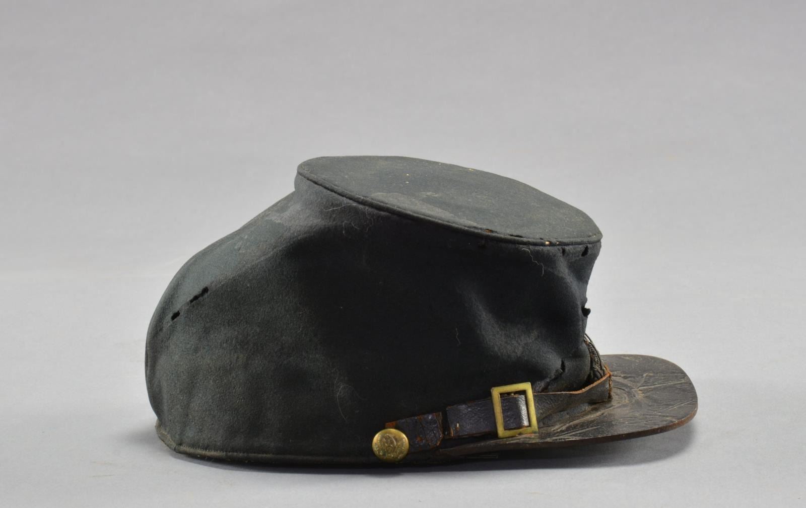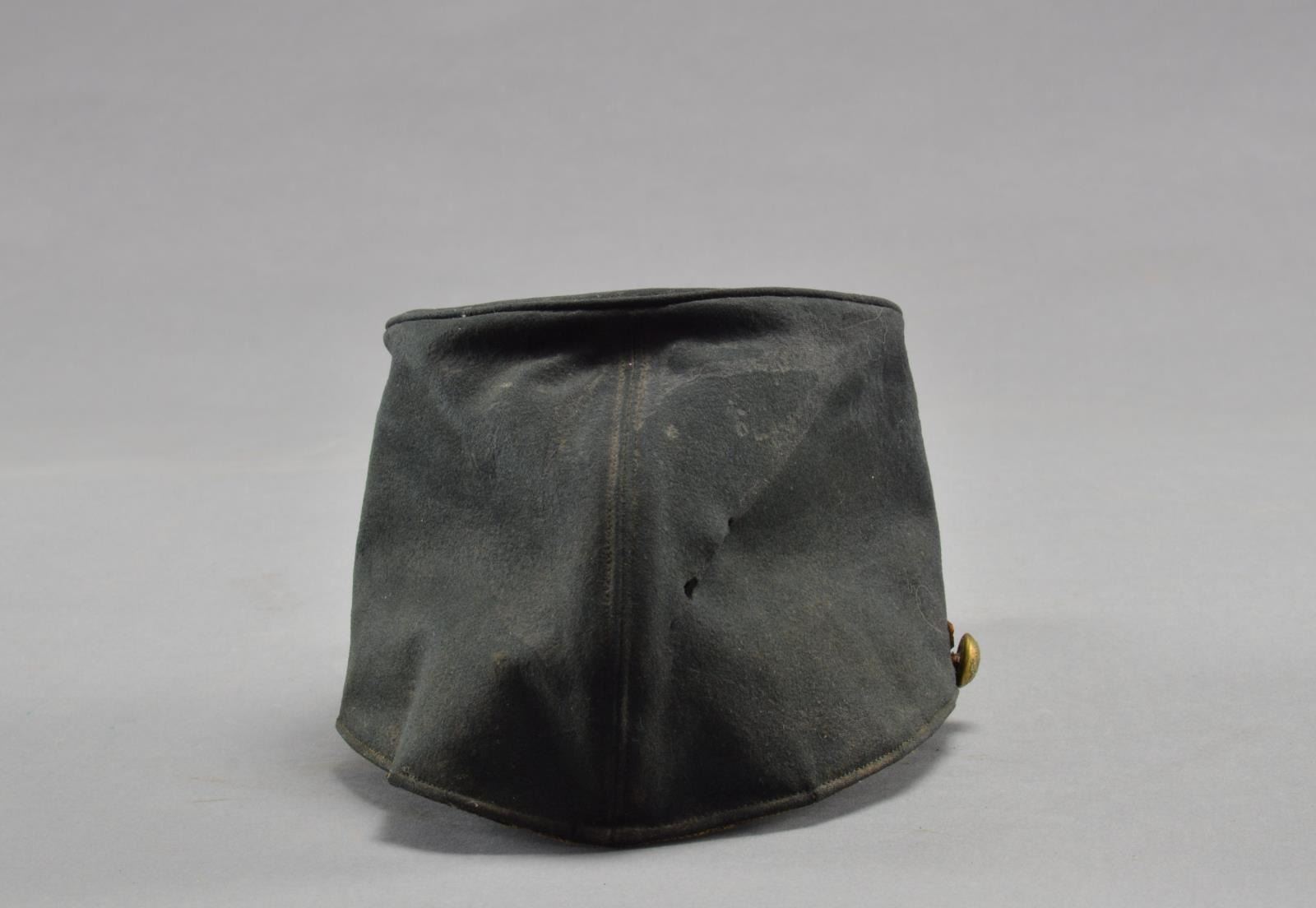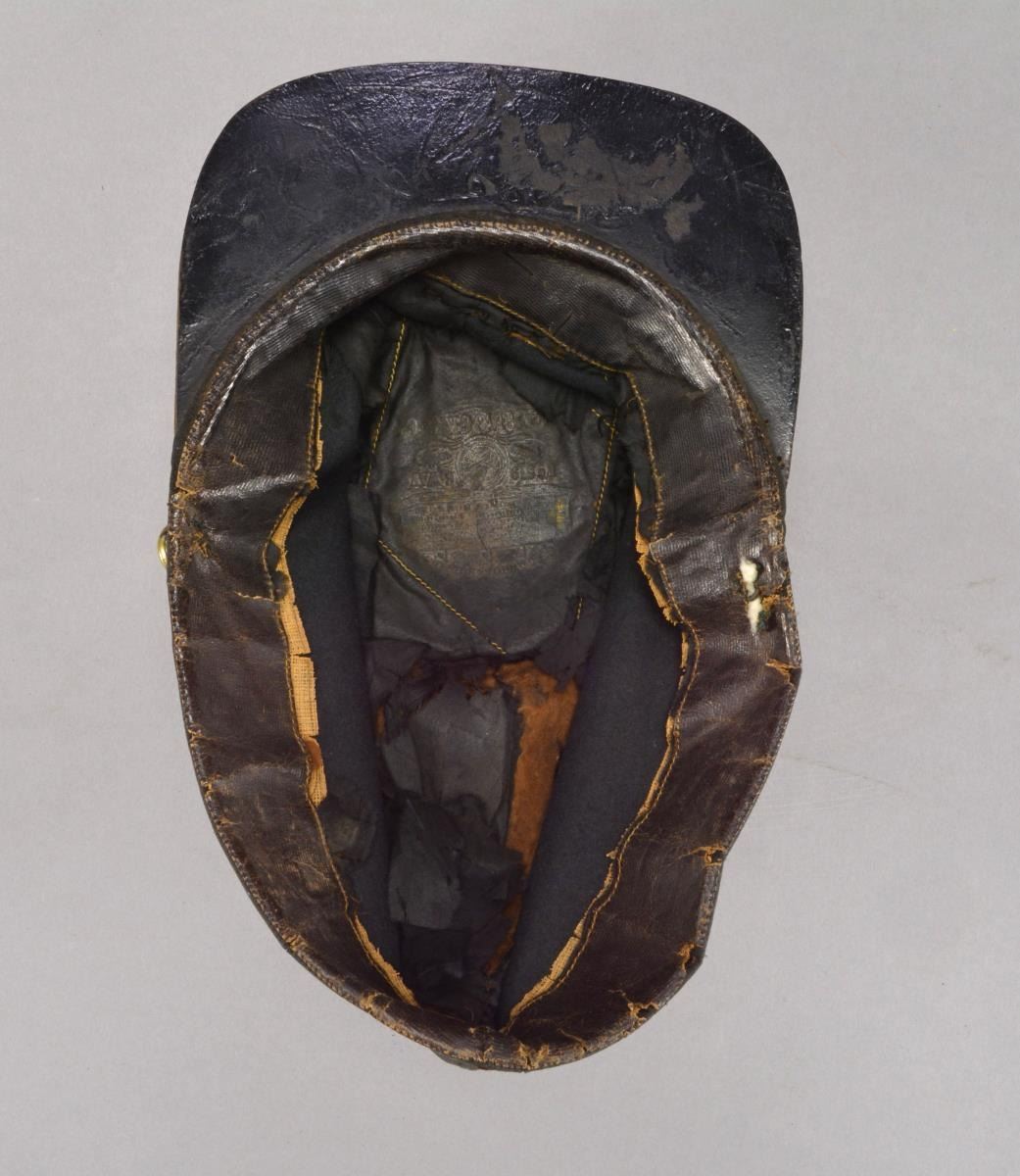 INSIGNIA. Private purchase staff officer’s cap w/ wartime “Warnock & Co” impressed mark on silk liner on crown. Often seen in photographs but rarely surviving is embroidered “US” inside wreath insignia sewn to face of cap, eagle “I” side buttons. CONDITION: fair to good overall dark blue wool body has significant insect damage, several sm. holes & large loss of nap. Silk lining is only partially intact on sides but sewn portion to crown is complete w/ good discernible “WARNOCK” maker’s mark, sweat band is complete, chinstrap is broken & tack stitched to body for display. The original embroidered insignia has matching wear & condition to rest of cap. (02-14837/JS). $3,000-4,000.