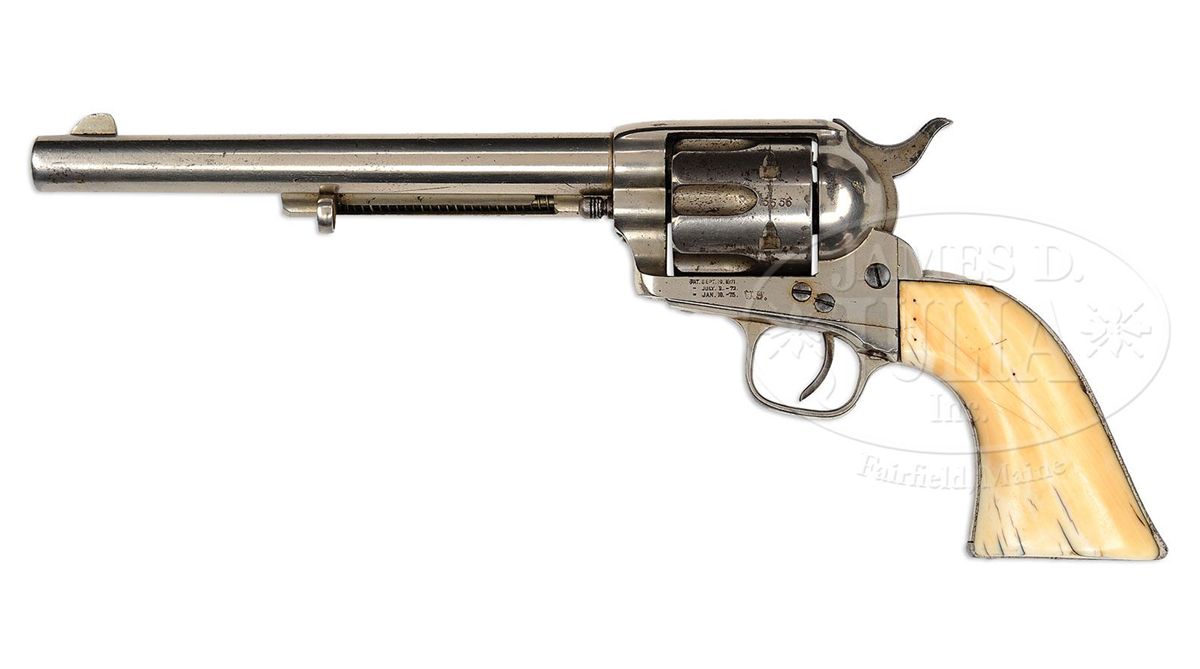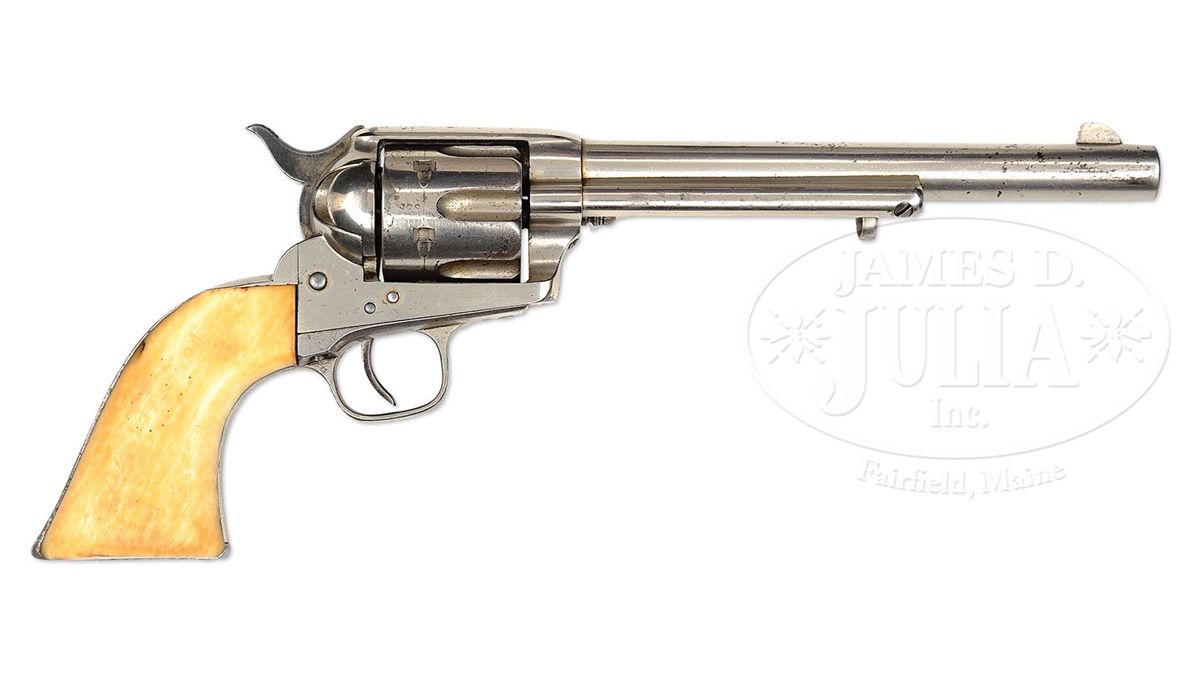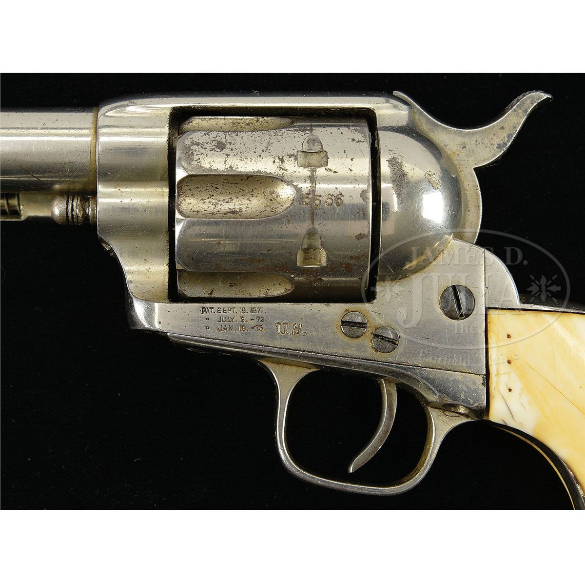 SN 35556. Cal. 45 Colt. Nickel finish with 7-1/2" bbl, full front sight and 1-line block letter address. Left side of frame has 3-line patent dates and a small "U.S.". Mounted with a 1-pc ivory grip consisting of two slabs of ivory attached to two wooden spacer blocks as originally produced by Colt. Ejector housing is first type with bull's eye ejector rod head. Frame, bbl & cyl all have the "J.T.C." (John T. Cleveland) sub-inspector initials. All visible SNs are matching and the bbl & cyl have last four digits of matching SN. According to A Study of the Colt Single Action Army Revolver, Graham, Kopec & Moore, p. 249 identifies this revolver and another by SN as one of two known nickeled Cleveland inspected U.S. revolvers and states "It is believed that these two revolvers were special ordered for officer's personal use. In a later publication Cavalry & Artillery Revolvers...A Continuing Study, Kopec & Fenn, on p. 49 identify eight nickeled revolvers of the Cleveland series, by SN, but do not include this one, with the notation that they may be buyback revolvers with one listed as "condemned" and another an "overrun". It is known that Springfield Armory did accept orders from officers in the field for revolvers with nickel plating. Accompanied by a Colt factory letter which identifies this revolver in caliber 45 with bbl length, finish & type of stocks not listed, sold to the U.S. Government and delivered at the Colt factory Feb. 13, 1877 in a 203-gun shipment. The date of delivery of this revolver certainly coincides with prime Indian War issues and it seems unlikely that the government, once a firearm had been received would have released it to the public instead of being issuing it to a trooper in the field. CONDITION: Very fine, all matching except grip which is unnumbered. Overall retains most of its strong nickel finish with slight wear losses around the muzzle, some light flaking on the bbl, backstrap & buttstrap and a little heavier flaking on the cyl; hammer retains 40-50% milky nickel and the screw heads dark blue. Grip is sound with numerous small age lines and some rust staining around the back & buttstrap slots, corresponding to light rust spotting on the sides of the backstrap & buttstrap; grip is slightly shrunken. Hammer is not solid in safety or half cock notches, otherwise mechanics are fine, bright shiny bore with some very fine orange peel type pitting. 4-48754 JR336