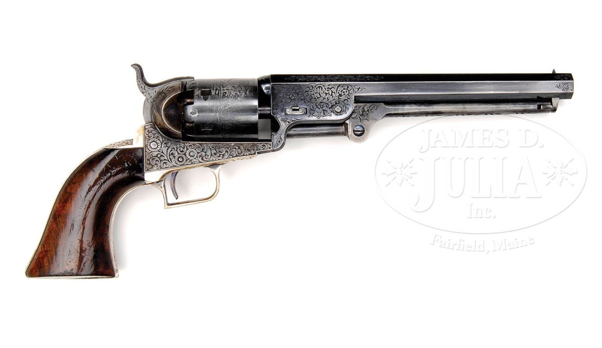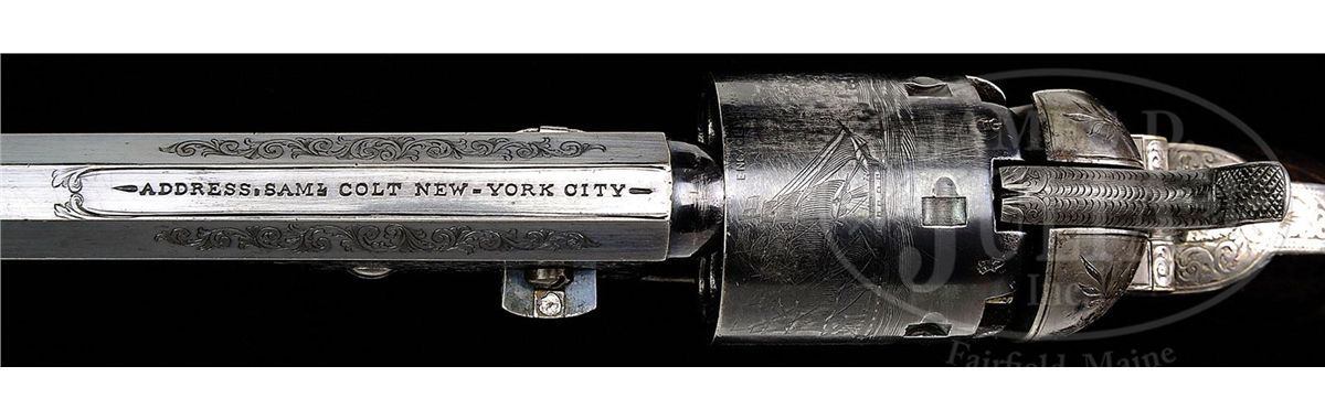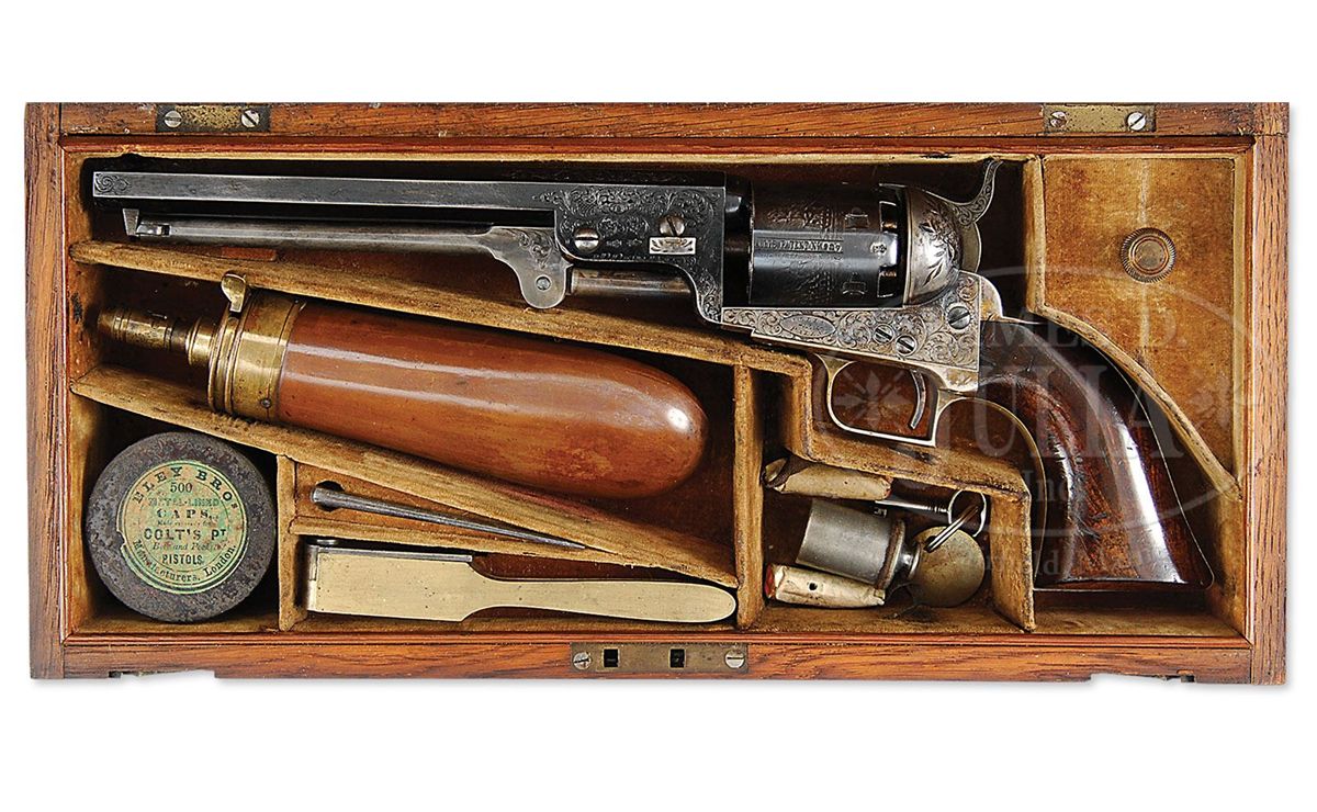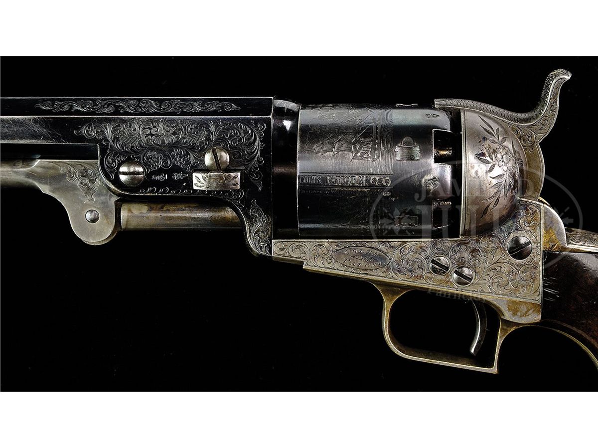 SN 207. Cal. 36. Blue & color case hardened with 7-1/2" oct bbl, brass pin front sight and New-York City address. Left side of bbl lug & cyl have British proofs. Left side of frame has "COLT'S PATENT" engraved in an ellipse. Cyl is usual 6-chambers with Ormsby Naval Battle scene roll marking and has all six safety pins serviceable. The silver plated brass trigger guard & backstrap contain a beautiful burl, deluxe, 1-pc walnut grip with matching SN in backstrap channel. Trigger guard is very small and square back and is a 2nd type revolver with screw over the wedge and a slotted cyl spindle with a thin lug. This beautiful revolver is wonderfully English engraved with very fine foliate arabesque patterns in full coverage on both sides of frame with foliate & floral patterns on recoil shields. Engraving extends over bbl lug and top side flats with matching patterns on rammer pivot and around muzzle. Bottom of rammer handle is engraved in leaf & vine patterns. Top of backstrap, backstrap ears and heel of backstrap, along with buttstrap & trigger bow are engraved to match the frame. The trigger guard is stamped with a small "2" below the SN. Accompanied by its orig English oak casing with brass medallion inlay engraved in period script "Presented / to / Park Pittar Esqr. / by / Col. Colt". Inside is lined in burgundy velvet and compartmented in bottom for the revolver, a Barlow bag shaped flask, a brass 2-cavity bullet & ball "COLTS PATENT" mold with sprue cutter, a lacquered tin of Eley's caps, an L-shaped nipple wrench/screwdriver, a pewter oil bottle, two combustible cartridges, a spare hammer spring and cast lead bullets & balls. It also has an orig functioning key. Items presented from "Col. Colt" are the most rare of the presentation Colts and are extremely rare on English items. Park or Parke Pittar was born in Dec. 1814 in Rio de Janeiro, Brazil and died in 1884 at age 69. He was a businessman, entrepreneur and investor in a variety of companies; one of which was the Charles, Nephew & Co. in Calcutta, India which he and his uncle Charles Pittar founded in 1848 assuming the business of an older uncle. They were jewelers, watch makers, gold and silversmiths and became extremely prominent for high quality goods. They opened an additional shop in Simla, India and were also agents for the famous London firm of Elkington & Co. According to research material provided by the consignor, it seems likely that Col. Colt probably became acquainted with Park Pittar during the 1851 Crystal Palace World Exhibit in London. It is known that Col. Colt either sold or provided Dragoon revolvers numbers 10222 and 10223 which were also in the exhibit, to Charles, Nephew & Co. which is inscribed on the rear of the trigger guard. It is speculated that Col. Colt, not wanting to have his approx. 500 firearms inspected and marked by the Tower of London, possibly defacing or damaging them, agreed not to sell any of his displayed firearms within England, but it is believed that he sold and presented a number of those arms to high ranking political persons, military officers and other important people who could aid in promoting his company outside of England. Charles, Nephew & Co. of Calcutta was just such an entity and it is known that they did distribute firearms. So, the logical conclusion is that once the exhibit was finished Col. Colt presented the 1851 Navy being sold here to Mr. Pittar, probably in about 1853. Included in the information provided is a list of seven 1851 London Navy revolvers that are engraved and/or presented, including this revolver with only two having the square-backed trigger guards and the other 5 having small rnd trigger guards. SN 209 is listed as being engraved and nearly identical to this revolver and it also has a small square-back trigger guard. This information is compiled by renowned English collector and dealer Pete Holder. There is also a 1993 dated letter from renowned collector/dealer Joseph G. Rosa wherein he discusses the nearly identical similarity between this revolver and SN 209. He states that the use of the square-back trigger guard intermittently in these early English Navys was simply cleaning up old parts. Additionally accompanied by a handwritten letter from renowned Colt researcher and author, R.L. Wilson, wherein he describes the gun and states that it was presented in 1853. There is a plethora of information regarding the family and history of Park Pittar and some of his business dealings. CONDITION: Very fine to extremely fine. Bbl retains 70-75% glossy orig blue with some light cleaning on both side flats; rammer & handle retain about all of their orig case colors, moderately faded; frame retains about 50-60% faded case colors and the hammer smoky case colors; cyl retains 60-70% strong English blue and about 95% Ormsby Naval Battle scene with one cleaned area and one thin spot; trigger guard & backstrap retain just about all of their orig silver plating, a little thin on the heel with brass showing through on trigger guard. Grip is sound with a few light nicks & dings, showing light edge wear and retains most of its orig varnish. Mechanics are fine, strong sharp bore with a few small scattered spots of pitting. Case is extremely fine with only a few minor nicks & scratches and retains virtually all of its orig varnish; interior is heavily faded to a light rose color with moderate soil; flask retains most of its orig. finish on the body and about 60% gold wash on collar & spout; mold is crisp with balance of accessories fine. A truly exceptional & rare set. 4-48355