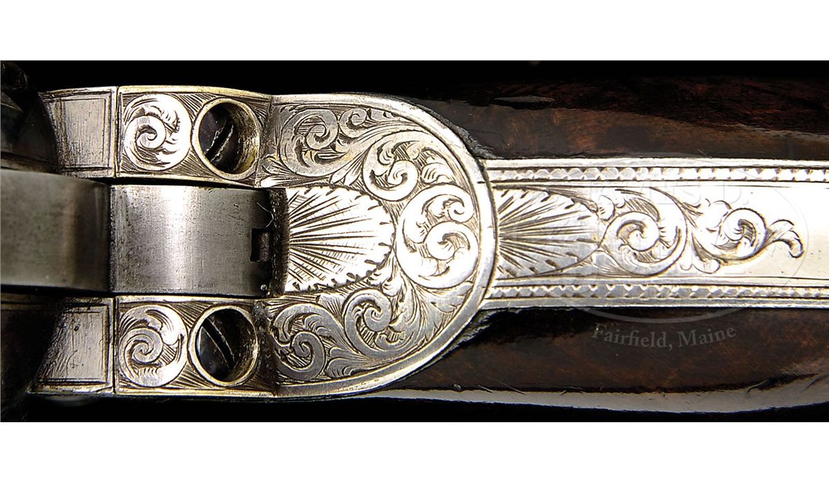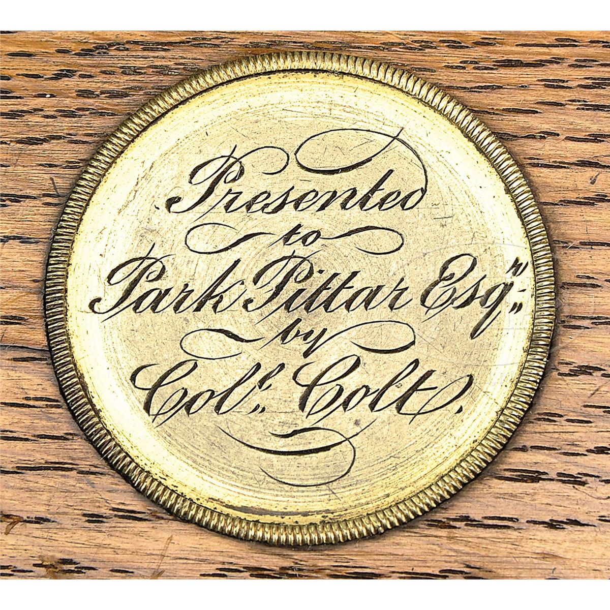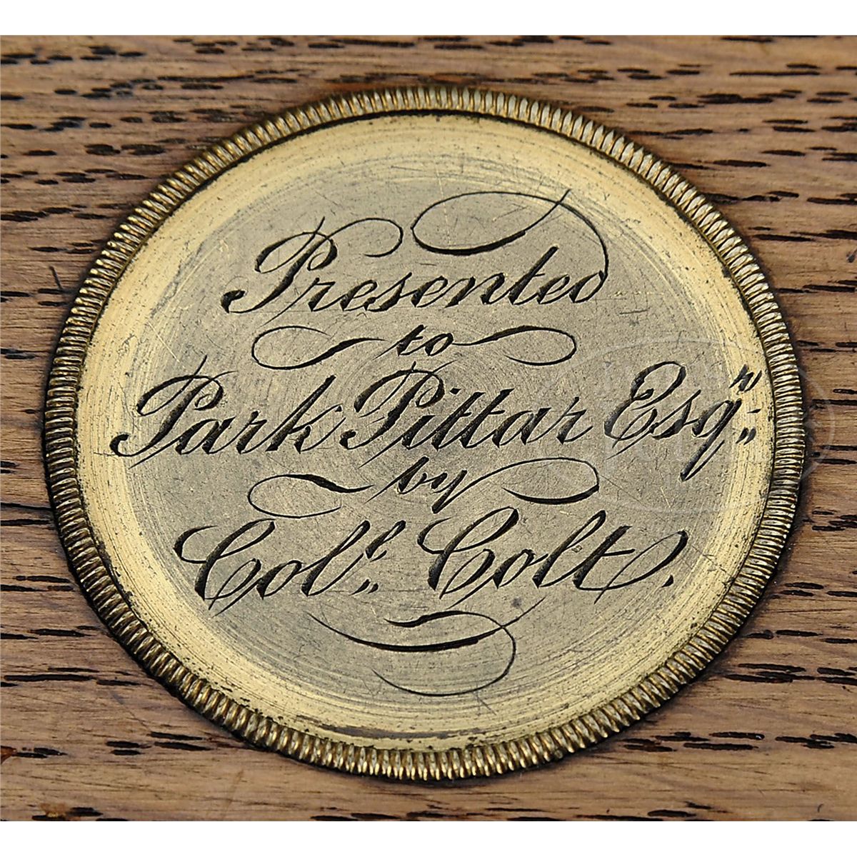 SN 207. Cal. 36. Blue & color case hardened with 7-1/2" oct bbl, brass pin front sight and New-York City address. Left side of bbl lug & cyl have British proofs. Left side of frame has "COLT'S PATENT" engraved in an ellipse. Cyl is usual 6-chambers with Ormsby Naval Battle scene roll marking and has all six safety pins serviceable. The silver plated brass trigger guard & backstrap contain a beautiful burl, deluxe, 1-pc walnut grip with matching SN in backstrap channel. Trigger guard is very small and square back and is a 2nd type revolver with screw over the wedge and a slotted cyl spindle with a thin lug. This beautiful revolver is wonderfully English engraved with very fine foliate arabesque patterns in full coverage on both sides of frame with foliate & floral patterns on recoil shields. Engraving extends over bbl lug and top side flats with matching patterns on rammer pivot and around muzzle. Bottom of rammer handle is engraved in leaf & vine patterns. Top of backstrap, backstrap ears and heel of backstrap, along with buttstrap & trigger bow are engraved to match the frame. The trigger guard is stamped with a small "2" below the SN. Accompanied by its orig English oak casing with brass medallion inlay engraved in period script "Presented / to / Park Pittar Esqr. / by / Col. Colt". Inside is lined in burgundy velvet and compartmented in bottom for the revolver, a Barlow bag shaped flask, a brass 2-cavity bullet & ball "COLTS PATENT" mold with sprue cutter, a lacquered tin of Eley's caps, an L-shaped nipple wrench/screwdriver, a pewter oil bottle, two combustible cartridges, a spare hammer spring and cast lead bullets & balls. It also has an orig functioning key. Items presented from "Col. Colt" are the most rare of the presentation Colts and are extremely rare on English items. Park or Parke Pittar was born in Dec. 1814 in Rio de Janeiro, Brazil and died in 1884 at age 69. He was a businessman, entrepreneur and investor in a variety of companies; one of which was the Charles, Nephew & Co. in Calcutta, India which he and his uncle Charles Pittar founded in 1848 assuming the business of an older uncle. They were jewelers, watch makers, gold and silversmiths and became extremely prominent for high quality goods. They opened an additional shop in Simla, India and were also agents for the famous London firm of Elkington & Co. According to research material provided by the consignor, it seems likely that Col. Colt probably became acquainted with Park Pittar during the 1851 Crystal Palace World Exhibit in London. It is known that Col. Colt either sold or provided Dragoon revolvers numbers 10222 and 10223 which were also in the exhibit, to Charles, Nephew & Co. which is inscribed on the rear of the trigger guard. It is speculated that Col. Colt, not wanting to have his approx. 500 firearms inspected and marked by the Tower of London, possibly defacing or damaging them, agreed not to sell any of his displayed firearms within England, but it is believed that he sold and presented a number of those arms to high ranking political persons, military officers and other important people who could aid in promoting his company outside of England. Charles, Nephew & Co. of Calcutta was just such an entity and it is known that they did distribute firearms. So, the logical conclusion is that once the exhibit was finished Col. Colt presented the 1851 Navy being sold here to Mr. Pittar, probably in about 1853. Included in the information provided is a list of seven 1851 London Navy revolvers that are engraved and/or presented, including this revolver with only two having the square-backed trigger guards and the other 5 having small rnd trigger guards. SN 209 is listed as being engraved and nearly identical to this revolver and it also has a small square-back trigger guard. This information is compiled by renowned English collector and dealer Pete Holder. There is also a 1993 dated letter from renowned collector/dealer Joseph G. Rosa wherein he discusses the nearly identical similarity between this revolver and SN 209. He states that the use of the square-back trigger guard intermittently in these early English Navys was simply cleaning up old parts. Additionally accompanied by a handwritten letter from renowned Colt researcher and author, R.L. Wilson, wherein he describes the gun and states that it was presented in 1853. There is a plethora of information regarding the family and history of Park Pittar and some of his business dealings. CONDITION: Very fine to extremely fine. Bbl retains 70-75% glossy orig blue with some light cleaning on both side flats; rammer & handle retain about all of their orig case colors, moderately faded; frame retains about 50-60% faded case colors and the hammer smoky case colors; cyl retains 60-70% strong English blue and about 95% Ormsby Naval Battle scene with one cleaned area and one thin spot; trigger guard & backstrap retain just about all of their orig silver plating, a little thin on the heel with brass showing through on trigger guard. Grip is sound with a few light nicks & dings, showing light edge wear and retains most of its orig varnish. Mechanics are fine, strong sharp bore with a few small scattered spots of pitting. Case is extremely fine with only a few minor nicks & scratches and retains virtually all of its orig varnish; interior is heavily faded to a light rose color with moderate soil; flask retains most of its orig. finish on the body and about 60% gold wash on collar & spout; mold is crisp with balance of accessories fine. A truly exceptional & rare set. 4-48355