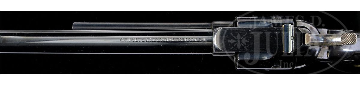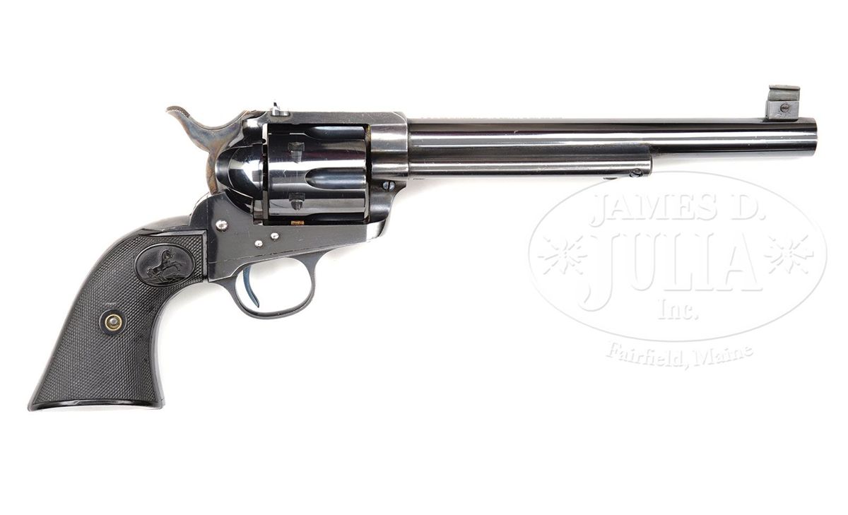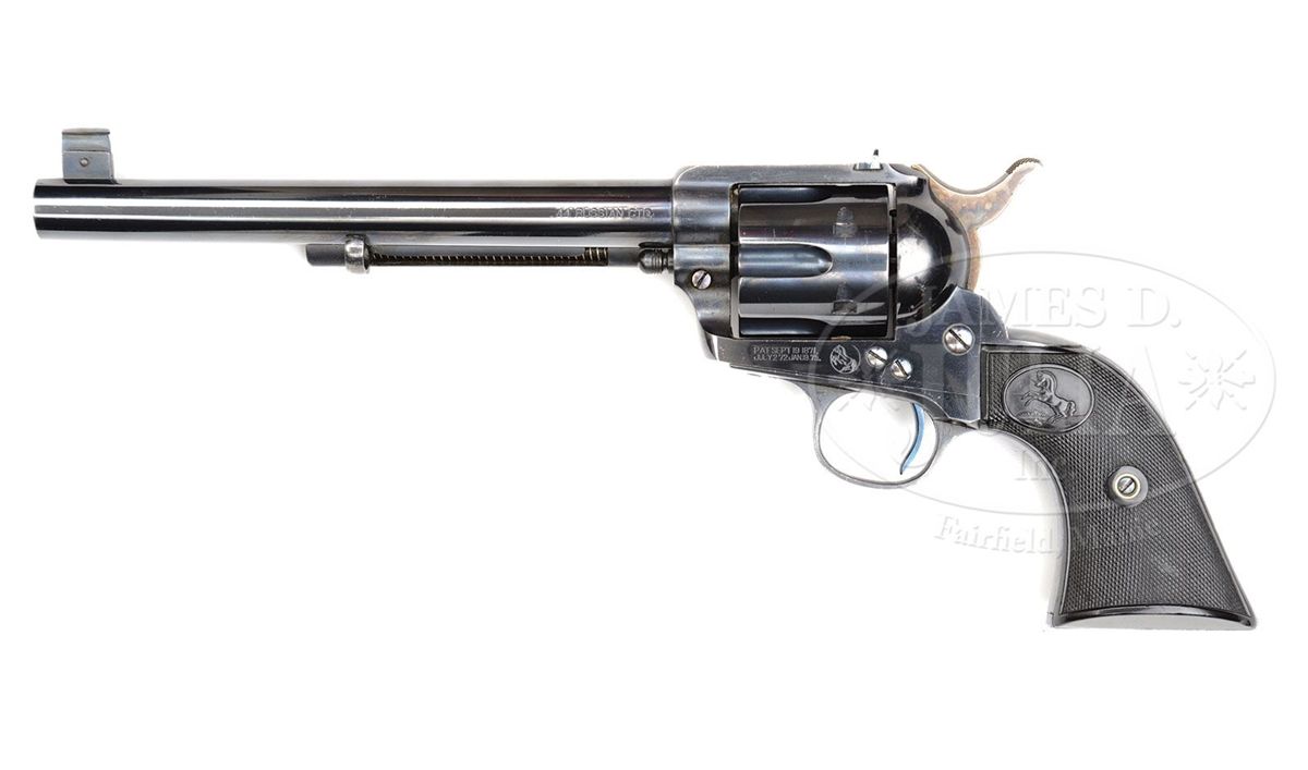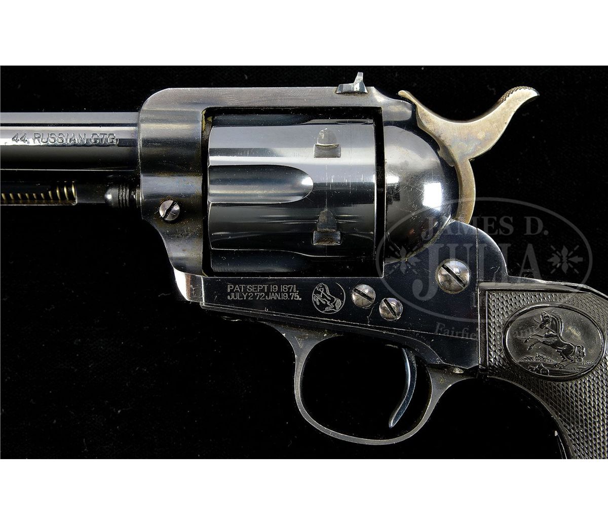 SN 317022. Cal. 44 Russian/S&W. All blue finish with 7-1/2" bbl with rare Metford rifling, rectangular base target front sight and 1-line block letter address with cal. marking on left side. Frame is flat top style with fixed target sight. Left side of frame has the 2-line 3-patent dates and Rampant Colt in the circle. Mounted with 2-piece Rampant Colt hard rubber grips that are numbered 351636 and have the initials "DJ scratched inside. Accompanied by a Colt Factory letter which identified this revolver in cal. 44 S&W, with 7-1/2" bbl, blue finish, stocks not listed, and shipped to A.B. Cole, address unavailable on January 30, 1912 in a 1-gun shipment. An internet search disclosed that Alson B. Cole (1854-1916) was born in Indiana and in 1873 moved to Nebraska where he apparently worked on an inventions of or improvement on radio vacuum tubes and wrote a treatise on the Audion tube for receiving radio time signals. While this is not a positive identification of the owner, it is very likely given his location in the west that he was the purchaser of this revolver. According to Colt Peacemaker Encyclopedia, Cochran, Metford rifling was very popular in Great Britain and is found in only a few British Caliber Single Action Colts. CONDITION: Extremely fine, plus. Overall factory conditions, retains about 99% crisp, glossy orig blue with faint sharp edge wear and very slight thinning to the recoil shield. Hammer retains about all of its very bright case colors, cylinder also retains about all of its brilliant blue and appears to be unfired. Grips are sound, showing very light diamond point wear. Mechanics are crisp, brilliant shiny bore. 4-49409 JR305