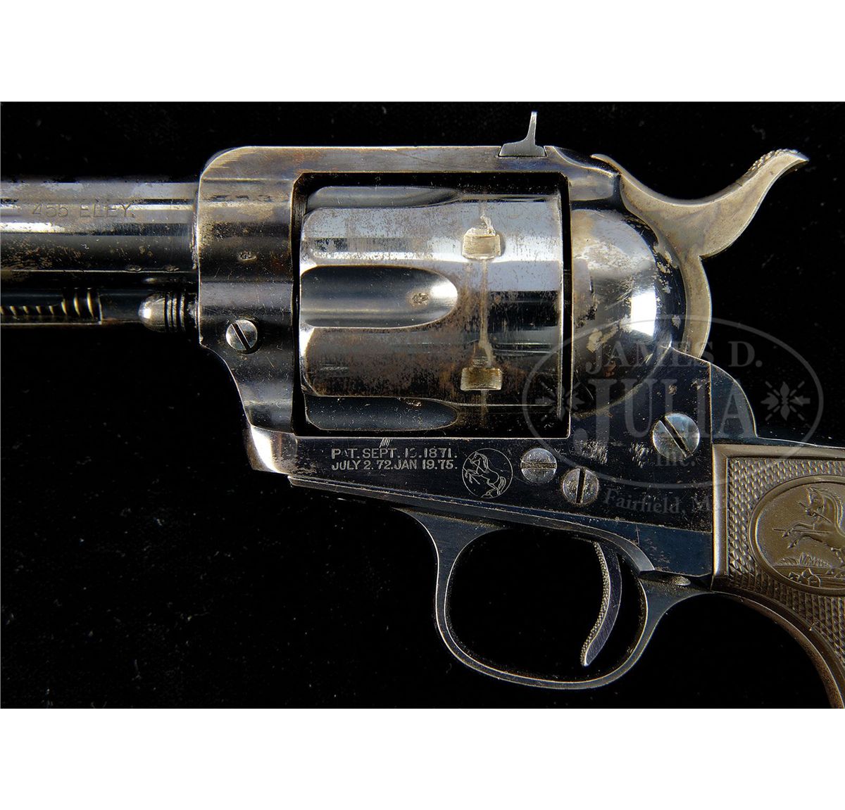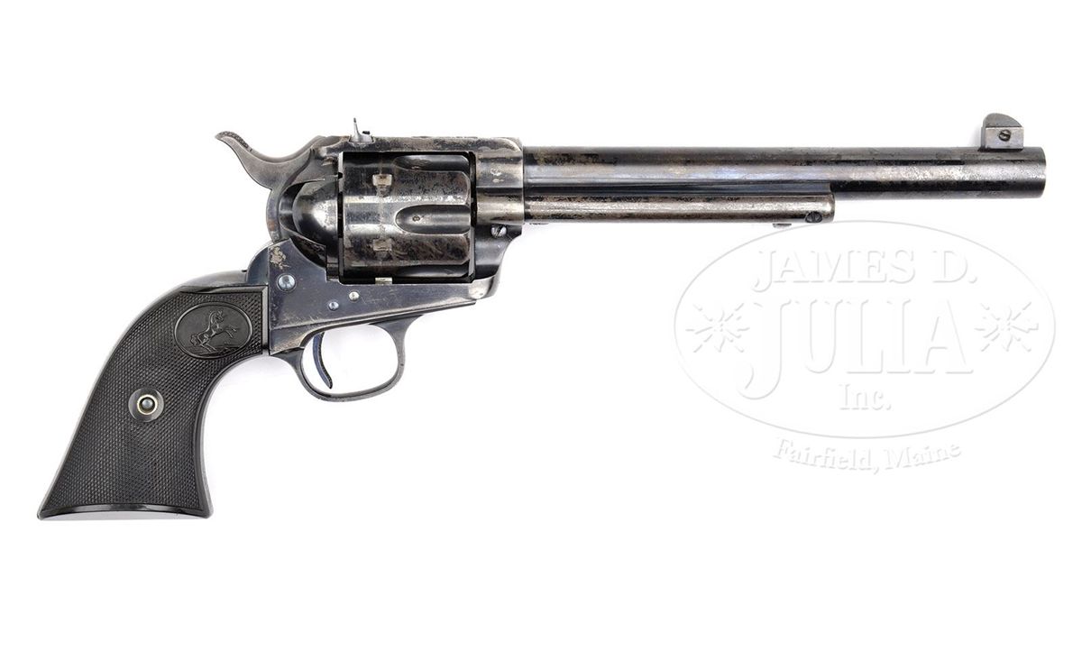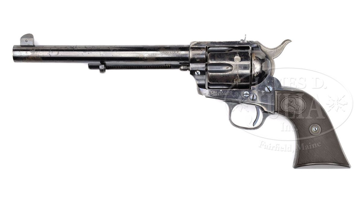 SN 162897. Cal. 455 Eley. All blue finish with 7-1/2" bbl, target front sight and 1-line block letter address with caliber marking on left side. Top strap is flat style with adjustable square notch sight. Left side of frame has 2-line, 3-patent dates and rampant Colt in a circle. Hammer is color case hardened and the trigger is fire-blued with checkered face. Mounted with 2-pc rampant Colt hard rubber grips matching numbered to this revolver. Left side of the bbl & frame and cyl in the flutes has tiny British proofs. Bore has the very rare Metford rifling. According to the book Colt Peacemaker Encyclopedia, Cochran, of the 914 flat top target model single actions produced, only 37 were made in caliber 455 Eley. Also according to the referenced publication, Metford rifling is found only on a few British caliber revolvers. Accompanied by a Colt factory letter which identifies this revolver in caliber 455 Eley with blue finish, bbl length & type of stocks not listed, shipped to Colt's London Agency on May 8, 1902 in a 6-gun shipment. Although shipment was not made until 1902, the frame was manufactured in 1895. CONDITION: Fine to very fine. Bbl retains about 60% glossy orig blue with the balance flaked, not worn, to a medium patina; ejector housing retains about 50% glossy orig blue, primarily in the gullets; frame & back strap retain about 70% glossy orig blue with the balance flaked to a light patina; trigger guard retains strong orig blue with the front strap flaked to a medium patina; trigger retains most of its orig fire blue and the hammer most of its orig case colors, moderately faded; cyl retains about 40% orig blue with the balance flaked to a medium patina, strong & bright in the flutes; screws are crisp and retain most of their orig blue. Grips are sound showing very light diamond point wear with the left side turning slightly chocolate. Mechanics are crisp, brilliant shiny bore. The loading cutout in the right recoil shield has had a notch filed in the lower front edge, ostensibly to speed up loading & ejecting empties. It is not visible with the loading gate closed. 4-49004 JR62