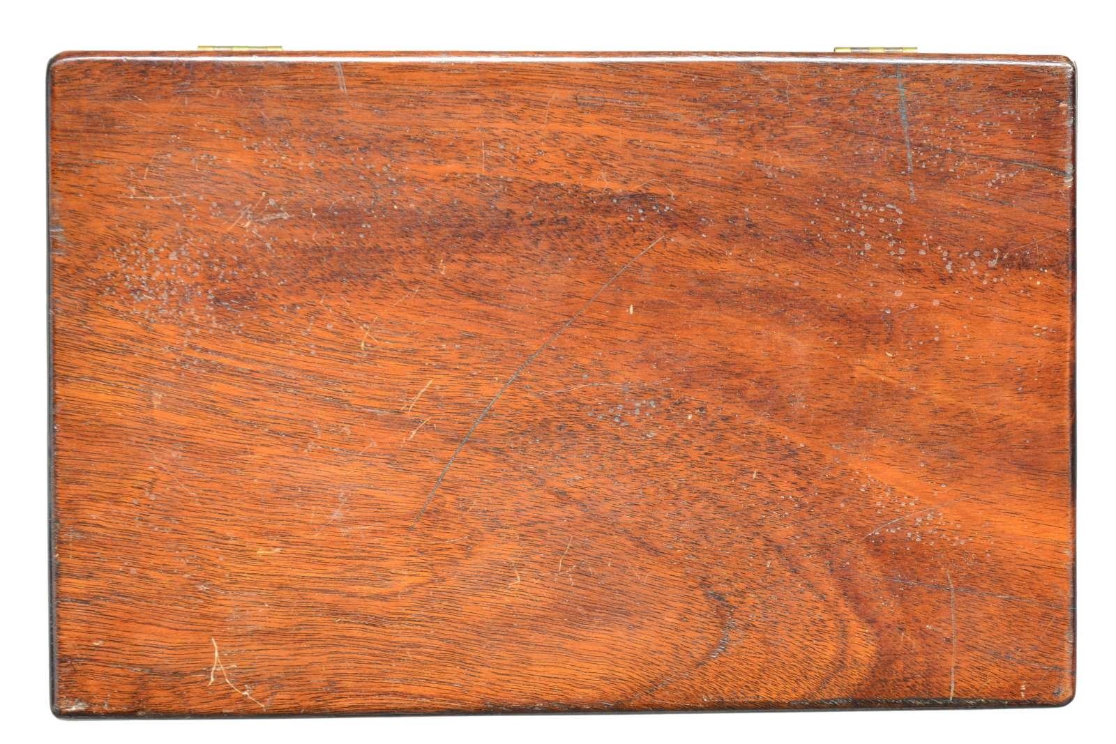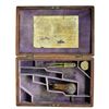 Mid-19th C. The finely appointed case w/ orig. paper instruction sheet on lid interior, retains orig. compartmented interior w/ lavender velvet liner. It is offered w/ bullet mold, later percussion caps tine & a nice copper powder flask w/ a displayed eagle decoration on front & verso. SIZE: 2" H x 12" L x 8" H. CONDITION: case retains original surface w/ mellow warm patina. (02-15307). $3,500-5,000.