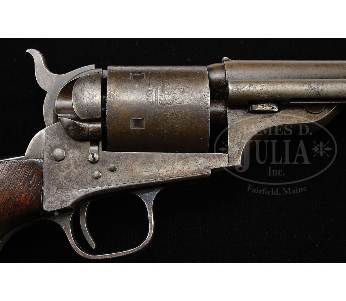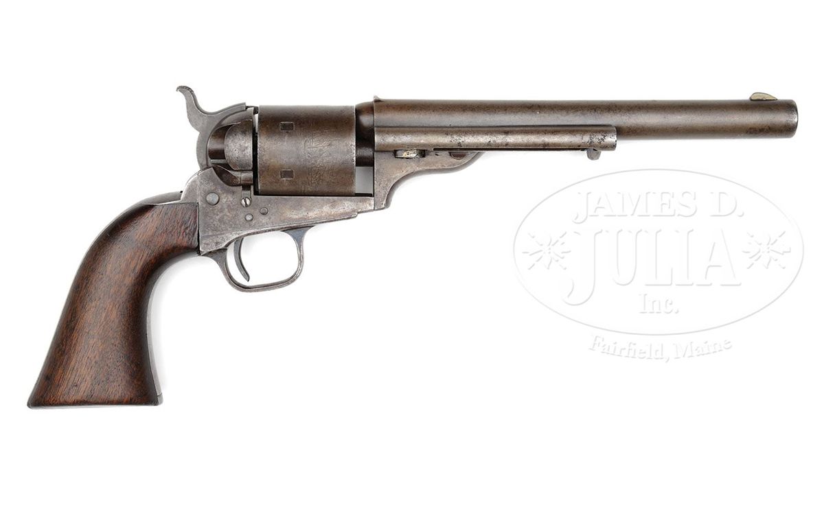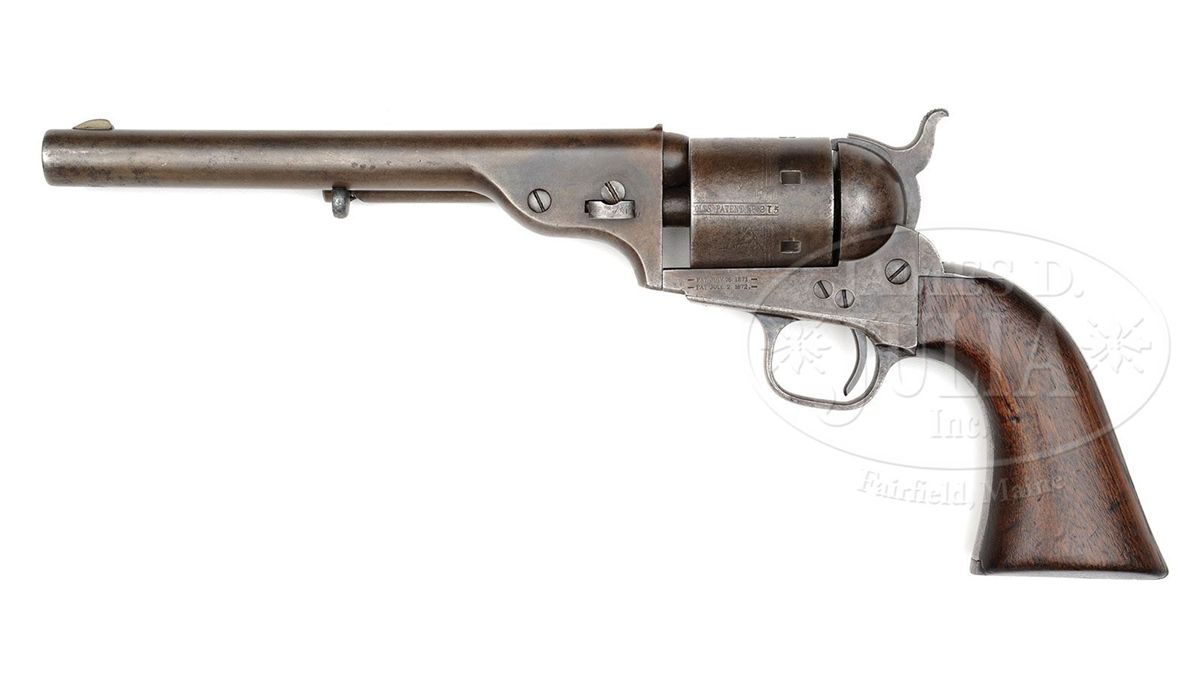 PLEASE NOTE (10/2/13): Caliber is 44 RF Henry not 41 RF Henry. SN 3215. Cal 41 RF Henry. Blue finish with 7 1/2" rd bbl, German silver front sight and 1-line New-York U.S. America address. Rear sight is integral with top rear of bbl. Right side of the bbl lug has an attached ejector with bull's eye ejector rod head. Cylinder is unfluted and straight sighted with Ormsby Naval battle scene roll marking and rectangular stop notches without approaches. Left side of the frame has the 2-line 1871 and 1872 patent dates. The blued steel trigger guard and backstrap contain a smooth 1-pc walnut grip. Firing pin is attached to the hammer nose on the left side and secured with 2 rivets. Loading gate is in the right recoil shield with exposed spring. These revolvers were Colt's first truly successful attempt at a large bore cartridge revolver which were readily accepted by the American buying public and were immediately placed into service on the American Frontier. There were only about 7,000 of them produced in the 1871-1872 period and were supplanted by Colt's Single Action Army revolver. A very large number of these revolvers found their way to Mexico and other South and Central American countries where they remained in service many years along side the Henry and Winchester Model 1866 rifles and carbines. Large numbers of these revolvers had their bbls reduced during their period of service outside of the US and nearly always are found in a poor state of repair. CONDITION: Fine, all matching except wedge and grip which are properly unnumbered. Traces of orig finish remain on the bbl lug and frame with stronger amounts of blue on the trigger guard and backstrap. The cylinder and balance of the metal is a smooth, even plum brown patina. Grip has slightly chipped toes and shows heavy wear with a hand worn patina. Mechanics are fine. Strong bore with heavy pitting. 4-48910 JR45