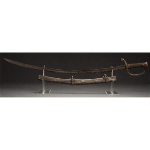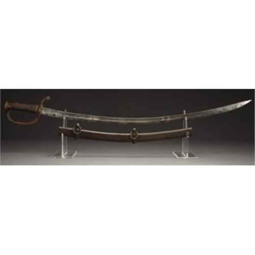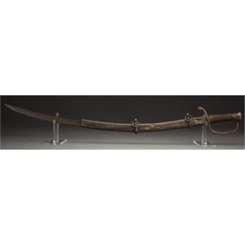 <B>RARE CONFEDERATE MANUFACTURED ‘DOG RIVER’ LIGHT ARTILLERY SABER AND SCABBARD</B></I>. - Although even approximate figures are unknown these artillery sabers were manufactured by the Confederates in very limited quantity, with surviving specimens being quite rare. The somewhat flat brass pommel cap and the classic d guard are quite heavy with crude fit and finish and a number of casting flaws. As with most of these swords, the underside of the guard has a recess to accept the top of the scabbard, which is made without a throat. This detail was used on the early US M1840 sabers and apparently was favored by the Confederates as it negated the necessity of a separate throat on the scabbard. Interestingly on this example a leather washer has been fitted inside of the recess. The wooden grip is channeled to accept the single strand iron wire and the grip was originally wrapped with oil cloth. The deeply curved 31 ¼” blade exhibits numerous forging flaws and has a crude unstopped fuller that extends to within 8” of the tip. The iron scabbard has a crude soldered lap seam and rather crude heavy brass ring mounts with a prominent median ridge. The carrying rings are iron. There is no throat. Regretfully the last approximately 12” of the scabbard has been broken off and is missing. Really a wonderful untouched example of this very rare Confederate enlisted saber that absolutely ‘whistles Dixie”.<BR><BR><B>Condition:</B></I> Brass hilt with deep dark untouched patina, really great. The grip is sound, wire tight and retains approximately 30% of the original oil cloth wrap, showing very heavy use. The blade is also untouched and gray with scattered medium pitting toward the tip, a bit heavier on the reverse. The missing piece of the scabbard has obviously been gone for a long time, possibly snapped off during the period of use, and it is this exposed section of the blade that exhibits the pitting. The scabbard is very dark, untouched, with some scattered light pitting. The brass ring mounts and iron carrying rings are black and untouched.<BR><BR><b>Shipping:</b> Requires 3rd Party Shipping (<a target="_blank" href="http://www.heritageauctions.com/common/shipping.php">view shipping information</a>)