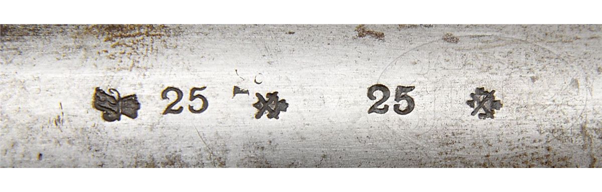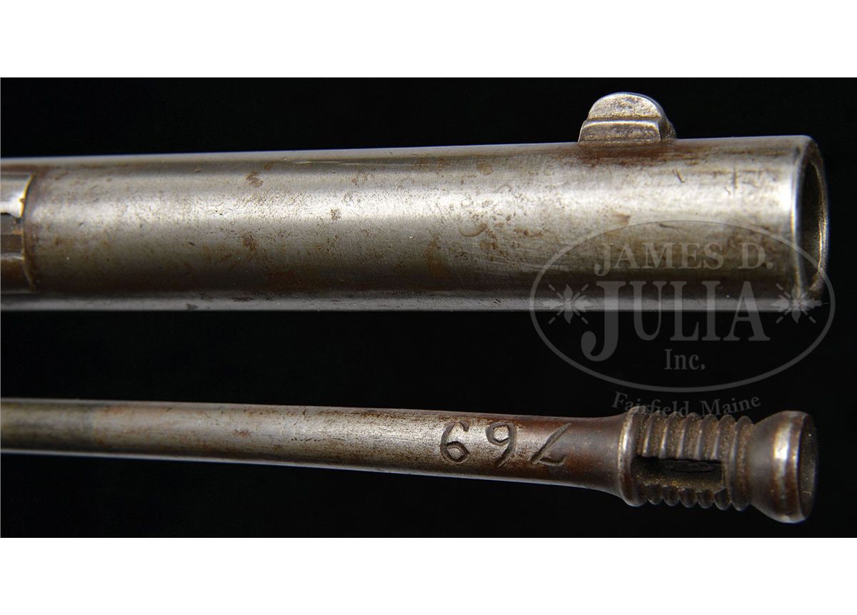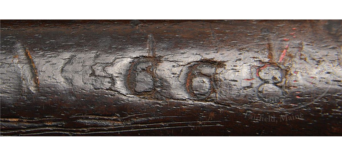 SN 668/769. Cal. 577. This is a rare iron mounted JS/anchor proofed model 1856 Enfield rifle with 33" bbl that was once in the collection of Wiley Sword and pictured in his text Firepower From Abroad. Enfield rifled muskets are scarce with JS/anchor marks and SNs but the rifles are much rarer and the iron mounted rifles are among the rarest of all Confederate arms. This gun is in fine orig condition as pictured on pp. 42 and 44 of the book mentioned. Ramrods with SNs are quite rare and no more than a handful of this model are known. The initials of the Confederate "JCM" who probably carried this gun are carved into the buttstock and this carving is also shown in Mr. Sword's text. This is a scarce and fine example of a rare Confederate used rifle that most examples did not survive. PROVENANCE: Collection of Wiley Sword. CONDITION: Very good to fine overall. SN 668 is stamped on bottom of buttstock just behind an easily discerned JS/anchor marking as can be seen in photographs. SN 769 is cut into ramrod and though numbers don't match they appear to have grown up together as patina and color match well. Metal overall is gray/brown with old areas of cleaning. Markings in lock and bbl are very good and crisp as can be seen in photos. Stock is sound and solid with numerous dings and dents (especially on bottom of buttstock rear of stock maker's cartouche) with some erosion on top of comb of buttstock. Mechanics are very good and functional. Bayonet stud on bbl has been removed. Bore is very good with well discerned rifling. 4-49416 JS208
