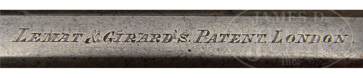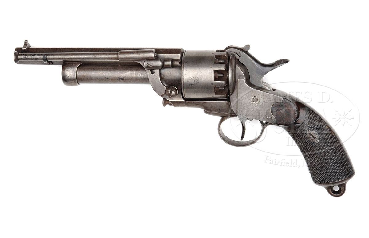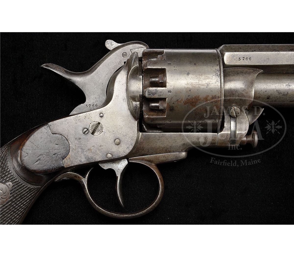 SN 5266. This is among the rarest variations of LeMat revolvers. Only two or three LeMat revolvers are known in this serial range and unlike the Tipping & Lawden Confederate Naval contract (SN 8000-9000) which has the Colt style ratchet system; this early London made LeMat retains the Paris style reciprocating pin mechanism for rotating cyl. Included with this gun are two letters from LeMat expert Cliff Young stating that this is one of only two guns in this serial range and the other gun SN 5208 had a replaced loading assembly and misnumbered cyl. This gun appears orig and authentic in all regards, in beautiful condition with crisp markings and some orig finish. This is a true rarity in Confederate LeMat variants in fine condition that would be difficult to improve on. PROVENANCE: Fred Edmunds Collection. CONDITION: Metal overall is gray with areas of staining and pitting. There are traces of blue finish in protected areas. Gun is mechanically sound and markings are crisp and well defined and matching throughout. Stocks are sound and solid with well discerned cross hatching with several storage dings, dents, and gouges. 4-49689 JS214