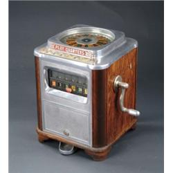 RARE COUNTERTOP CAILLE ROULETTE. An extraordinary and amusing coin operated gambling machine that is able to play one to six coins at once, and if all the slots are filled the player is a guaranteed winner! This machine is in very fine to near mint all-original condition!!! It has been several years since we have seen one of these rare countertops offered publicly. Certainly a fraction of the cost of a floor model, which will sell for $100,000 plus in today’s current market!! The lithographed tin dial, indicating colors and payout amounts, atop the rotating dial has nearly nonexistent fading. The original wood finish has minimal darkening and the aluminum and nickel on the machine are in near excellent condition. Internal mechanism is very clean and paper labels are intact on inside of rear door. The machine is in fine working order. One seldom receives the chance to buy either the table or floor model example at auction. SIZE: 16” t. x 13” w. x 13” d. CONDITION: Overall near excellent original condition. JL 1-4549 (10,000-30,000)