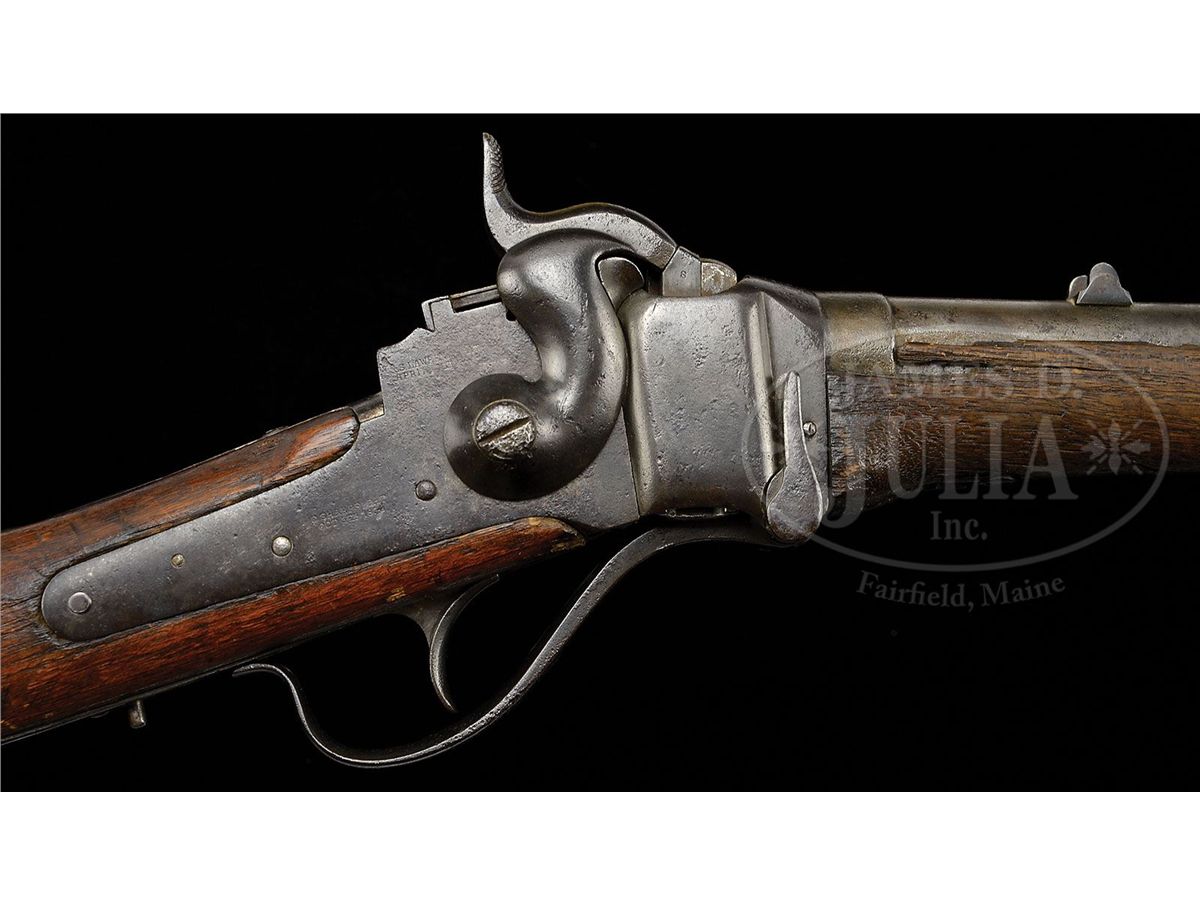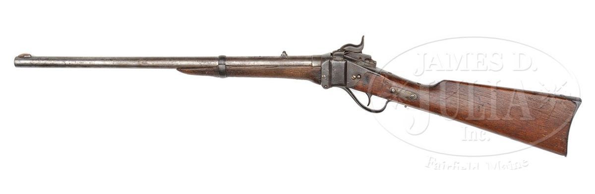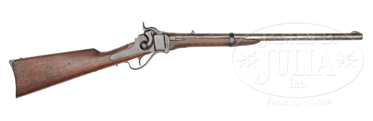 SN 37. Cal. 50-70. Typical Indian used carbine with 22" rnd bbl, homemade Rocky Mountain style front sight blade, missing the Lawrence patent ladder rear sight. Sling, ring & bar were removed from the left side in typical Indian fashion. Lock plate has faint orig markings and the SN has been removed. Mounted with straight grain, uncheckered American walnut with rnd Sharps forearm secured with a single band & straight stock with Sharps carbine buttplate. This carbine shows incredible hard frontier use with extraordinary saddle bow wear on the forearm. Bottom of the bbl under the forearm is stamped with "37". This carbine is reliably reported as having been purchased by a collector named Don Rickey in 1951 from an Indian family at Crow Agency, Montana, while he was the historian at the Little Bighorn Battlefield. He later reports that while working for the Bureau of Indian Affairs (BIA) in Washington, he discovered a contract for the purchase of 14 Sharps rifles to be delivered to Crow Agency in 1875. Accompanied by a letter dated Dec 9, 2004 to renowned Custer historian and collector, Glen Swanson, from another Custer Battlefield collector and historian, Dick Harmon of Lincoln, Nebraska wherein Mr. Harmon relates his knowledge of the history of this carbine. In this letter, he refers to the "35", obviously a mistake on Mr. Harmons part, as being stamped on the bottom of the bbl under the forearm which is simply an error on his part. He states that he believes this was done by the Crow Agency as a means of identifying it as a BIA firearm. He notes also that the sling ring bar has been removed "which was a very commom practice by the indians". Mr. Harmon further relates that Mr. Rickey and his son fired this carbine and so did Mr. Harmon. Also accompanying are several copies of pages from the BIA contract book #15, Crow Agency, Montana 1875, pg 306. These copies disclose a contract with Walter Cooper of Bozeman, Montana Territory "to deliver to Crow Agency, Montana on or before Fifteenth day of May, 1875, Fourteen (14) rifles known as Sharps Army rifle adapted to the 50 caliber C.F. cartridge, the same to be new and in good order and condition, at the rate of thirty four dollars and ninety three cents ($34.93) each". While this documentation does not specifically address a particular rifle or carbine, given the historical provenance there can be little doubt that this carbine did originate at Crow Agency and the probability is that it was one of the 14 purchased from Walter Cooper, most likely to arm Crow Agency police. Equally true, there could be no doubt whatsoever that this carbine saw hard and continuous use by Indians. That it is not tack decorated lends credence to the idea that it was used by Indian police. CONDITION: Poor. No orig finish remains with the bbl being a cleaned gray patina with heavy pitting. Receiver, lock plate, lever, hammer & buttplate all retain a very dark brown patina with moderate to heavy pitting. Forearm has a major split at the bottom rear end with slivers of wood missing and shows incredible saddle bow wear on the bottom with a couple of other cracks & slivers of wood missing. Stock has a crack in back of the top tang and a couple of hairlines back of the lockplate with several weather grain checks & retains a hand-worn patina. Sling ring bar is missing as noted and the lever latch is missing, along with the rear tang screw. Mechanics are fine. Worn, very dark bore. 4-49072 JR277