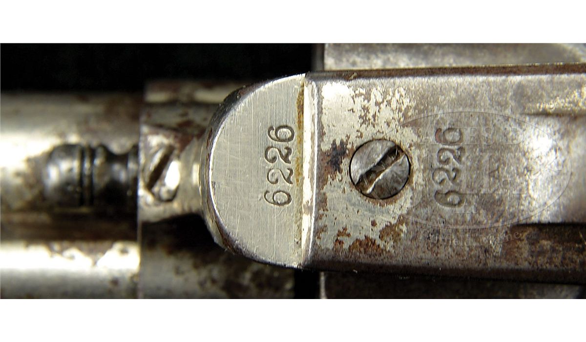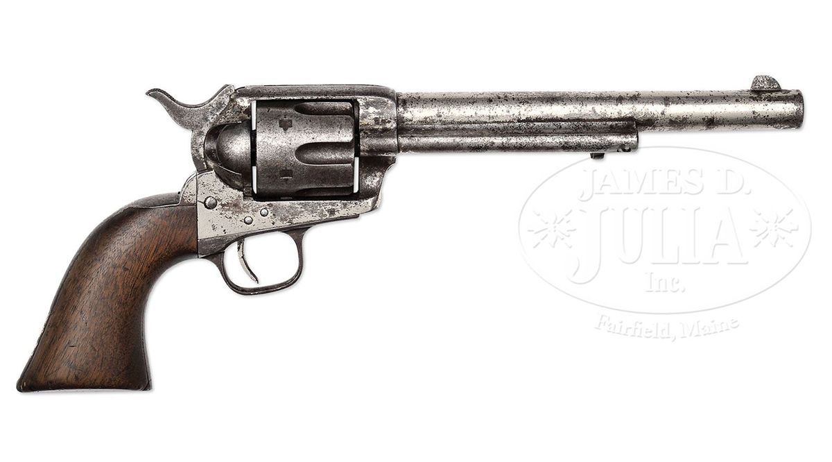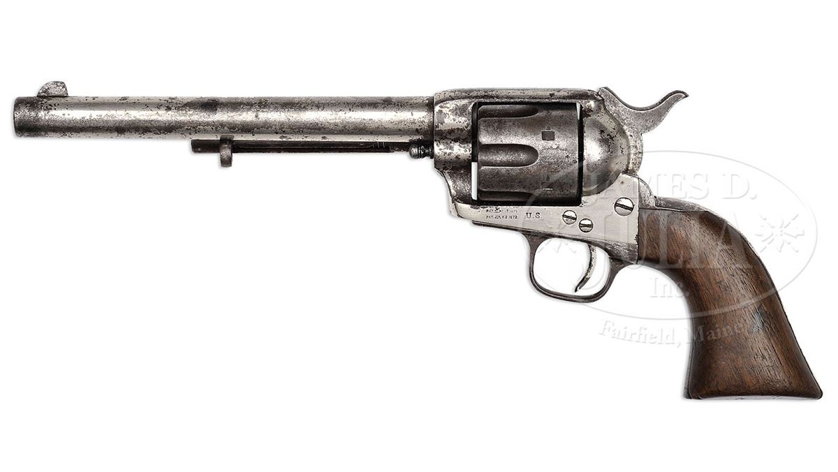 SN 6226. Cal. 45 Colt. Nickel finish with 7-1/2" bbl, slightly altered front sight and 1-line script letter address with serifs. Left side of frame has 2-line patent dates and a small "U.S.". Mounted with orig 1-pc walnut grip with matching SN in back strap channel. Left side of grip has the partial outline of a cartouche which would have been "OWA" (Orville W. Ainsworth) and there are small "A" inspector initials on various parts. Ejector housing is first type with bull's eye ejector rod head. While it is well known that the Ordnance Dept. did not order Colt revolvers nickel finished, it is equally well known that Springfield Arsenal did custom order nickel finish for certain Cavalry officers. It is also known that in order to discourage theft among his troops Lt. Col. Custer, during the Civil War, ordered companies to distinctively mark their firearms. Later, when he had been assigned to the 7th Cavalry at Fort Abraham Lincoln, he ordered his Indian scouts' revolvers to be nickel plated. This work was probably done by the Adams Plating Company. In the instance of this revolver the hammer & trigger are nickel finish which indicates that they were not plated at the factory because the Colt factory finished triggers blue with blued screws and color case hardened hammers while the after-market plating did not follow those guidelines. This revolver is from Lot 6 which accounts for a large number of known 7th Cavalry revolvers and all the above lends strong probability that this may have been one of the revolvers issued to Custer's 7th Cavalry Indian scouts. Accompanied by a 2-page letter from renowned Colt historian & author, John Kopec, wherein he details much of the above information. Regardless of the possible 7th Cavalry/Little Big Horn connection, this revolver almost positively was issued to one of the fighting cavalry regiments in the west engaged in the Indian Wars. CONDITION: Very good, all matching including bbl, cyl & grip. Bbl retains about 50% dull orig nickel mixed with medium to dark patina and shows heavy wear on the left edge of the muzzle; frame retains 60-70% strong orig nickel mixed with dark patina; trigger guard retains nickel on the bow with the balance a medium to dark patina; back strap retains about 60% orig nickel mixed with dark patina; cyl is a gray/brown patina showing moderate to heavy wear; ejector housing retains 30-40% nickel finish. Grip has chipped toes and shows heavy wear with a fine hand worn patina. Mechanics are fine, strong bore with sharp rifling & scattered pitting. 4-48620 JR63