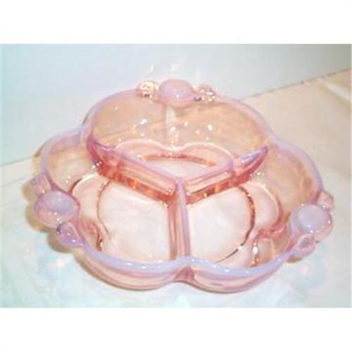 This quite RARE and very lovely Cranberry Pink Opalescent Canterbury Divided Relish is in SUPERIOR condition with no chips, cracks, or dings and it measures 7.25" wide and stands about 1.25" tall. Made by Duncan & Miller this is considered a very RARE find because of the color and the opalesence. Don't let it pass you by!!!!