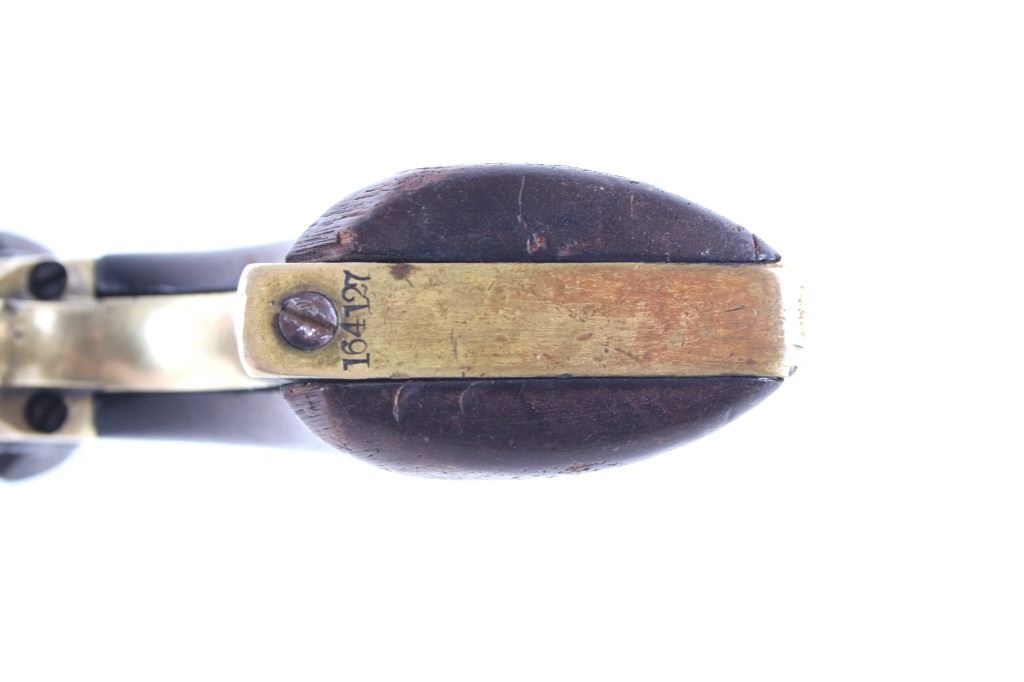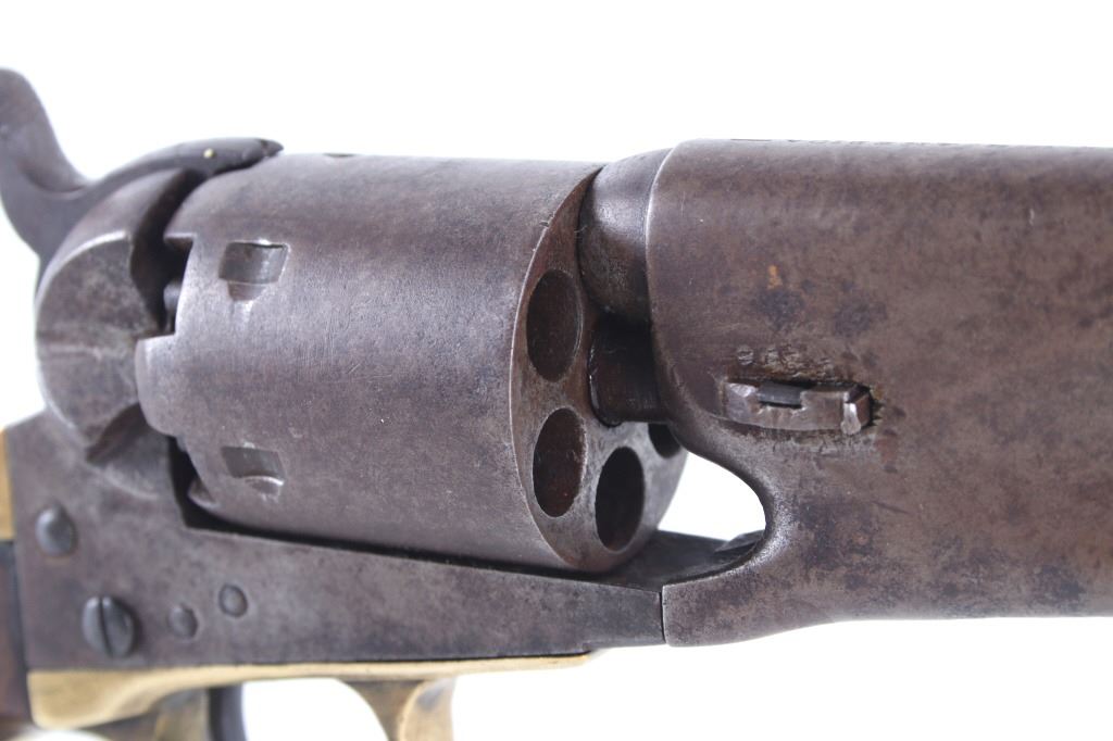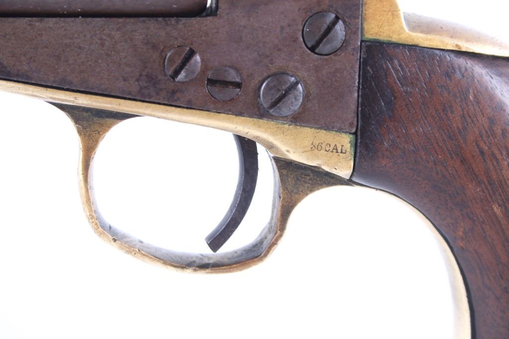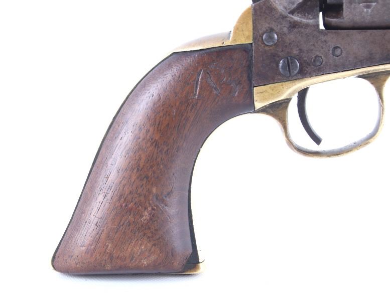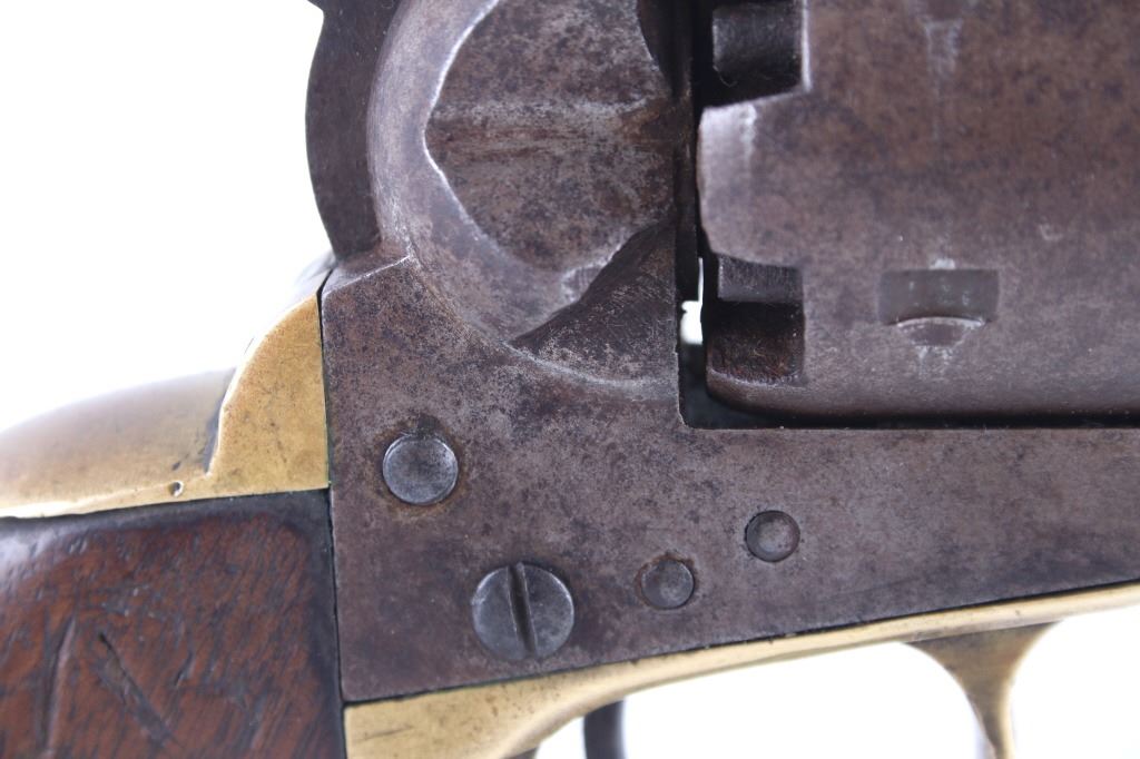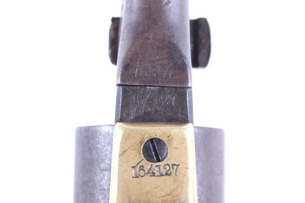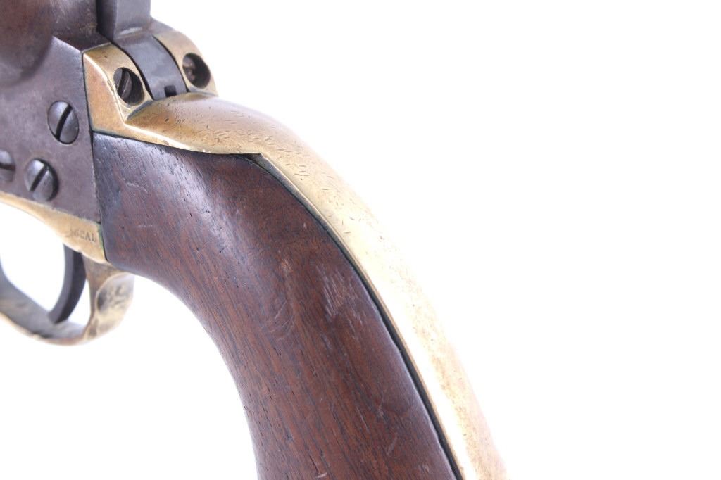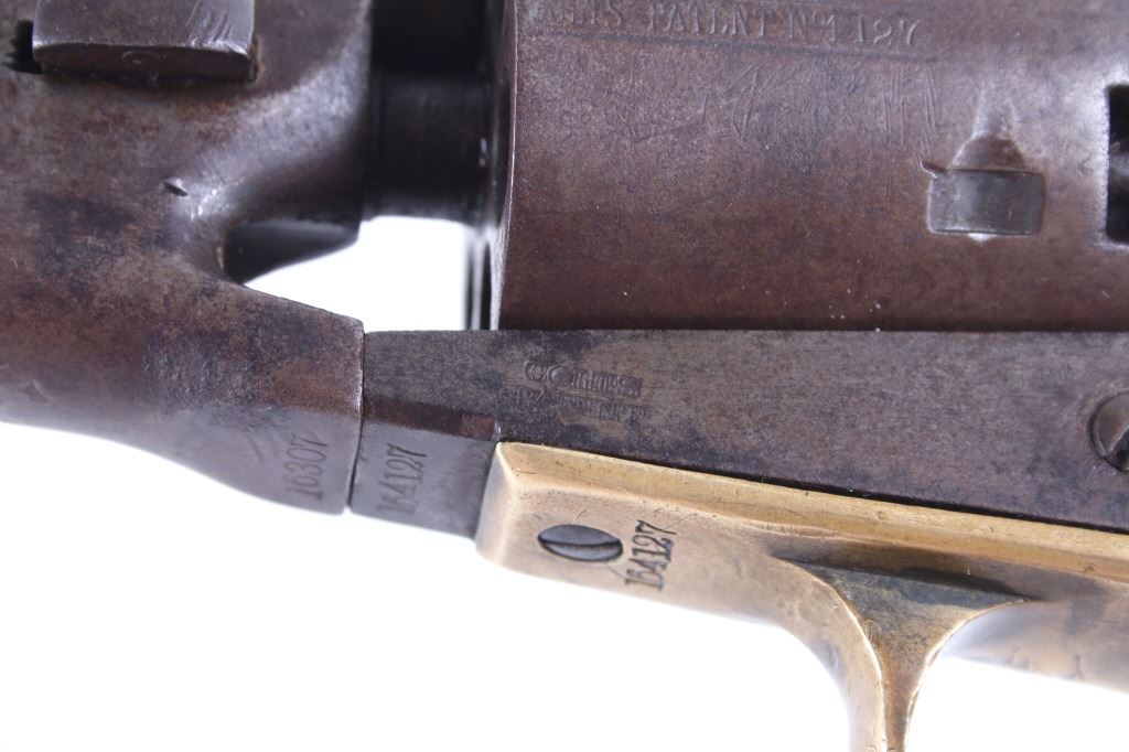 This is a very unusual late-American Civil War production Colt Model 1851 and Colt Model 1861 4-screw shoulder cut out factory revolver chambered in .36 caliber with a serial number of 164127 dating to circa 1863. This unusual example is believed to have been made in this form from the Colt factory with available parts for the U.S. Civil War Union war effort. The revolver shows the 164127 serial number on the frame, brass trigger guard, butt of the backstrap and on the cylinder. The barrel is a 7.5-inch round .36 caliber single line on the top of “- ADDRESS COL. SAML. COLT NEW – YORK U.S. AMERICA –“, with a serial number of 16307 dating to circa 1863 with the “creeping” or ratchet loading lever below (this barrel was only ever offered on the Colt Model 1861). The pistol is factory cut for a shoulder stock on the recoil shield and heel as well as has the long fourth screw in frame, both of which were factory options for the scarce shoulder stocks. Both the barrel, all the marked parts and frame were manufactured by Colt in 1863, during the Civil War. To further the unusual aspects of this firearm the piece does not have a serial number “S” or other designation for being shoulder stock cut and the back strap is solid brass and not steel. The cylinder is correctly factory engraved with a scene of the victory of the Second Texas Navy at the Battle of Campeche on May 16, 1843 by Waterman Ormsby. Cylinder is also marked, “COLT’S PATENT NO. 4127”. Frame is stamped, “COLT’S PATENT” (actually this is double stamped or over stamped) and the brass trigger guard frame is stamped, “.36 CAL”. The inside of the backstrap and inside of the original one-piece walnut wood Colt grips are not marked. One side of the grip has a unique AB or other carved initial or insignia on the right side, possibly from the original solider owner or for their unit. There is the possibility that this is a very scarce late-production Colt Model 1861 and was created using the remaining parts in circa 1873 as the serial numbers do extend to 338843, with only 38,000 1861’s being made. More than likely, this was made in the factory using available parts, in a rush to complete orders for the war effort, making this a truly unusual and scarce example.