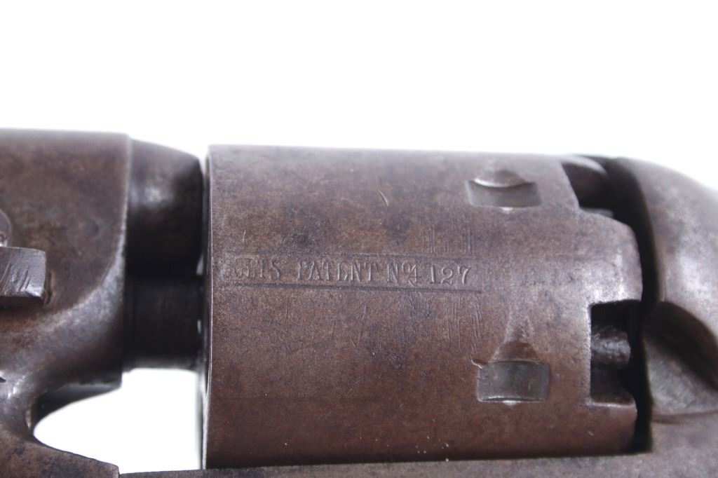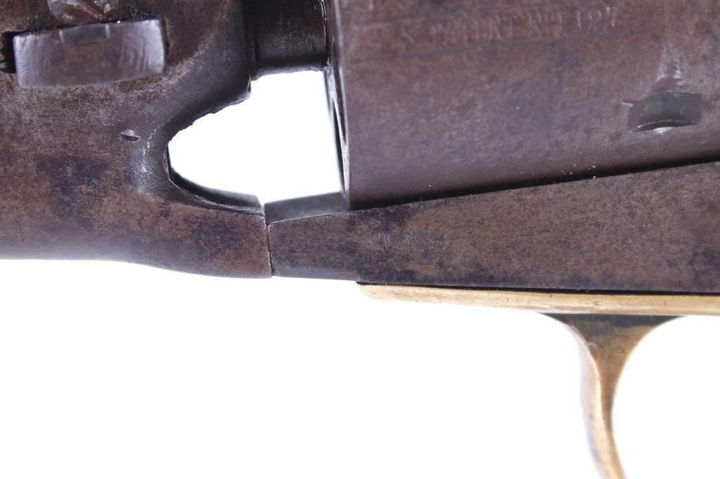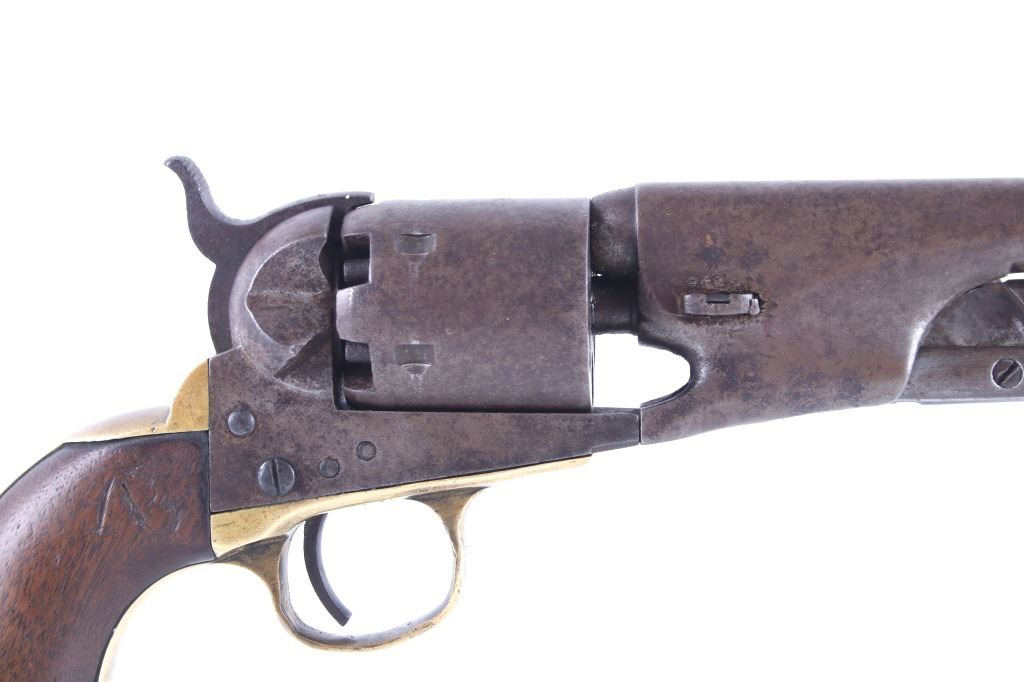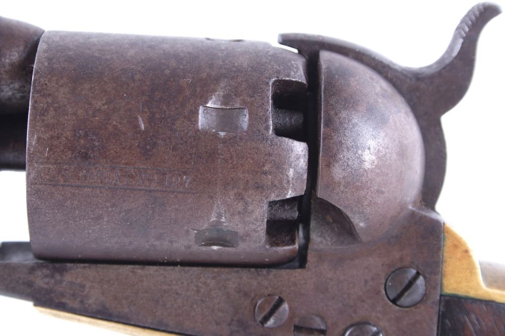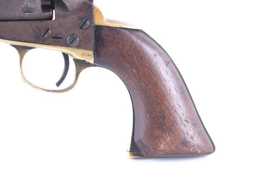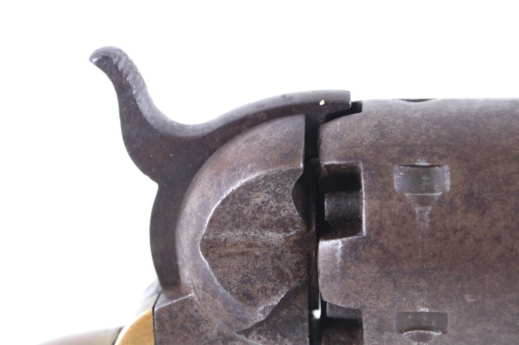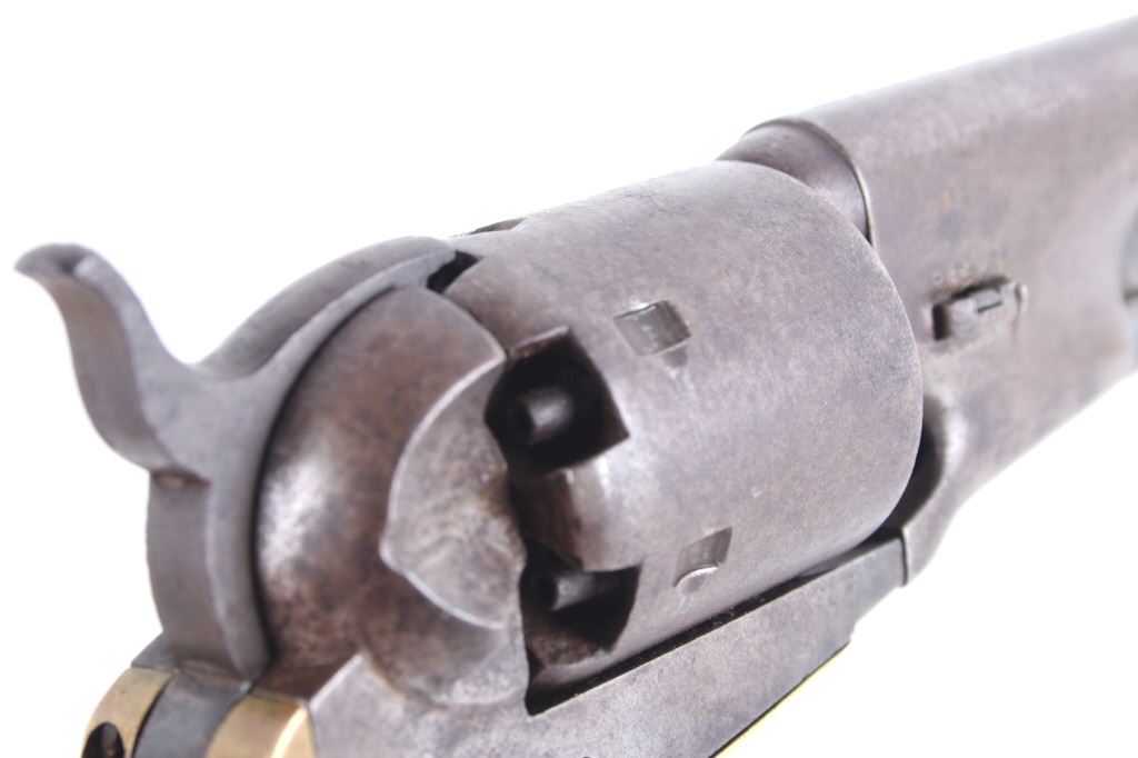 This is a very unusual late-American Civil War production Colt Model 1851 and Colt Model 1861 4-screw shoulder cut out factory revolver chambered in .36 caliber with a serial number of 164127 dating to circa 1863. This unusual example is believed to have been made in this form from the Colt factory with available parts for the U.S. Civil War Union war effort. The revolver shows the 164127 serial number on the frame, brass trigger guard, butt of the backstrap and on the cylinder. The barrel is a 7.5-inch round .36 caliber single line on the top of “- ADDRESS COL. SAML. COLT NEW – YORK U.S. AMERICA –“, with a serial number of 16307 dating to circa 1863 with the “creeping” or ratchet loading lever below (this barrel was only ever offered on the Colt Model 1861). The pistol is factory cut for a shoulder stock on the recoil shield and heel as well as has the long fourth screw in frame, both of which were factory options for the scarce shoulder stocks. Both the barrel, all the marked parts and frame were manufactured by Colt in 1863, during the Civil War. To further the unusual aspects of this firearm the piece does not have a serial number “S” or other designation for being shoulder stock cut and the back strap is solid brass and not steel. The cylinder is correctly factory engraved with a scene of the victory of the Second Texas Navy at the Battle of Campeche on May 16, 1843 by Waterman Ormsby. Cylinder is also marked, “COLT’S PATENT NO. 4127”. Frame is stamped, “COLT’S PATENT” (actually this is double stamped or over stamped) and the brass trigger guard frame is stamped, “.36 CAL”. The inside of the backstrap and inside of the original one-piece walnut wood Colt grips are not marked. One side of the grip has a unique AB or other carved initial or insignia on the right side, possibly from the original solider owner or for their unit. There is the possibility that this is a very scarce late-production Colt Model 1861 and was created using the remaining parts in circa 1873 as the serial numbers do extend to 338843, with only 38,000 1861’s being made. More than likely, this was made in the factory using available parts, in a rush to complete orders for the war effort, making this a truly unusual and scarce example.