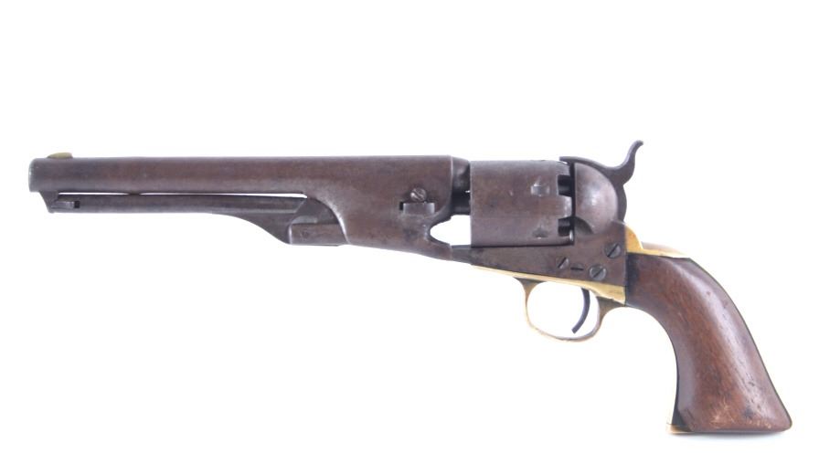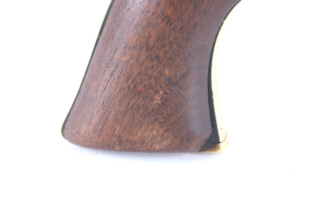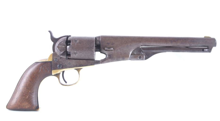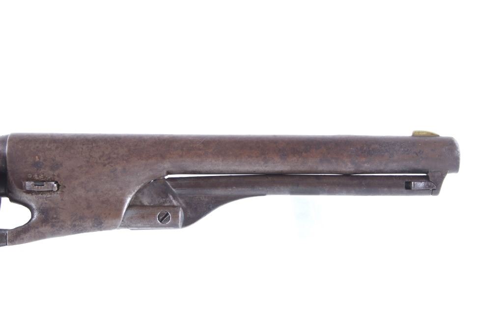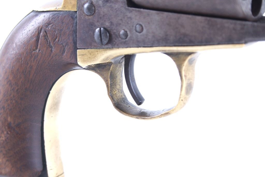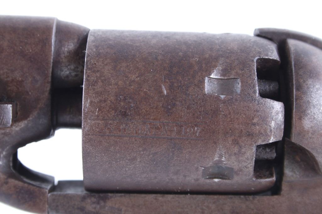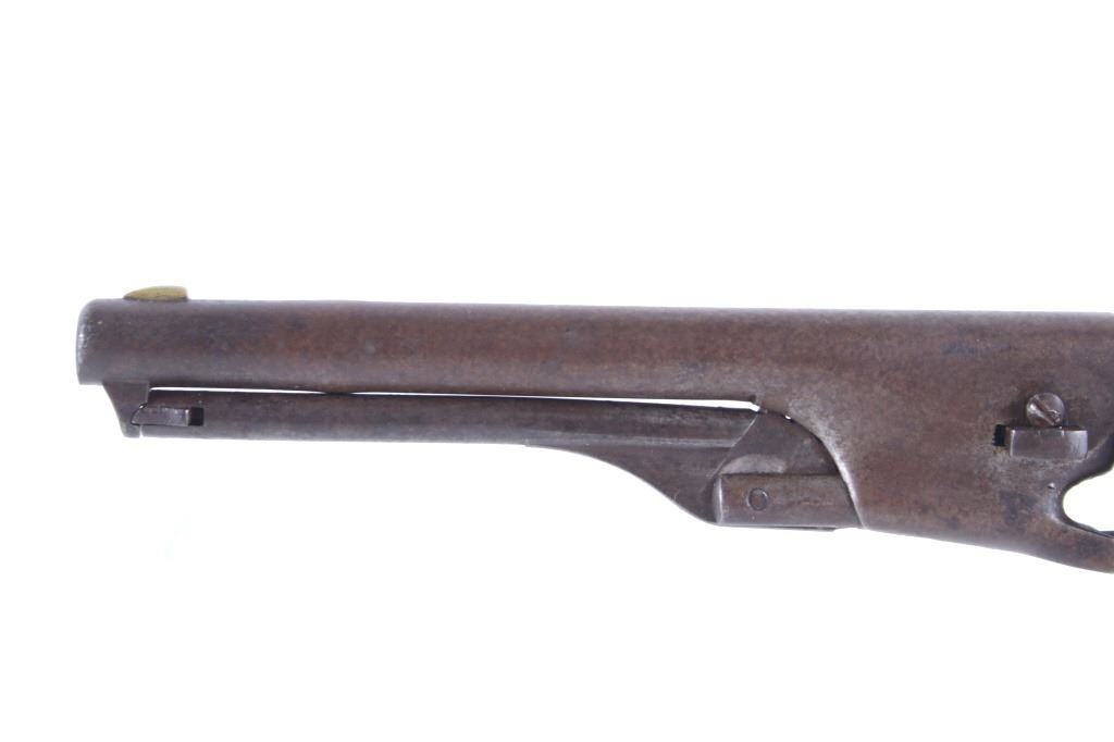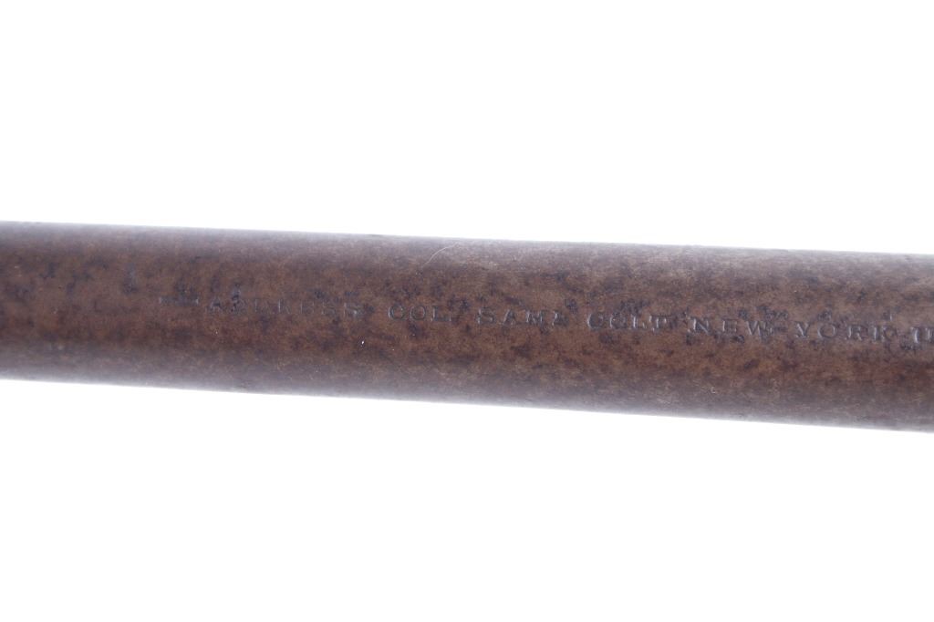 This is a very unusual late-American Civil War production Colt Model 1851 and Colt Model 1861 4-screw shoulder cut out factory revolver chambered in .36 caliber with a serial number of 164127 dating to circa 1863. This unusual example is believed to have been made in this form from the Colt factory with available parts for the U.S. Civil War Union war effort. The revolver shows the 164127 serial number on the frame, brass trigger guard, butt of the backstrap and on the cylinder. The barrel is a 7.5-inch round .36 caliber single line on the top of “- ADDRESS COL. SAML. COLT NEW – YORK U.S. AMERICA –“, with a serial number of 16307 dating to circa 1863 with the “creeping” or ratchet loading lever below (this barrel was only ever offered on the Colt Model 1861). The pistol is factory cut for a shoulder stock on the recoil shield and heel as well as has the long fourth screw in frame, both of which were factory options for the scarce shoulder stocks. Both the barrel, all the marked parts and frame were manufactured by Colt in 1863, during the Civil War. To further the unusual aspects of this firearm the piece does not have a serial number “S” or other designation for being shoulder stock cut and the back strap is solid brass and not steel. The cylinder is correctly factory engraved with a scene of the victory of the Second Texas Navy at the Battle of Campeche on May 16, 1843 by Waterman Ormsby. Cylinder is also marked, “COLT’S PATENT NO. 4127”. Frame is stamped, “COLT’S PATENT” (actually this is double stamped or over stamped) and the brass trigger guard frame is stamped, “.36 CAL”. The inside of the backstrap and inside of the original one-piece walnut wood Colt grips are not marked. One side of the grip has a unique AB or other carved initial or insignia on the right side, possibly from the original solider owner or for their unit. There is the possibility that this is a very scarce late-production Colt Model 1861 and was created using the remaining parts in circa 1873 as the serial numbers do extend to 338843, with only 38,000 1861’s being made. More than likely, this was made in the factory using available parts, in a rush to complete orders for the war effort, making this a truly unusual and scarce example.