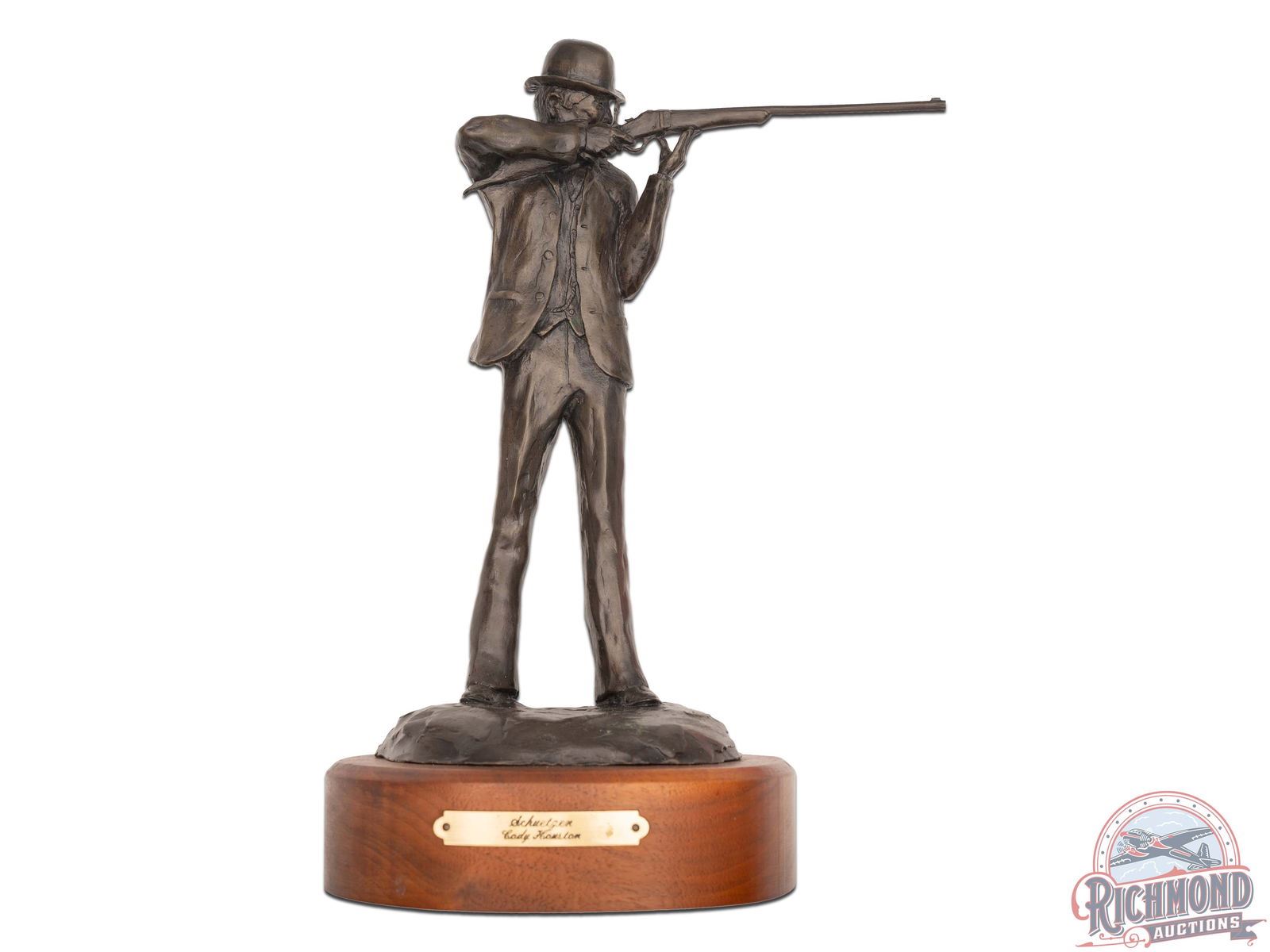 A beautiful depiction of a gentleman focusing on a shot using a Schuetzen rifle. Tilted "Schuetzen", this particular piece is rarely seen on the market. This bronze sculpture by Montana artist Cody Houston, is signed and numbered 7 of 15. Dated 1978. Mounted on a walnut wood base with brass name plate. Measures 12" tall and 8-1/2" at the widest point. Includes hand-written letter from the artist, Cody Houston to the owner, original receipt, and Certification of Authenticity dated 1978. J.T. Livengood Collection.