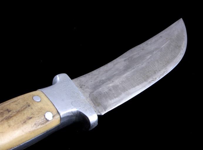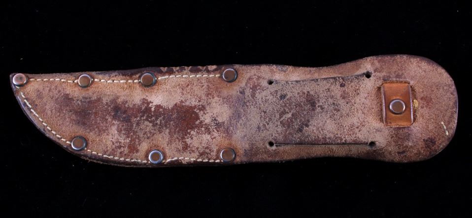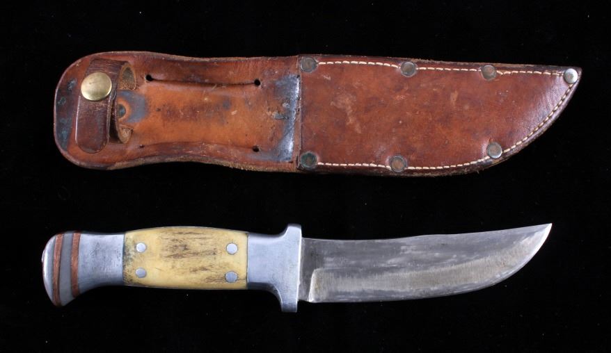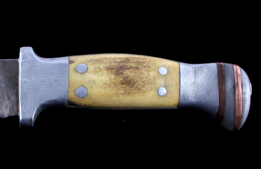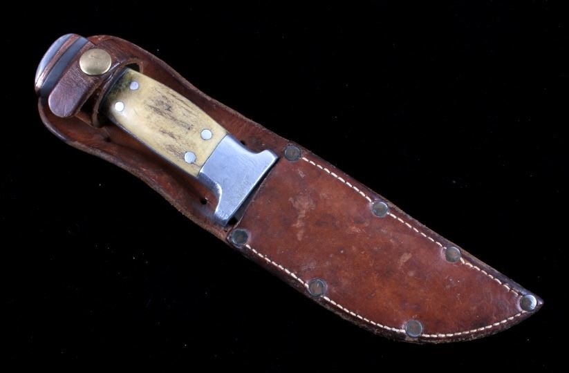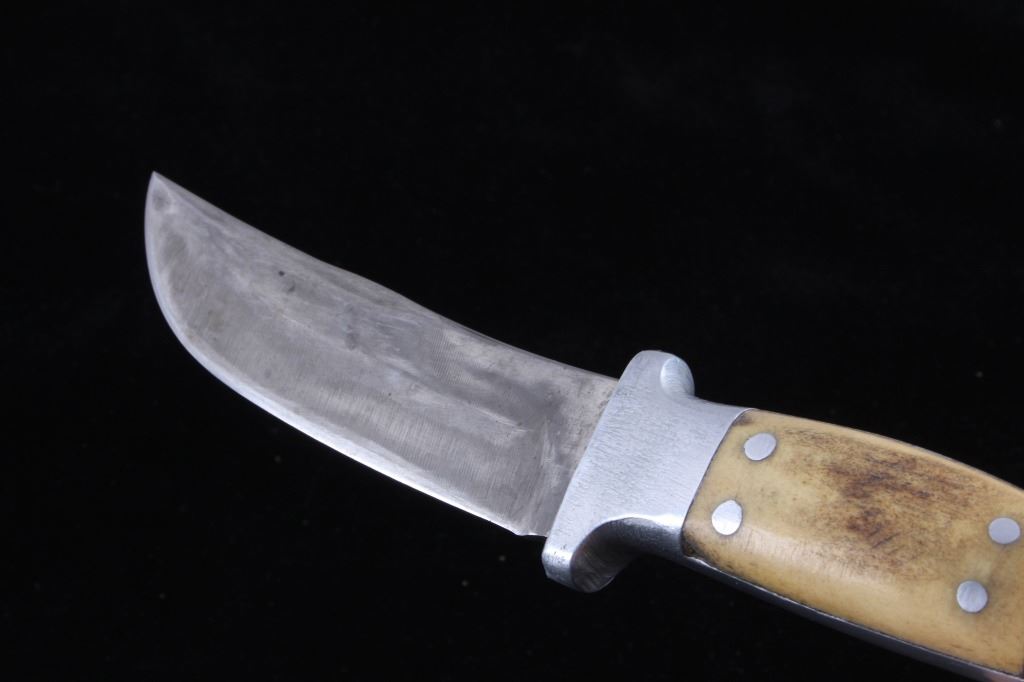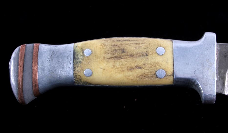 This is a RARE custom made R.H. Ruana knife and leather scabbard. Rudy Ruana began making custom knives in the 1930's. His business has been family owned from the beginning and is still in operation today in Bonner, Montana. Ruana knives are highly regarded and sought after by knife collectors and enthusiasts. This is one of only a relatively few custom knives made by Ruana. It is believed to have been made for Rudy's niece. The knife shows a hardened steel blade with a sweeping curve. The handle is aluminum and is inset with antler grips. The rear bolster features two bands on inlaid copper. The knife is not marked, but has been confirmed and is guaranteed to be Rudy's work made by his own hands. A truly RARE and important piece of Ruana knife making history. The knife comes with the original leather scabbard that is also not marked. This is certainly an early Ruana knife estimated to have been made circa 1950. The knife and scabbard are in good condition. The knife measures 9.75" with a 4.75" blade.
