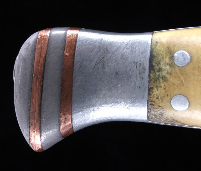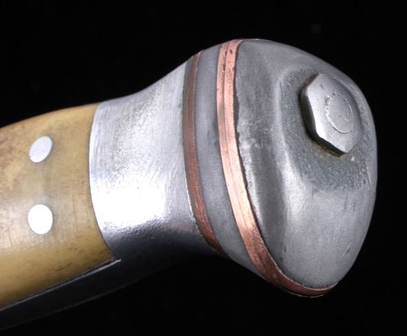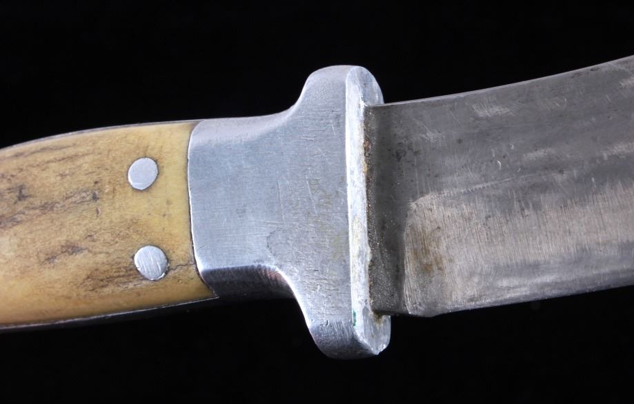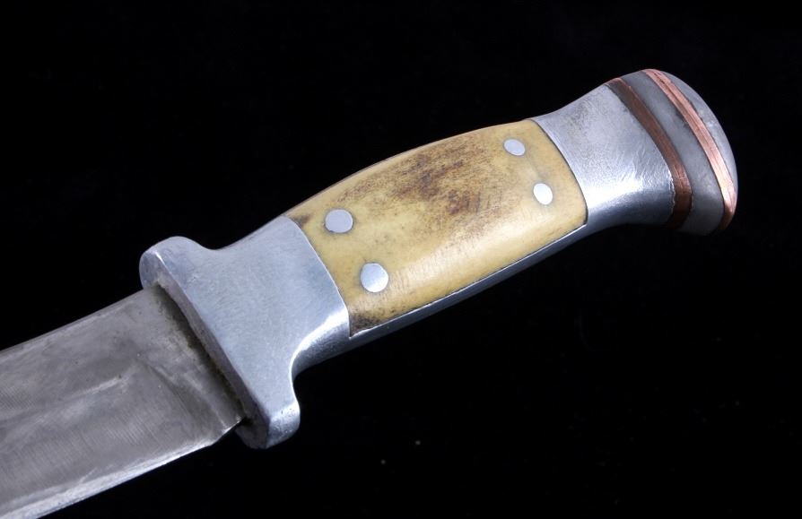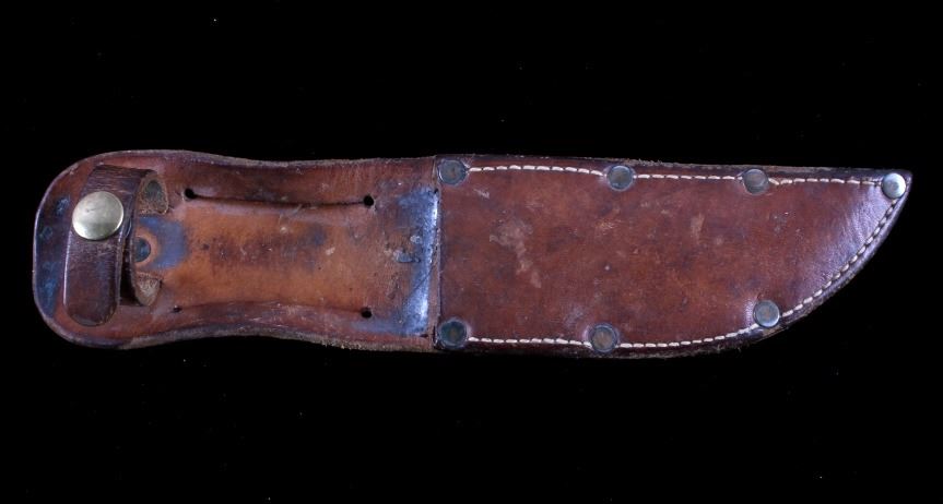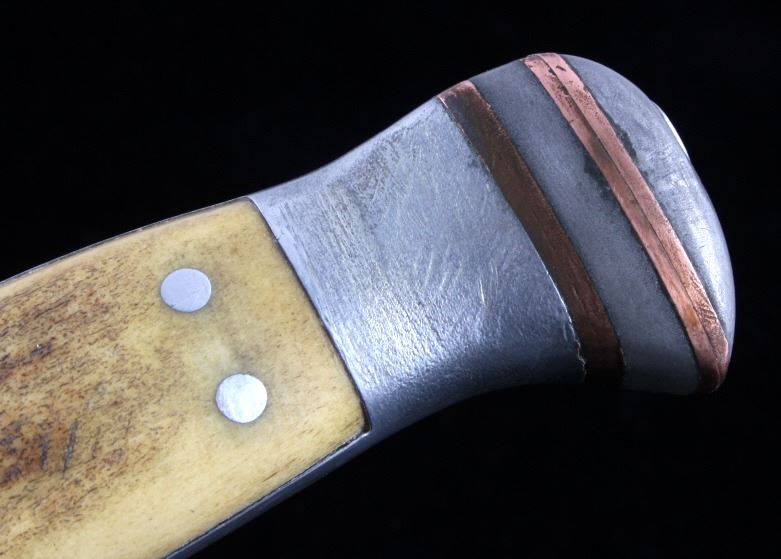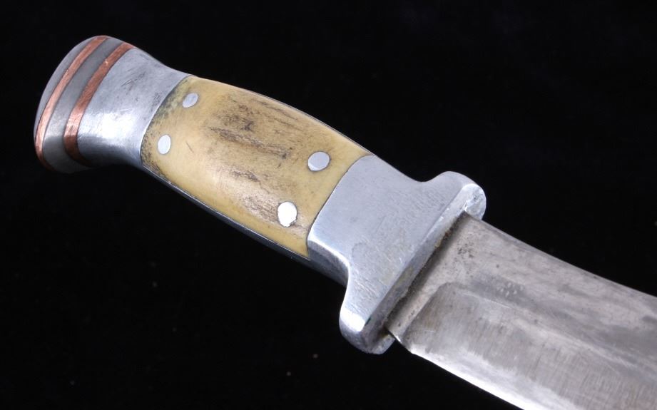 This is a RARE custom made R.H. Ruana knife and leather scabbard. Rudy Ruana began making custom knives in the 1930's. His business has been family owned from the beginning and is still in operation today in Bonner, Montana. Ruana knives are highly regarded and sought after by knife collectors and enthusiasts. This is one of only a relatively few custom knives made by Ruana. It is believed to have been made for Rudy's niece. The knife shows a hardened steel blade with a sweeping curve. The handle is aluminum and is inset with antler grips. The rear bolster features two bands on inlaid copper. The knife is not marked, but has been confirmed and is guaranteed to be Rudy's work made by his own hands. A truly RARE and important piece of Ruana knife making history. The knife comes with the original leather scabbard that is also not marked. This is certainly an early Ruana knife estimated to have been made circa 1950. The knife and scabbard are in good condition. The knife measures 9.75" with a 4.75" blade.