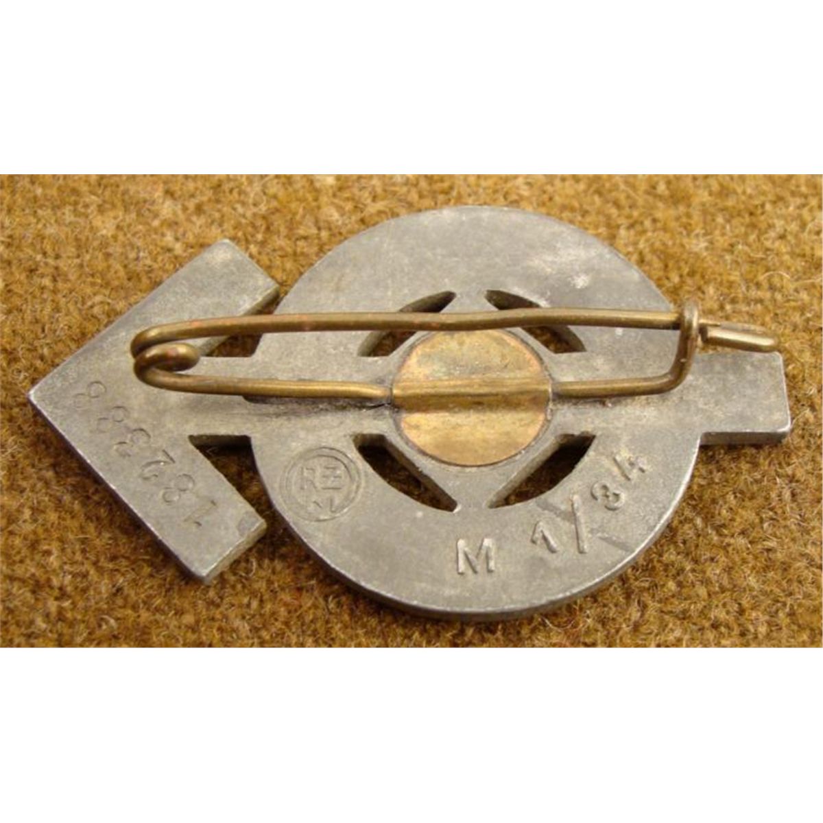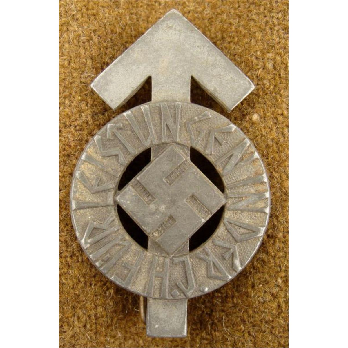 RARE NUMBERED DJ/NAZI DEUTSCHE JUGEND PROFICIENCY BADGE-GREAT ORIGINAL BRINGBACK * HARD TO COME BY "DJ LEISTUNGSABZEICHEN" FOR GERMAN YOUTH FOR "PROFICIENCY" & "ACHIEVEMENT"-EARLY METAL AWARD IS NAMED IN CIRCLE WITH SWASTIKA IN CENTER & AN ARROW POINTING UPWARD-REVERSE IS A LARGE PINBACK-HAND ENSCRIBED NUMBER #132388--RZM AND MAKER MARK "M1/34"--RARE ORIGINAL *