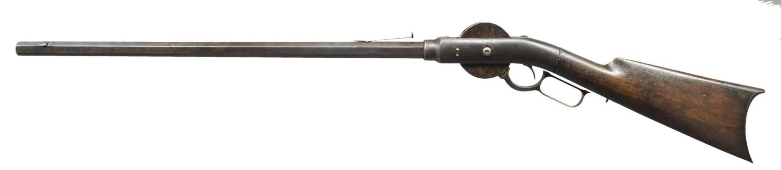 Cal. 42. S# 712. 44” Overall, 25” oct. bbl. marked “ADDRESS / P W PORTER / NEW YORK” & “P.W. PORTER’S / PATENT 1851”. This is the 3rd & last model of turret rifle that chambers pointed in every direction including back at shooter. Chain fires were not uncommon on these early 1850s percussion arms, & it took a brave man to shoot one. This was also one of the earliest lever action firearms. CONDITION: fair-good overall, mostly original & complete, restoration to mechanics, replaced latch, welded repair to lever. Stock is sound w/ heavy wear, large well patinaed chip adjacent to frame. Metal has iron patina, cleaner & smoother where restored. Mechanics need attention, cyl. rotates, but bar hammer will not hold cock. Discernible rifling in pitted bore. (01-21360/JS). ANTIQUE. $2,000-3,000.