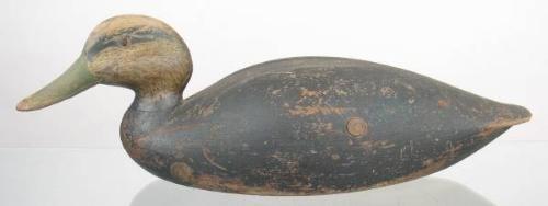 RARE DECOY. Nice early black duck by Ben Smith, Oak Bluffs, Martha's Vineyard, MA. with a turned head and tack eyes. Overall even wear to OP. Knot visible from side to side near the lower front. Rigged for use. Unfortunately few examples of Smith's early black duck decoys have survived. (decoy)