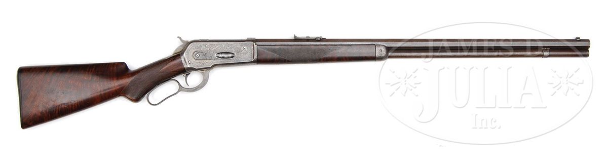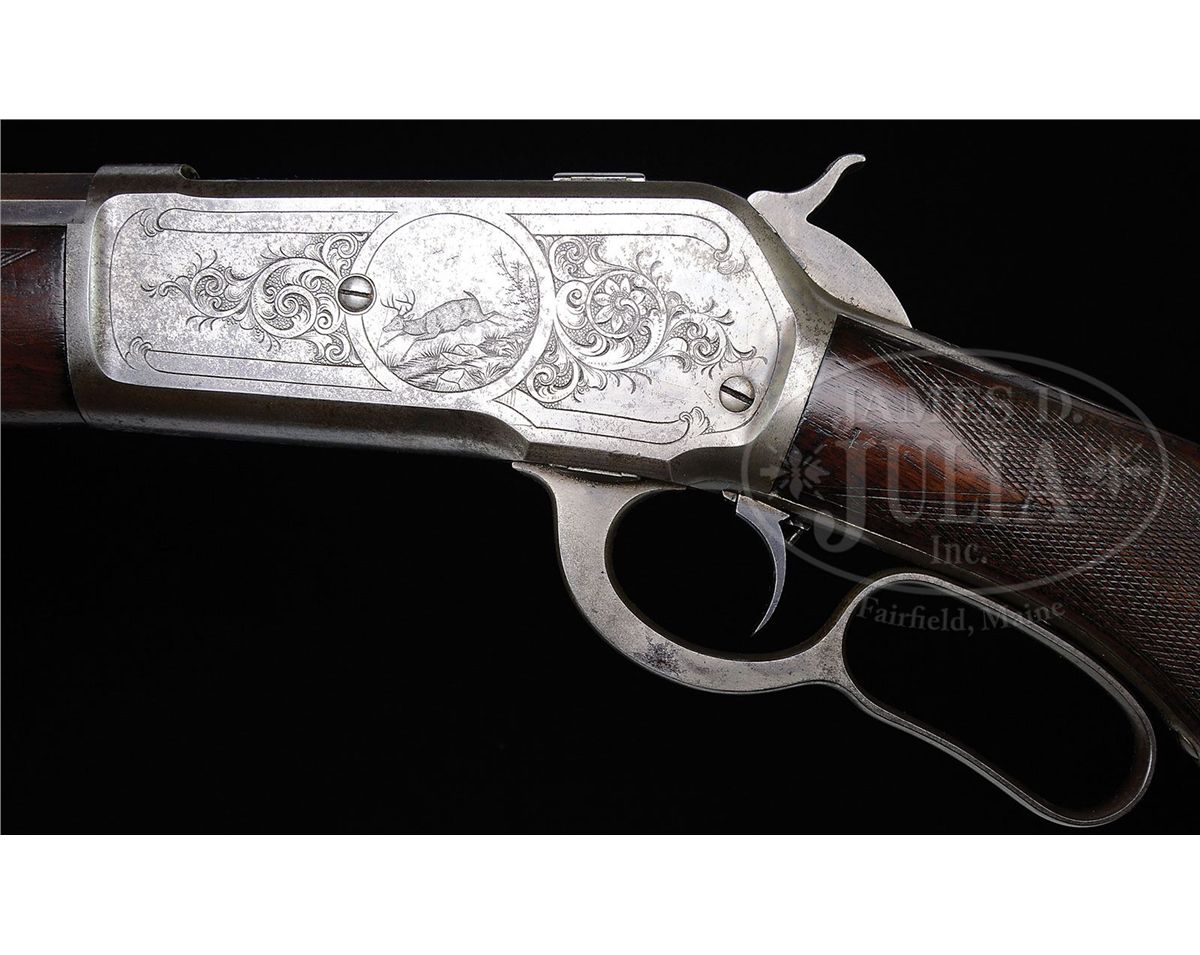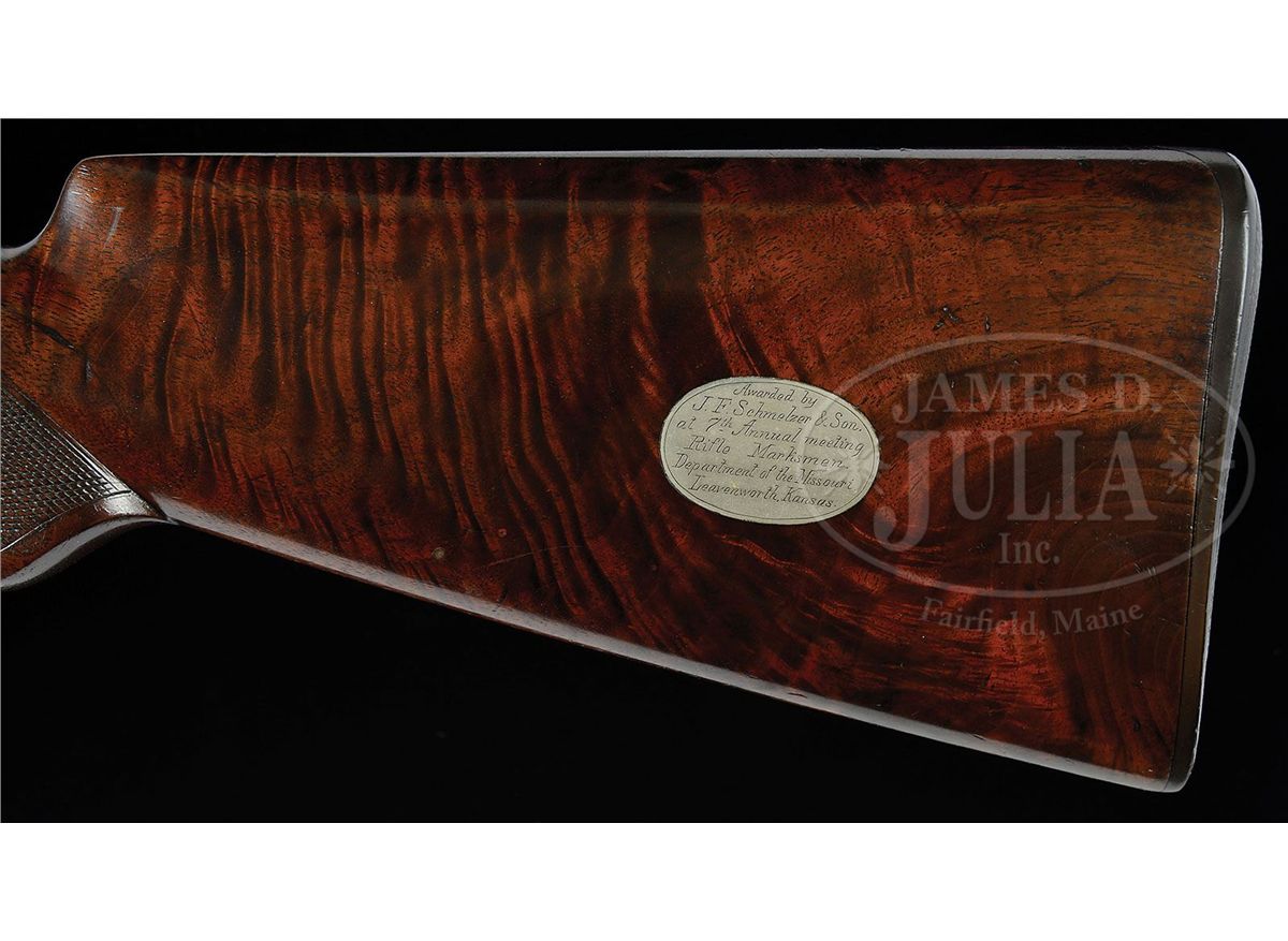 SN 5096. Cal 45-70. Fine deluxe rifle with 28" special order oct bbl, full magazine, half nickel front sight and "1886" marked ladder rear sight. Receiver is engraved, probably by John Ulrich, in Style #10 which includes the rnd vignette of a running whitetail buck on the left side and foliate arabesque patterns on the right side with an unusual serpentine shaped panel of scalloped patterns. Matching patterns of engraving are also found on the top of the receiver ring, bottom of the receiver, top tang and each side of the forend cap. Receiver has a sgl set trigger. Left side of the tang, under the wood, is marked with the assembly number "378", "XXX" and "RB". Mounted with very highly figured, center crotch, flame grain American walnut with H-style checkered forearm and black insert serpentine grip buttstock with full checkered hard rubber buttplate. Left side of buttstock is inlaid with a 1-9/16" oval silver plaque inscribed "Awarded By / J.F. Schmelzer & Son, / At 7th Annual Meeting / Rifle Marksmen, / Department of the Missouri / Leavenworth, Kansas". This rifle was won by 1st Lt. Augustus Canfield Macomb of the 5th Cavalry in August of 1887 as a shooting prize in competition with the Dept. of the Missouri military officers & enlisted men. Macomb was born Oct. 1854 in Detroit and died 1932, having retired from the Army as a full Colonel. He was a graduate of the U.S. Naval Academy in 1876, became a 2nd Lt. in the U.S. Army in 1876 and became a full Colonel in 1914. He served with the 4th, 5th, 9th & 14th Cavalry Regiments during his career and participated in the Crow Indian Campaign 1878, the Northern Cheyenne Indian Campaign in 1879, the Ute Indian Campaign 1879, Puerto Rico & the Philippines and in Mexico in 1916. For a period he was assigned to Fort Huachuca, Arizona and was Commander of the Dept. of Arizona and played a key role in subduing the Apache Indians in Arizona. Accompanied by copies of several period newspaper pages, including one from the Leavenworth Times of Aug. 19, 1887, which lists the shooting team for the 7th Annual Rifle Competition wherein 1st Lt. Macomb of the 5th Cavalry finished second with a score of 465. Lt. Macomb was at one point assigned to Fort Niobara, Valentine, NE, and his son was born there as reported in the Valentine Reporter of Nov. 20, 1883. He is also mentioned in other newspaper articles from around that time. Col. Macomb died Jan. 2, 1932 and is buried in Arlington National Cemetery. The Leavenworth Times of Aug. 20, 1887 reported that Lt. Macomb of the 5th Cavalry "won the Budlong Gold Medal and the Winchester Sporting Rifle given by Messrs. J.F. Schmelzer & Son, of this City". It goes on to describe the Budlong Medal. Also accompanied by a printout regarding the Schmelzer Company. Also accompanied by a Cody Firearms Museum letter which identifies this rifle in caliber 45-70 with 28" oct bbl, set trigger, checkered stock with pistol grip, $2.00 engraved, "plate in stock" and rubber buttplate received in warehouse June 2, 1887 and shipped two days later to Order #18595. Deluxe & engraved '86s are occasionally encountered with presentation examples quite rare, but a well-documented presentation '86 is extremely rare. PROVENANCE: Barnes Family Collection. CONDITION: Good to very good. Bbl & magazine tube retain faded blue in sheltered areas being mostly a light blue/brown patina with scattered spots of discoloration, a few nicks & dings and a repaired dent in the magazine tube; receiver, lever & hammer retain silvered case colors with some smoky colors in the most sheltered areas on the receiver. Wood is sound showing moderate to heavy wear and retains strong orig varnish with light nicks & dings. Mechanics are crisp, strong bore with good shine & scattered pitting. 4-47651 JR210