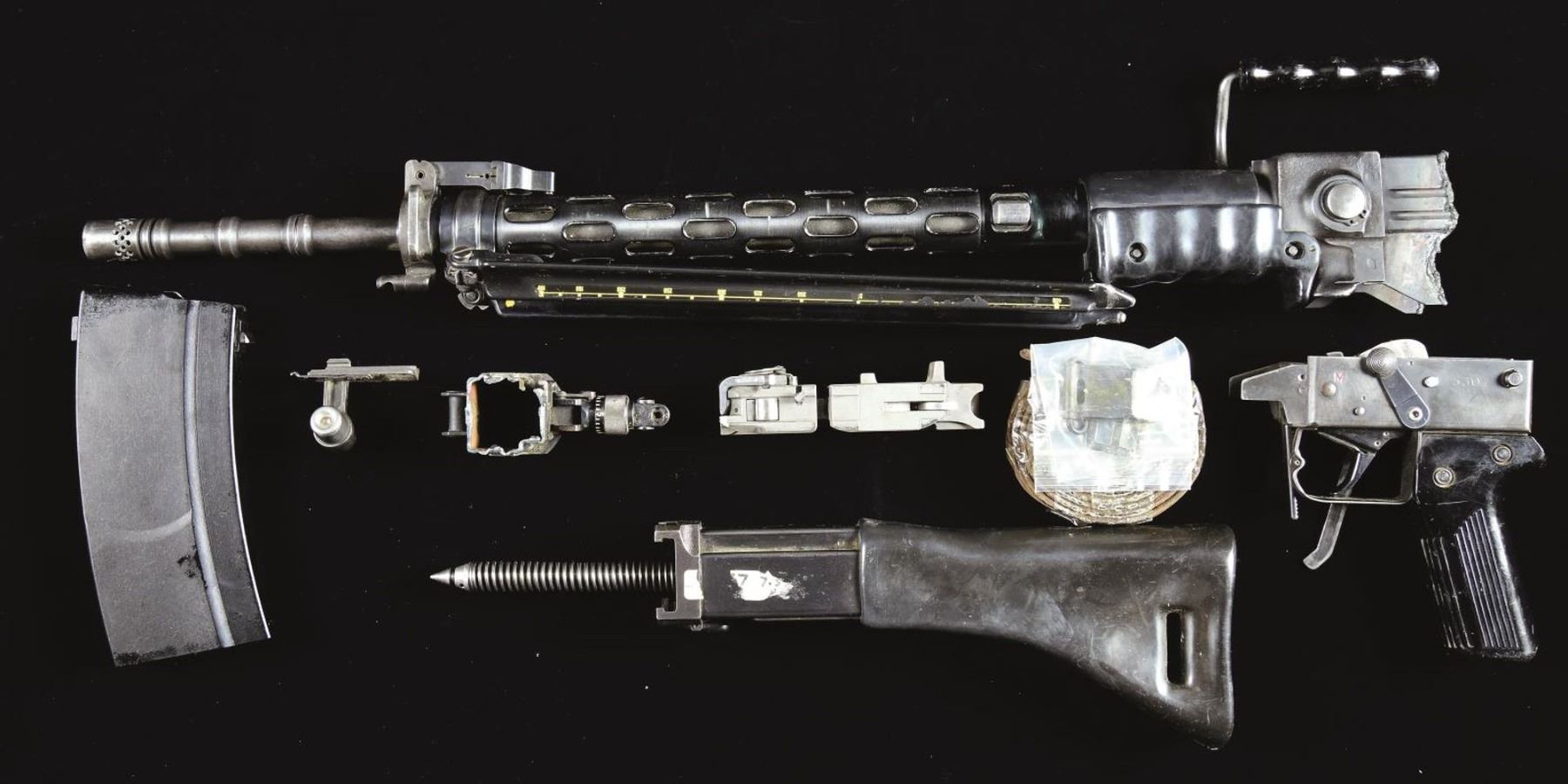 MACHINE GUN PARTS KIT. Extremely desirable Stgw. 57 parts kit consisting of: bbl., bbl shroud, front sight assembly, bipod, carry handle, bolt assembly, charging handle, trigger housing, buttstock, rear sight assembly, 1 24-rd. mag., as well as a brown leather sling. All serialized components are matching and include the forward torch cut portion of the receiver (above chamber), bbl. shroud, bolt assembly, trigger housing, as well as the buttstock socket. CONDITION: metal components retain the majority of their original arsenal finishes, exhibiting areas of wear and thinning, scattered marks from handling and storage, as well as some areas of oxidation. Mirror bore, exhibiting some scattered spots of light to mild pitting, while retaining well defined rifling throughout. Black rubber forend is very good overall. A very nice, all matching, example of a seldom encountered SIG Stgw. 57 machine gun parts kit. PROVENANCE: Lifelong Collection of Terrance McCarty. (02-21807-3/MLW). $1,500-2,250.