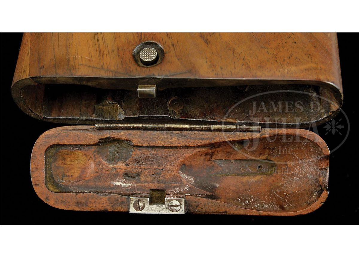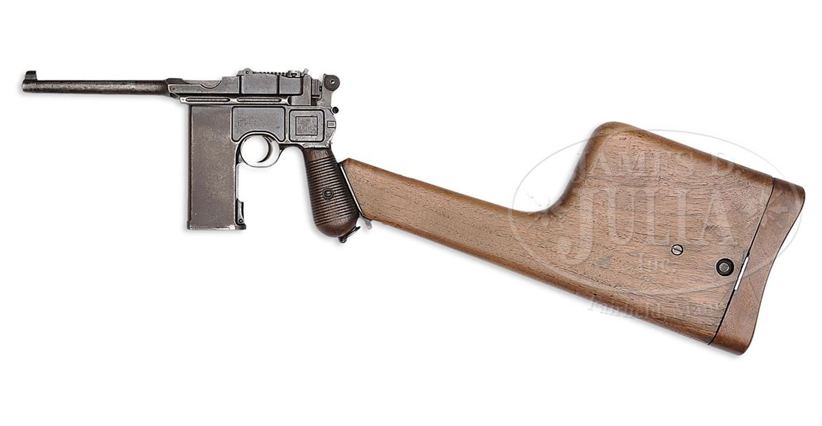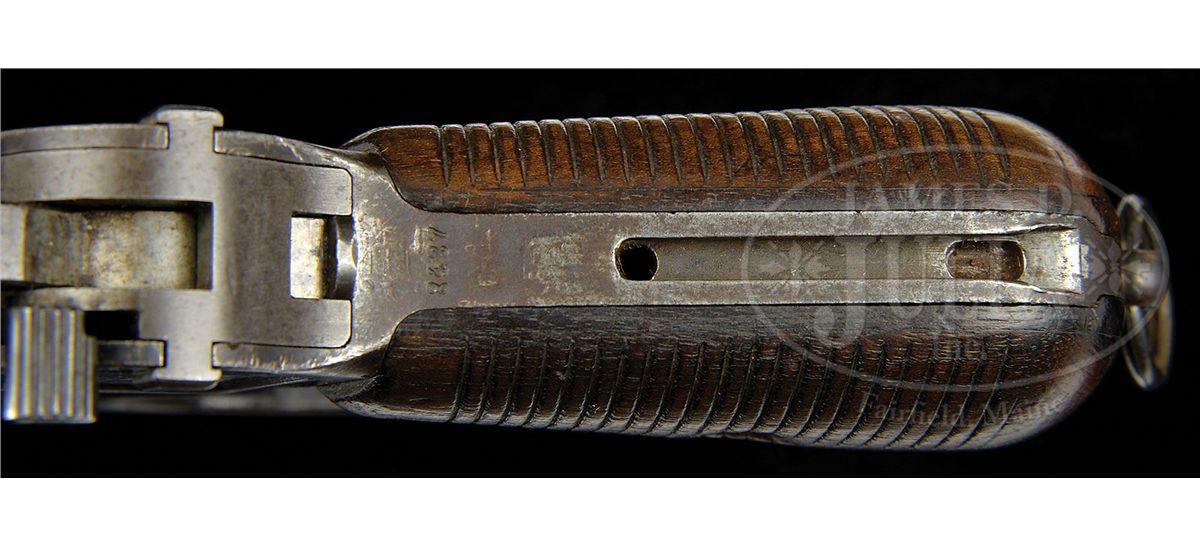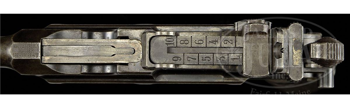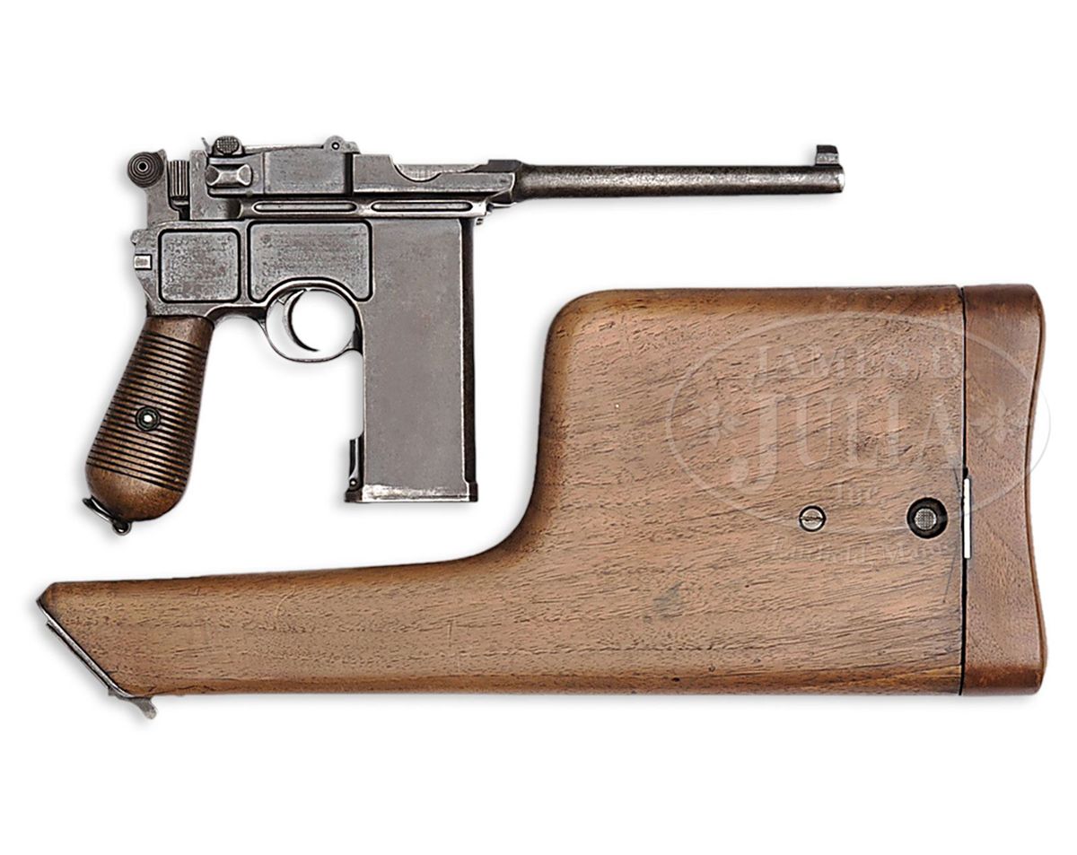 SN 8437. Caliber 7.63mm. One of just a handful of 20-shot pistols in a very well established and narrow serial range clustered around 84XX. This gun has a 5.5" bbl and a pinned 1-10 rear sight. Usual Mauser address on the chamber. Crown U mark on the left side of the bbl extension and an antler proof on the right. The only marking on the frame is the serial number on the backstrap just below the locking lever. Standard Conehammer features include a bolt with a long extractor and an independently secured firing pin. Detailed disassembly shows all matching numbers (including the firing pin) and standard serrated grips, each marked with the full serial number of the gun with no recesses. Original lanyard ring. Accompanied by an original stock with a matching lug that still has the original and entirely correct plunger. PROVENANCE: Joseph J. Schroeder, Jr. Collection. CONDITION: Untouched 20-shot with approximately 20-30% blue in protected areas, largely the back portion of the bbl extension inside the frame recesses and inside the trigger guard. The balance has turned to a mellow patina with more advanced etching on the front and backstrap. Comparable oxidative loss has turned the small parts, that were originally fire blued, to gray. Worn bore with no discernible rifling amidst oxidative loss. Original grips with well delineated serrations whose wear is commensurate with the balance of the gun. Shoulder stock has been lightly sanded and a section carefully inserted in the spine just over the rear sight. Around the insert are several hairline cracks just to the left of the hinge, the largest measuring 6.5". Original stock lug, factory matched to the gun, is heavily oxidized and retained by a replacement screw that does not reach to the upper arm of the lug. Extensive oxidation involves the hinge that now has an etched gray-brown surface. The special tensioning spring and securing screw inside the uncracked lid are missing. Though this 20-shot has seen considerable use the gun is original in every respect and the refurbishment directed at the stock should not be seen as a detriment. There is no doubt that 20-shot rigs are amongst the most desirable ensembles ever assembled by Mauser. 4-48556 LMA37