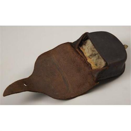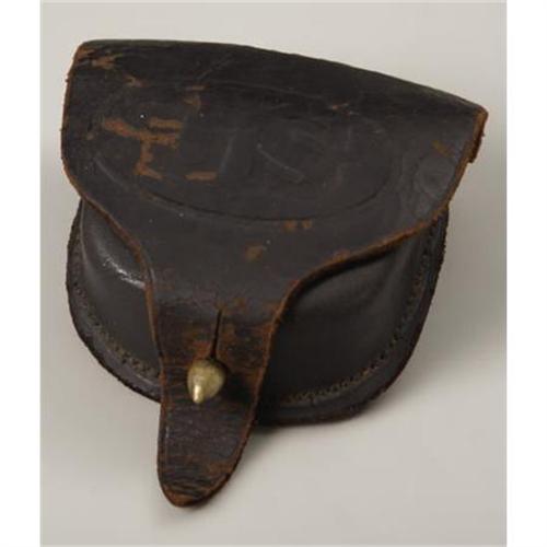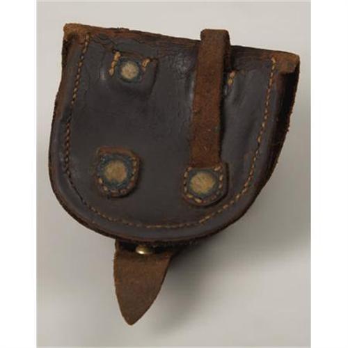 <B>RARE & DESIRABLE INDIAN WAR VINTAGE PISTOL CARTRIDGE BOX</B></I> - This is the very first pattern pistol cartridge box manufactured by the U.S. government to accompany the newly adopted Colt single action cavalry revolver, circa 1873. These rare cartridge boxes were actually modified Civil War cap boxes. Modifications included: embossing the outer flap with a large 'U.S.' within an oval, removal of inner flap and/or modifying the inner flap to form adjacent ears on the inner box to help retain the loose .45 calibre cartridges. Most of the sheep wool inner lining is intact. These early U.S. military pistol cartridge boxes have always been eagerly sought, but seldom encountered.<BR><BR><B>Condition:</B></I> Distinct U.S. in oval. Supple leather, but once again need treating with a leather preservative. One belt strap on reverse missing. Remaining strap reduced by wear.<BR><BR><b>Shipping:</b> Miscellaneous Collectibles, Smal (<a target="_blank" href="http://www.heritageauctions.com/common/shipping.php">view shipping information</a>)