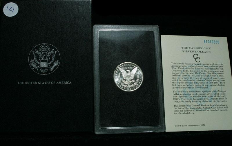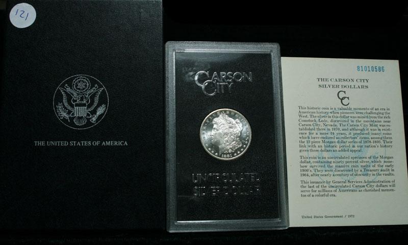 A rare GSA DMPL 1881-cc Morgan. This is both a much scarcer date and an exceeding rare GSA DMPL coin. WOW! This example comes in the original Box and the COA. VERY RARE After the US Government audited its vaults in the mid 70's they found a Hoard of Morgan Dollars in the basement vault in the federal reserve. Between 1973 and 1980 the Government Services Administration (GSA) Packaged these rare Morgan dollars and auctioned them off to the public. The Wholesale Greysheet lists a regular 1881-cc in ms64 DMPL, that means not a GSA, at $1100. Estimated Value $1500